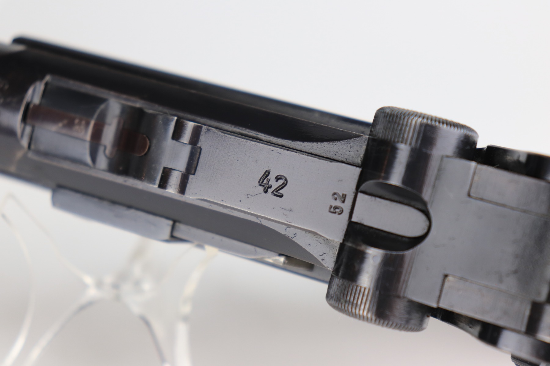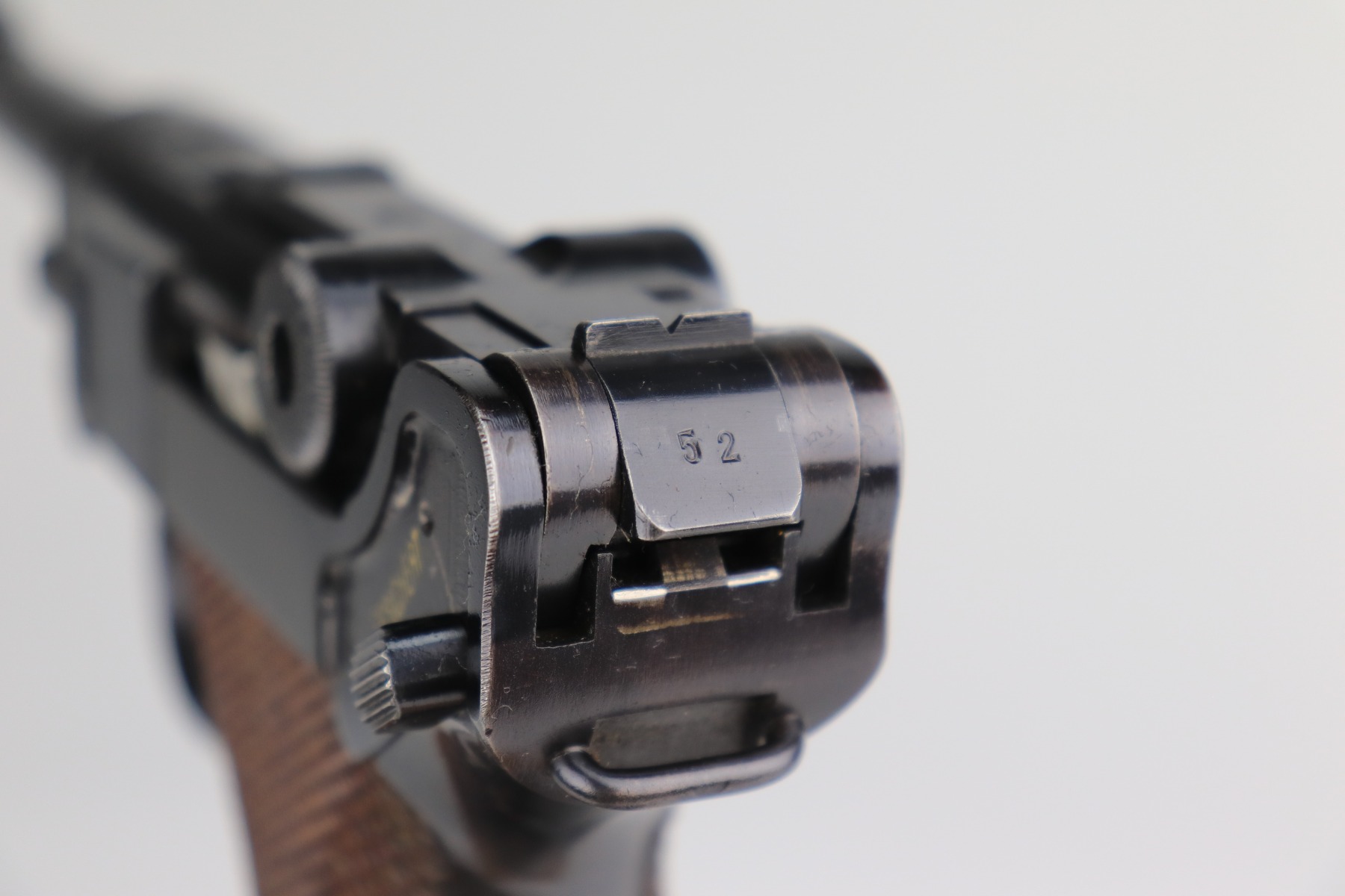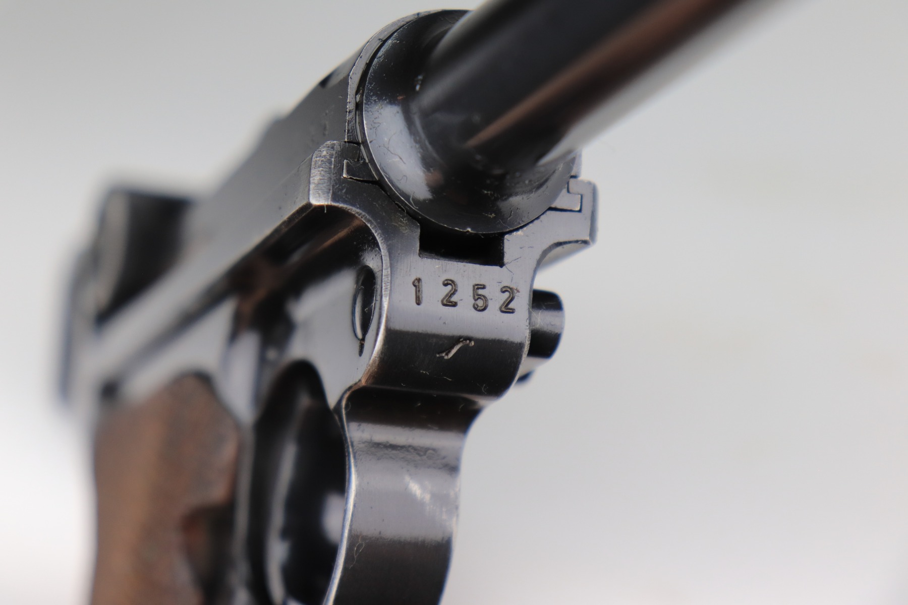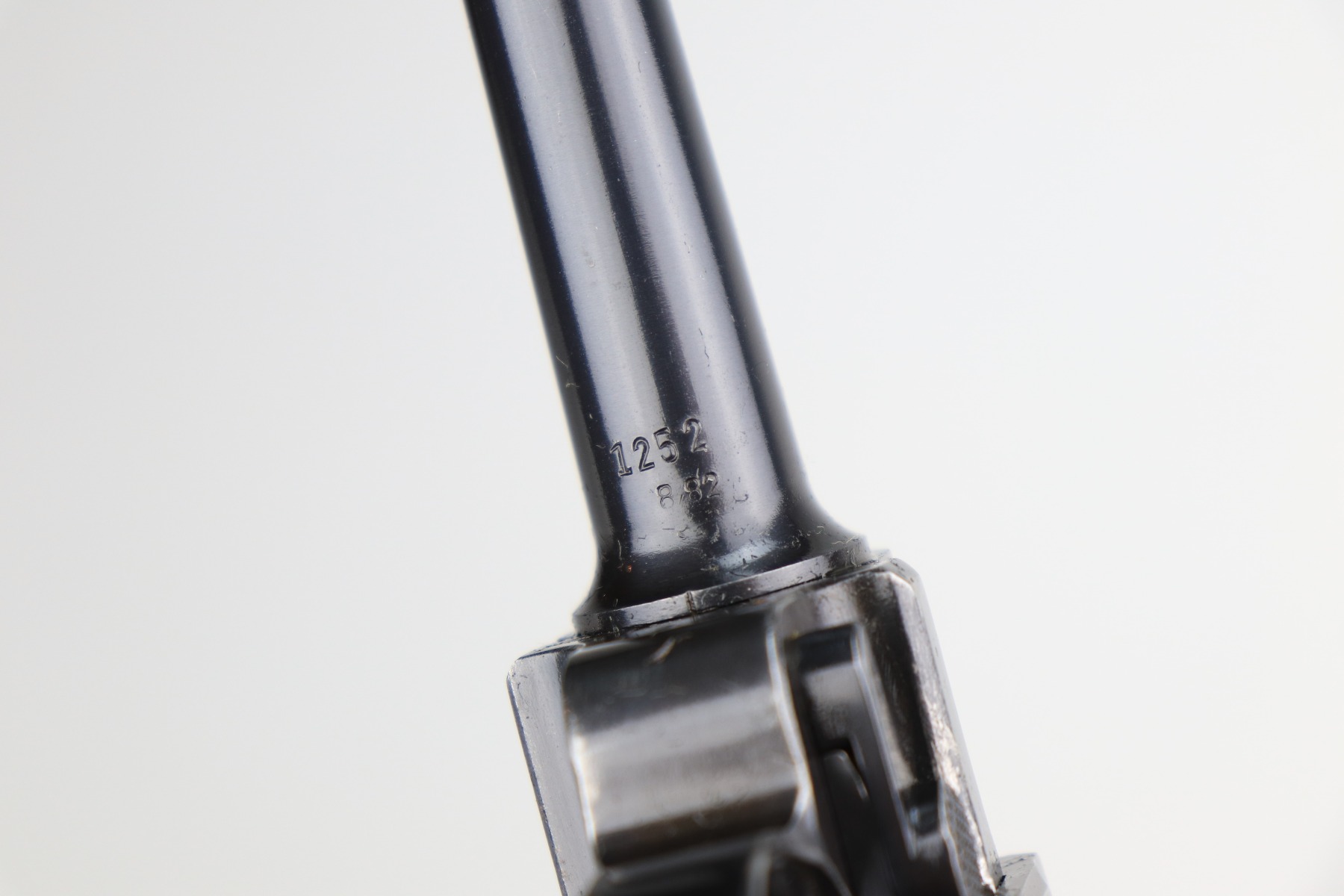 1/11/21 – This is an excellent example of a Mauser Luger issued to the Nazi military in 1939. This one is all matching and has the proper “Eagle 63” military proofs. It has retained about 95-96% of its original finish. There is minor wear around the muzzle, side plate, and high edges of the slide. There are a few small spots of wear and very minor thinning on the back strap. Unfortunately, someone scratched their name into the front strap. It comes with excellent un-numbered grips and a mismatched period-correct magazine. The bore is very nice – shiny with strong rifling and areas of minor freckling.