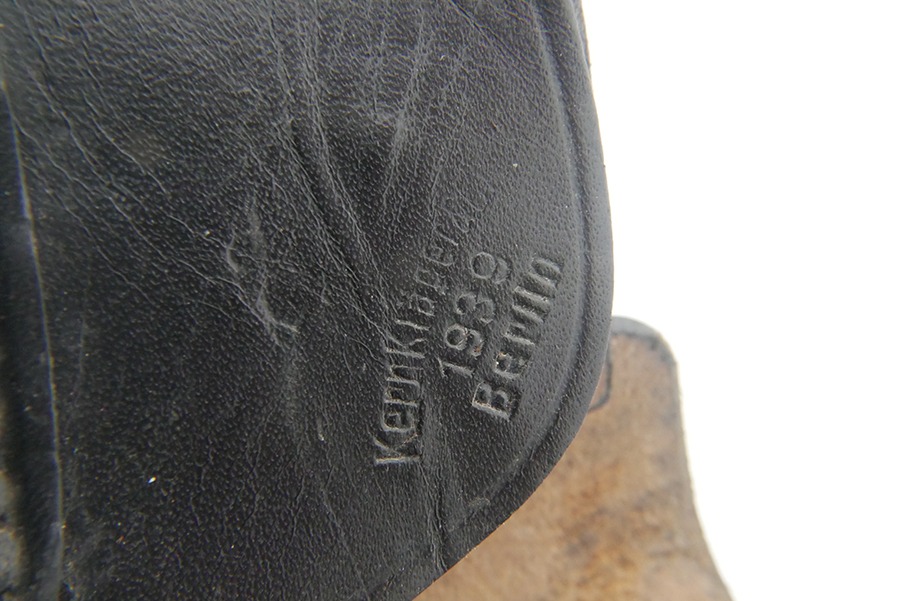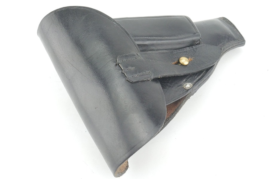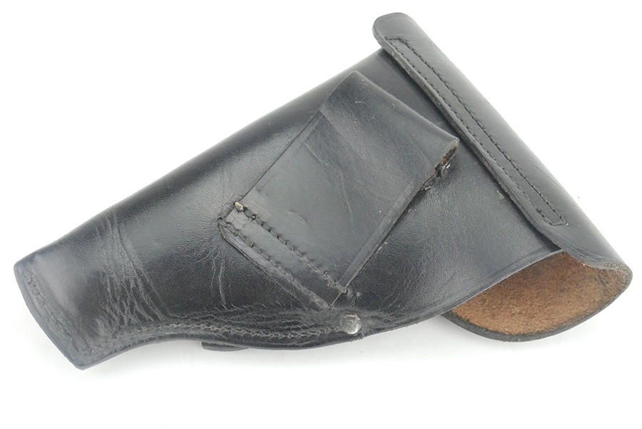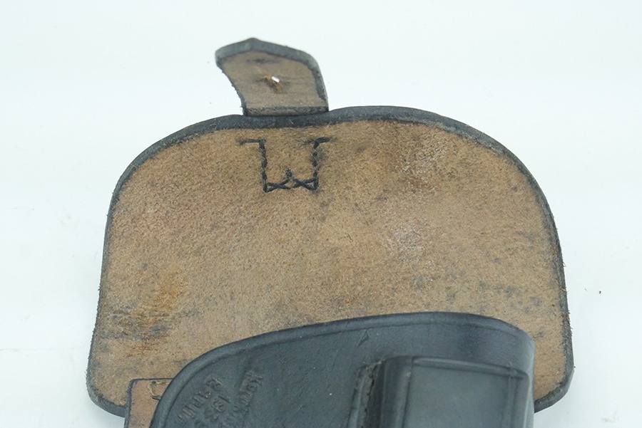 11/21/24 – This is an excellent condition 1939 Kern Klager Police style 7.65mm holster. The leather on this holster is in excellent condition and remains soft. The stitching is still strong and intact. This holster was designed for 7.65mm pistols such as the Sauer Behorden. The holster is maker stamped, “KernKlager Berlin” as well as date stamped “1939”. There is a really faint eagle stamp still present as well, that is hard to see, but still there. This holster has the correct brass closure knob as well for an early holster.