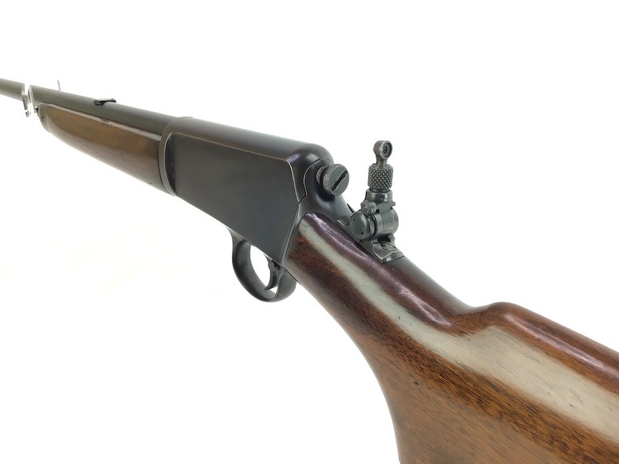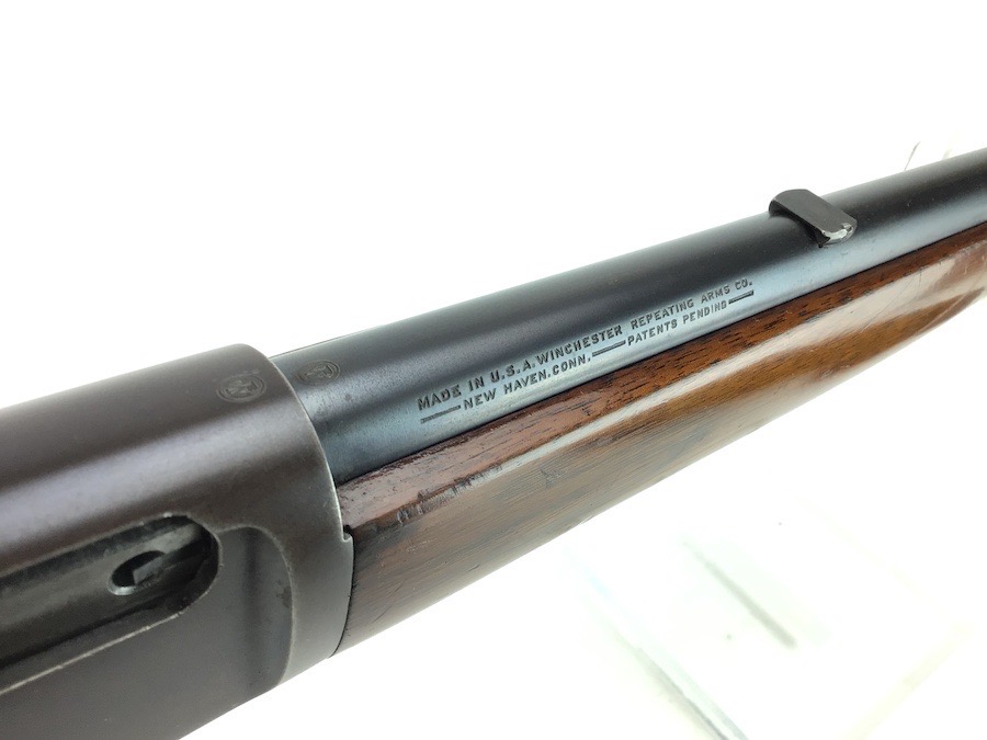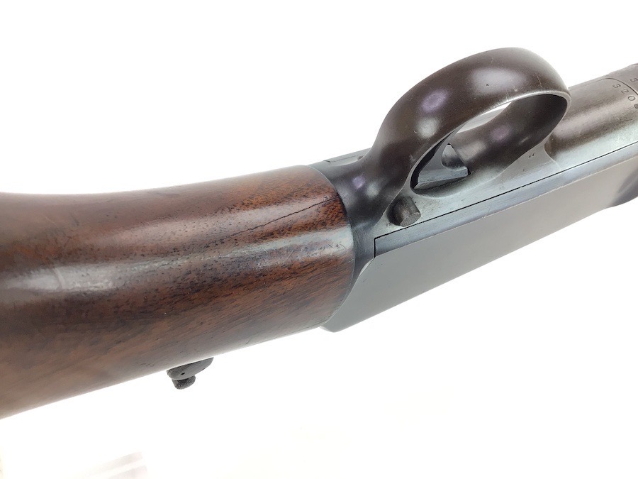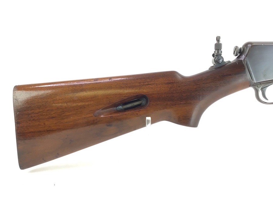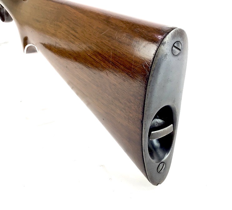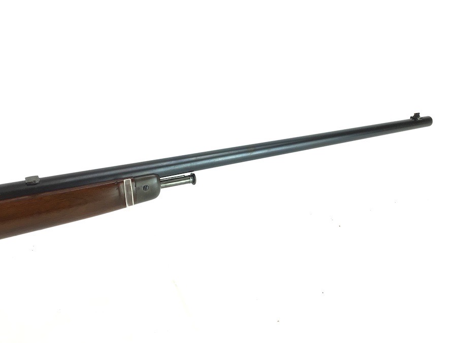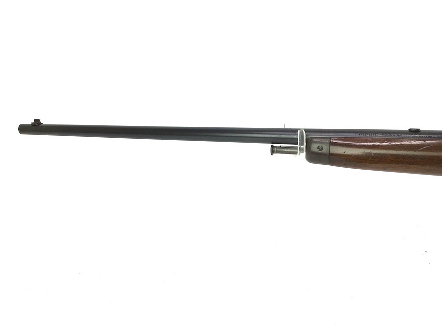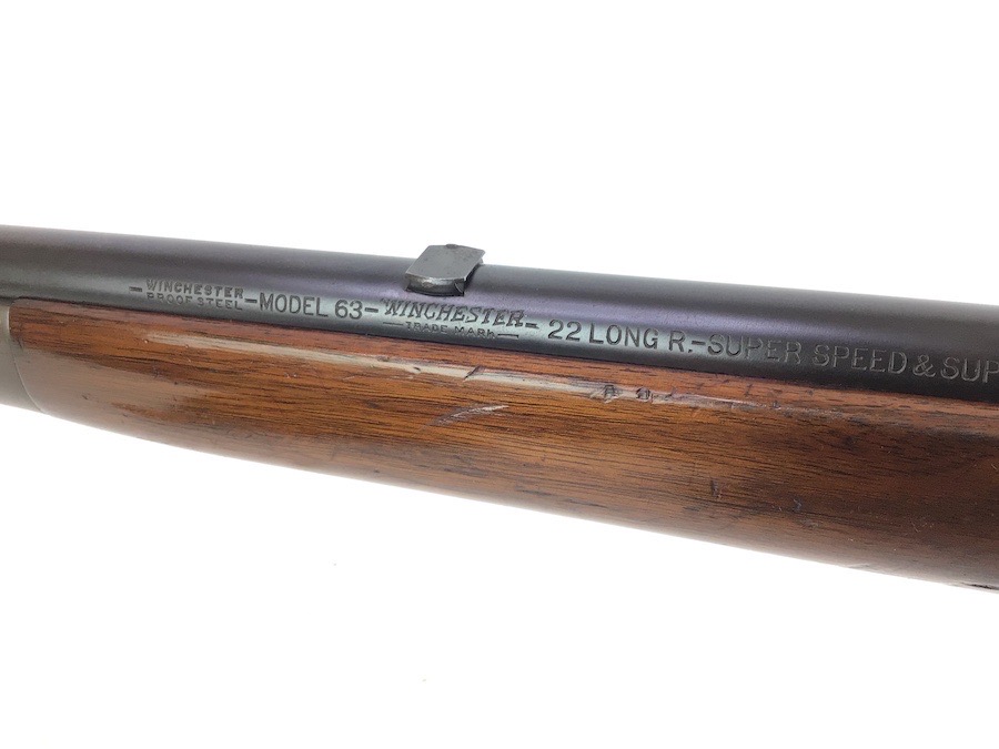 3/11/24 – This is an excellent example of a Winchester Model 63 manufactured in 1939. Chambered in .22 LR. It is all matching and has retained about 97% of its original finish. The rifle features an original rear, tang peep sight. There is just some minor wear on the high edges of the receiver, as well as some use wear around the trigger guard. The wood stock is in excellent condition with minor use wear. The photos show a very minor hairline crack just behind the trigger guard, however, there is no looseness or wiggle. Very minor.