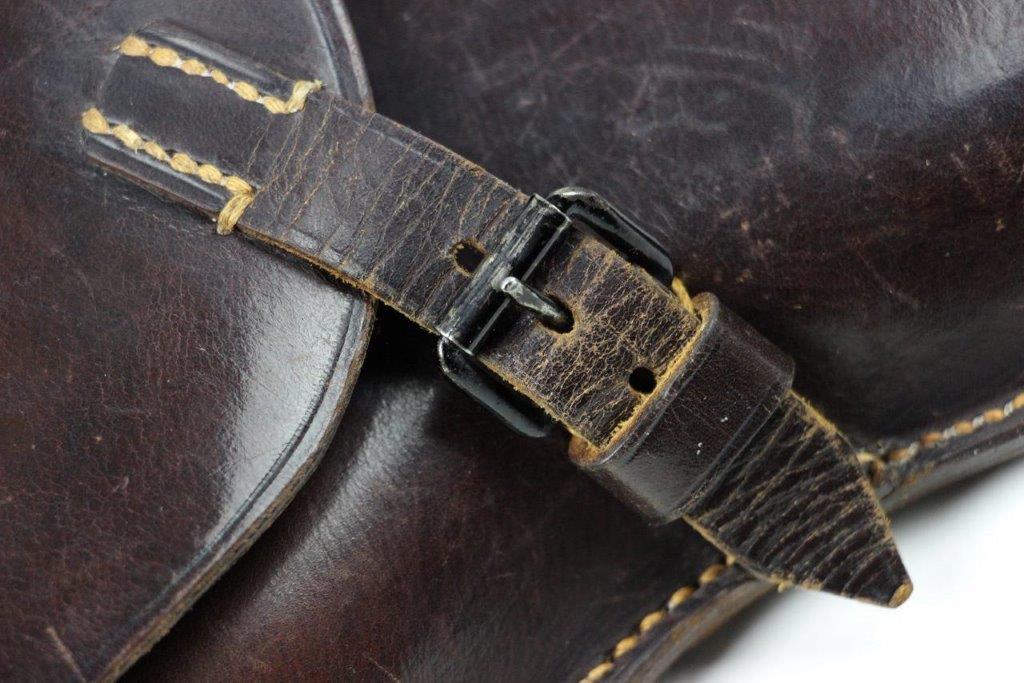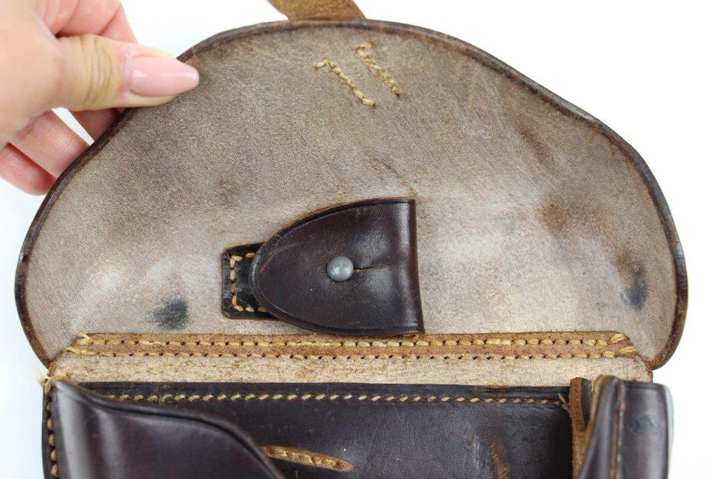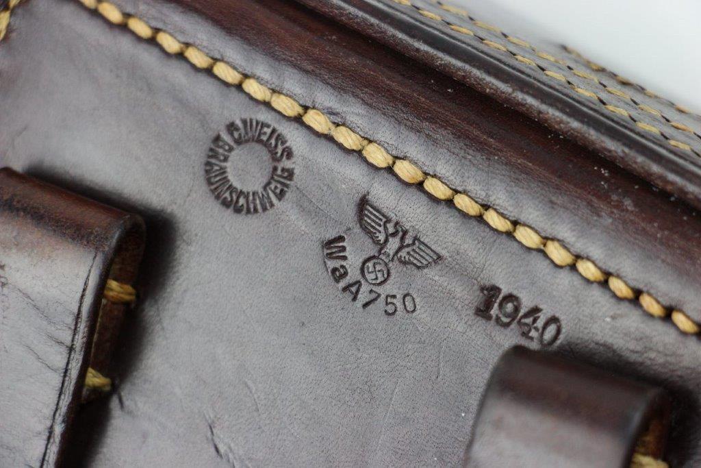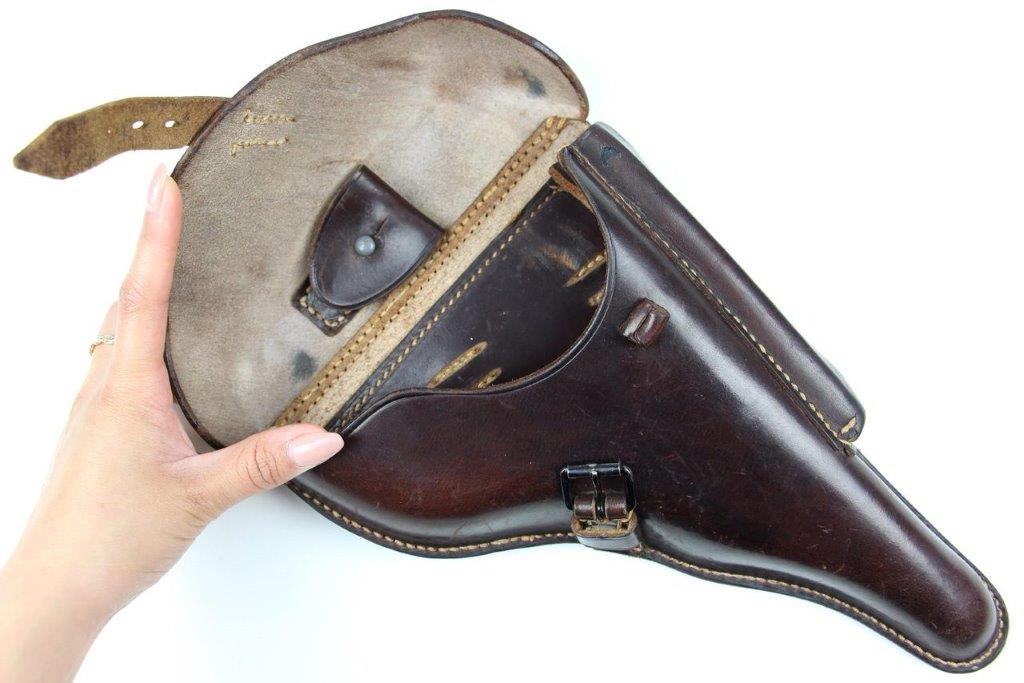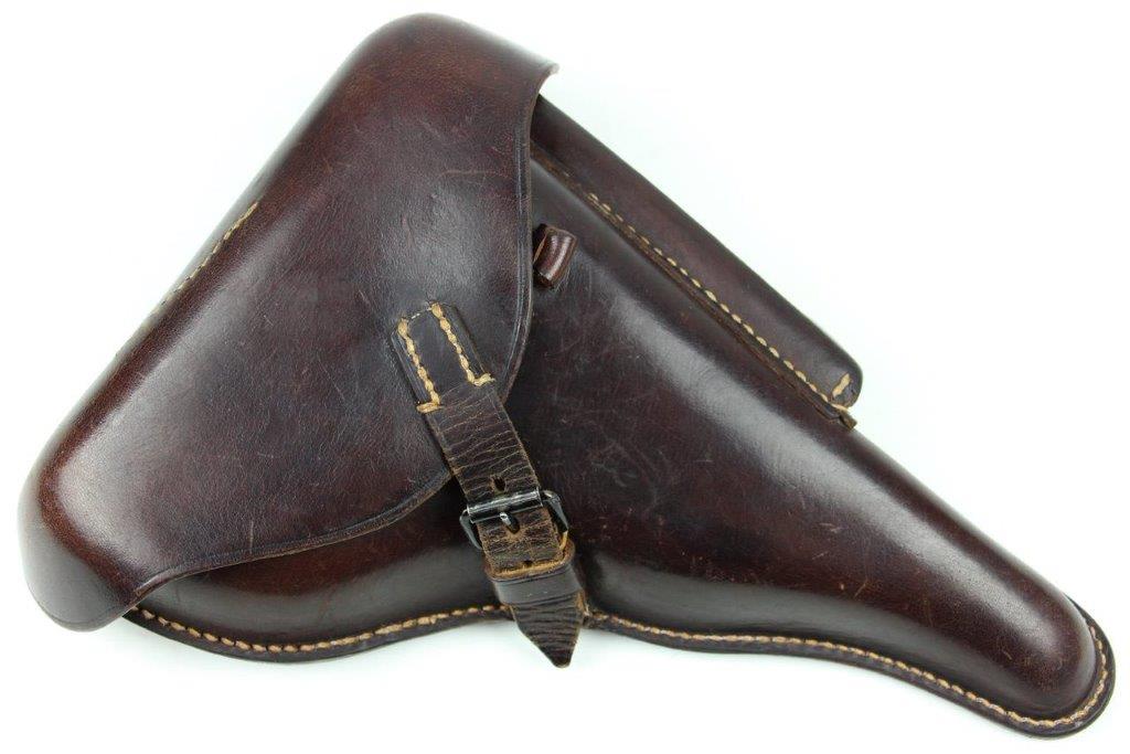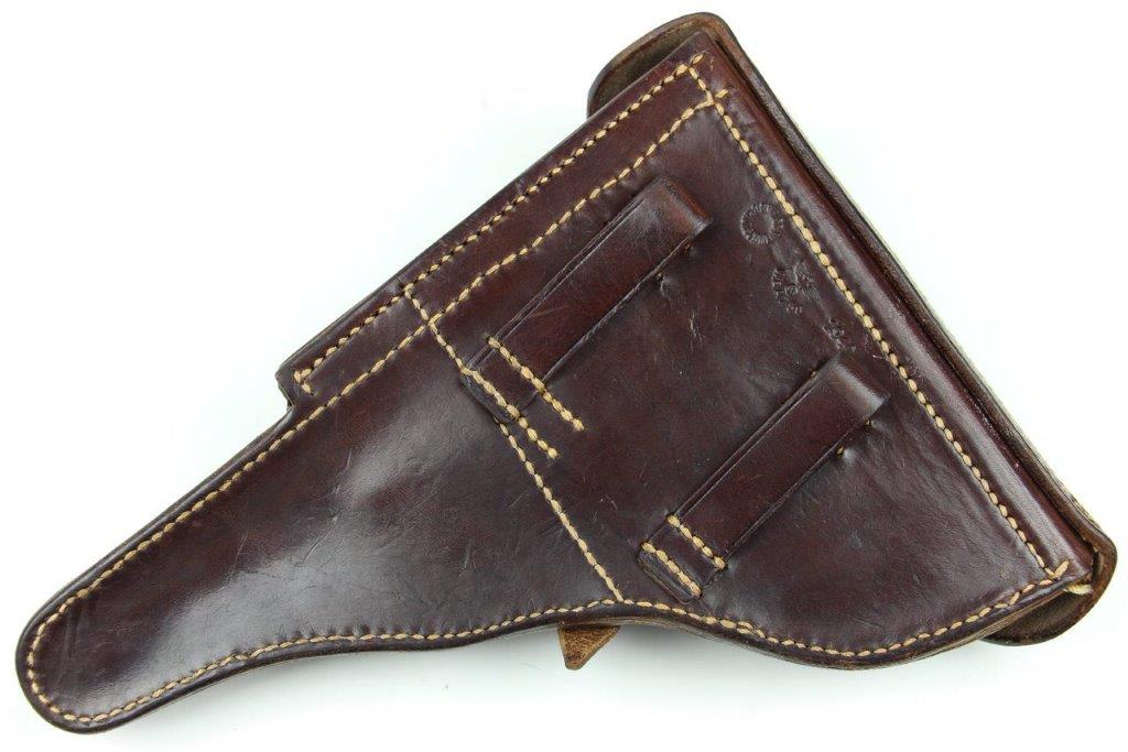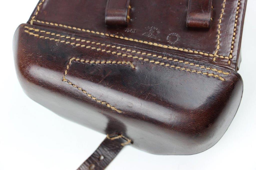 4/15/24 – This is an original 1940 dated Luger holster from WW2. The holster is in excellent overall condition and a high-end example for collectors. The back of the holster is stamped with a crisp, strongly struck maker stamp, waffen military proof, and 1940 date stamp. The exterior brown leather has normal pliability and natural softness without sacrificing structural integrity or losing shape. The leather is clean on the exterior with minimal blemishes and surface wear. The interior leather is crisp and clean. Beautiful, all original and tight stitching throughout. A hard-to-upgrade example!