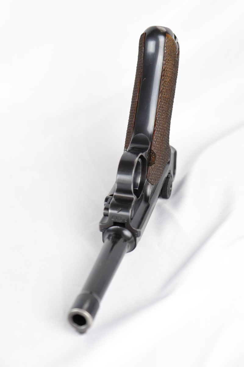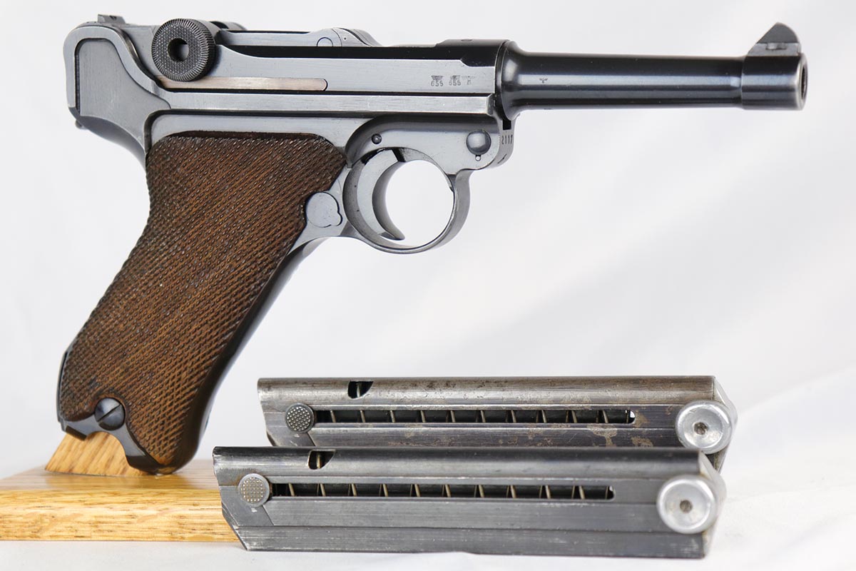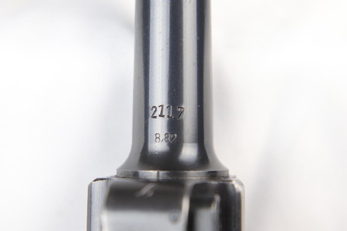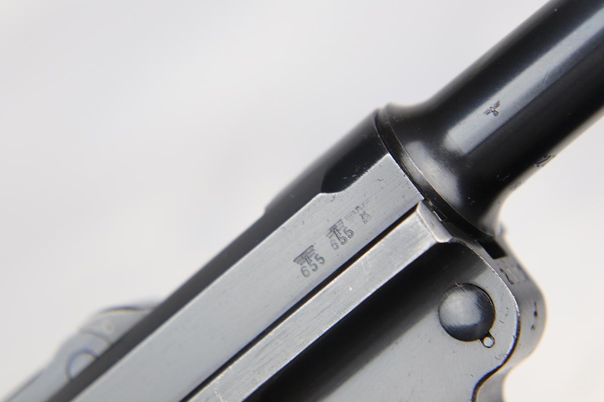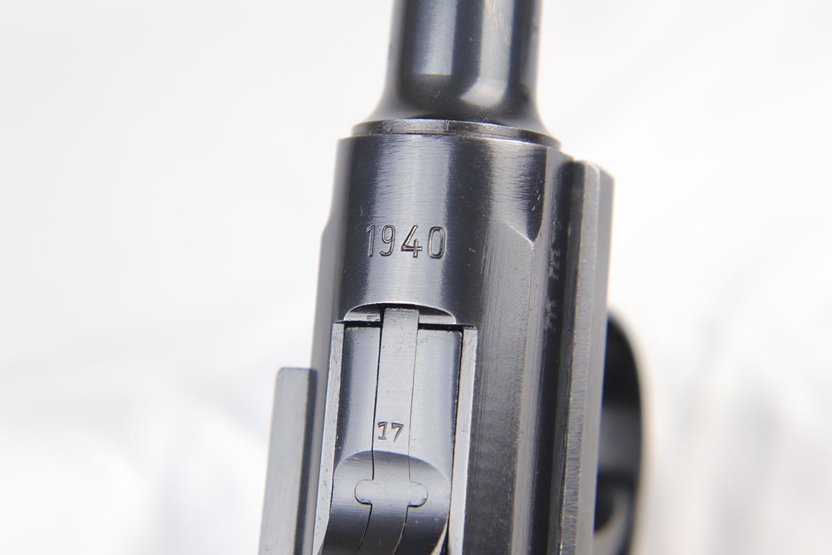 5/24/18 – This is an excellent example of a complete Mauser luger rig with 1940 dated pistol, and includes a 1939 dated holster, spare magazine and tool. The pistol is all original and matching, excluding the magazine. The bluing rates at 96-97% with finish loss on the muzzle and sideplate, likely from the holster, as well as another spot on the bottom of the front strap. The grips are E/655 proofed but not numbered. The holster is in excellent condition and is 1939 dated with waffen proof and maker mark. The tool is E/655 proofed as well, and the spare magazine is an fxo 37 that is numbered to a different luger. Pistol has an excellent bore.