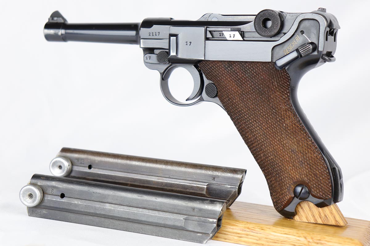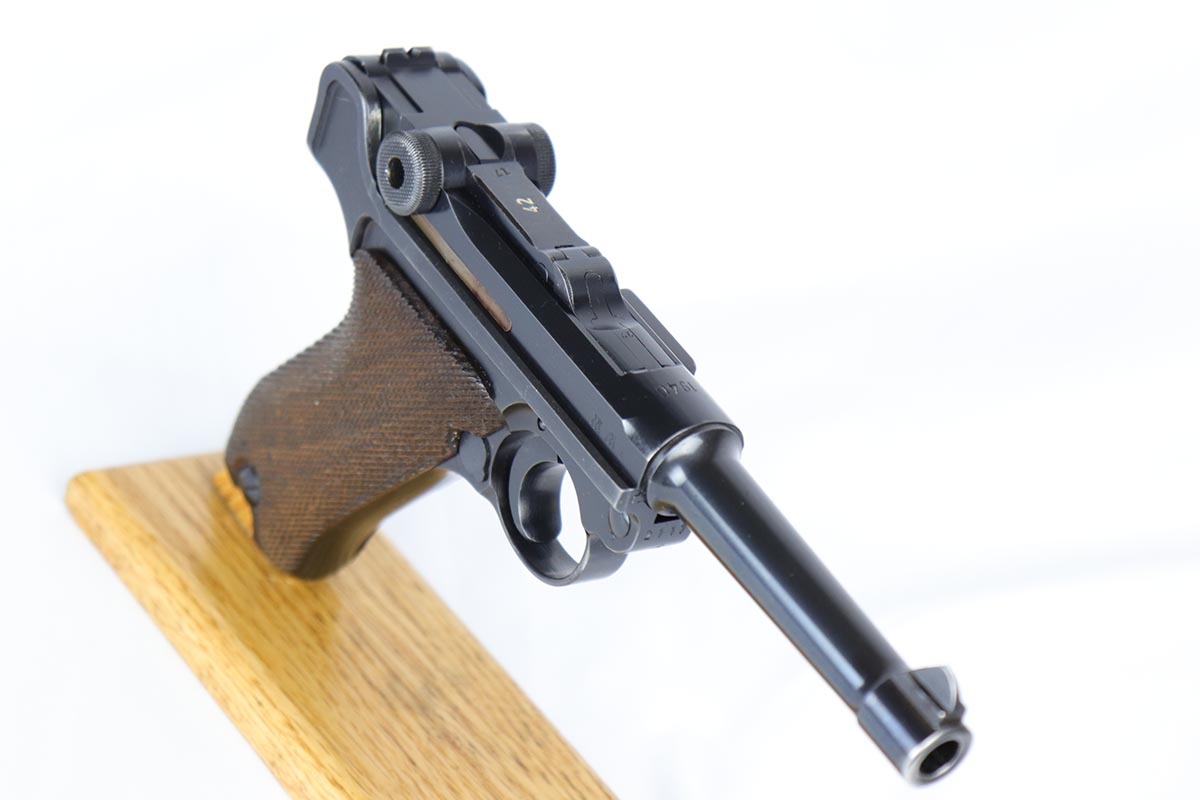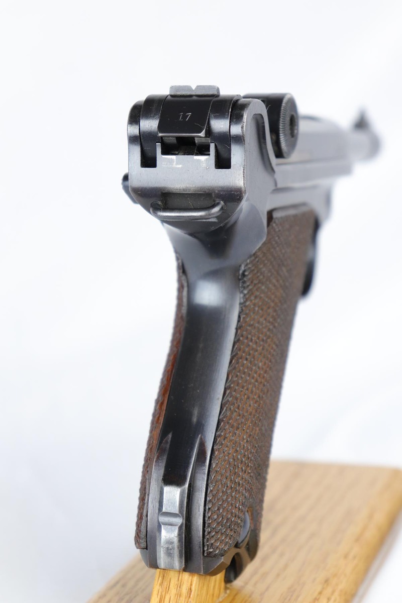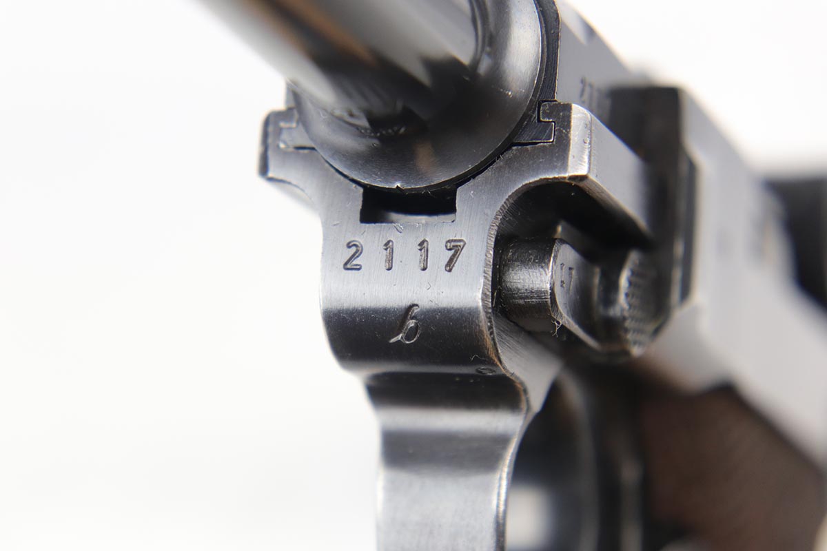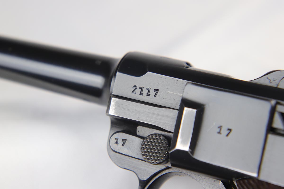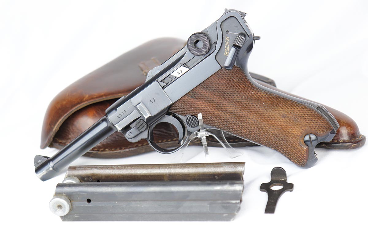 5/24/18 – This is an excellent example of a complete Mauser luger rig with 1940 dated pistol, and includes a 1939 dated holster, spare magazine and tool. The pistol is all original and matching, excluding the magazine. The bluing rates at 96-97% with finish loss on the muzzle and sideplate, likely from the holster, as well as another spot on the bottom of the front strap. The grips are E/655 proofed but not numbered. The holster is in excellent condition and is 1939 dated with waffen proof and maker mark. The tool is E/655 proofed as well, and the spare magazine is an fxo 37 that is numbered to a different luger. Pistol has an excellent bore.