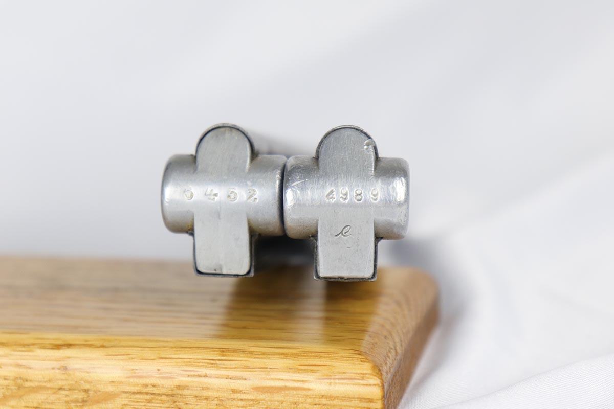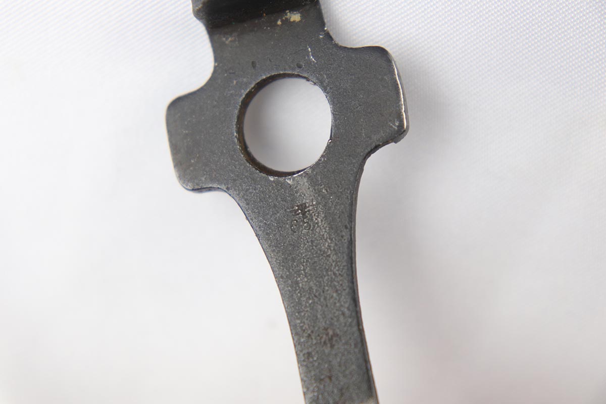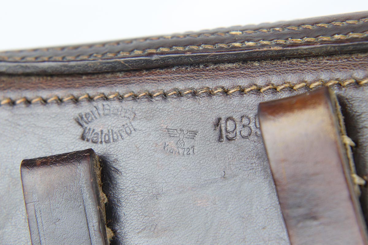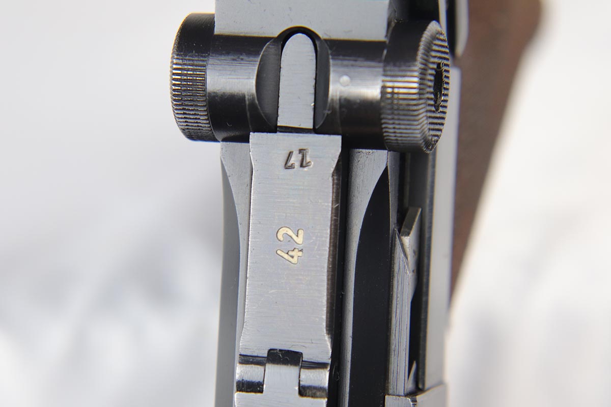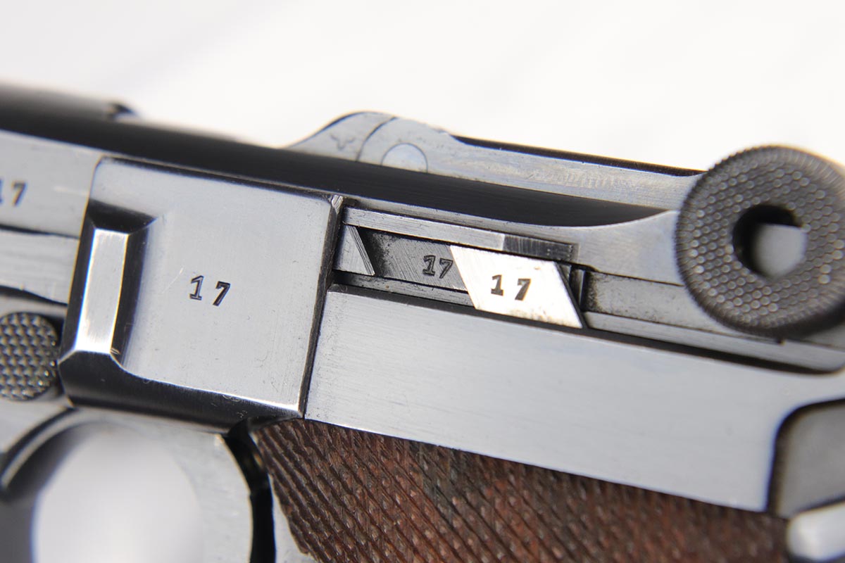 5/24/18 – This is an excellent example of a complete Mauser luger rig with 1940 dated pistol, and includes a 1939 dated holster, spare magazine and tool. The pistol is all original and matching, excluding the magazine. The bluing rates at 96-97% with finish loss on the muzzle and sideplate, likely from the holster, as well as another spot on the bottom of the front strap. The grips are E/655 proofed but not numbered. The holster is in excellent condition and is 1939 dated with waffen proof and maker mark. The tool is E/655 proofed as well, and the spare magazine is an fxo 37 that is numbered to a different luger. Pistol has an excellent bore.