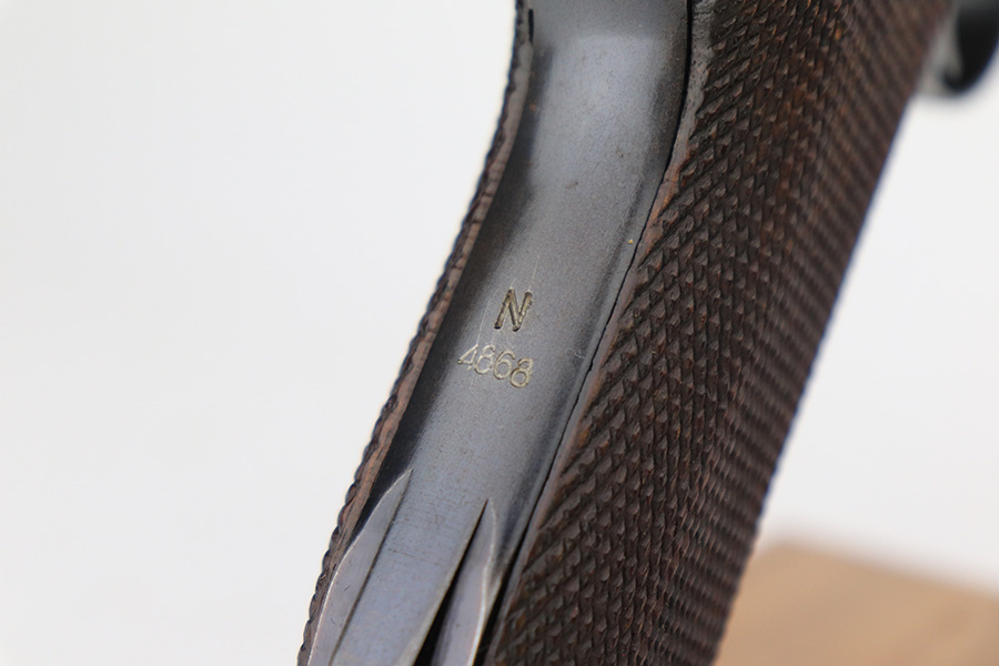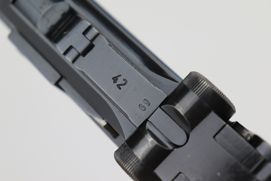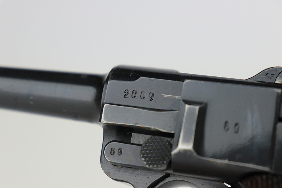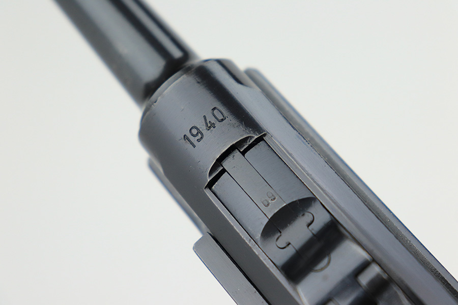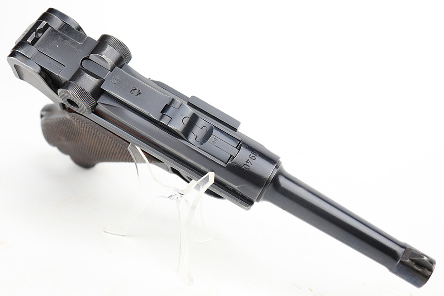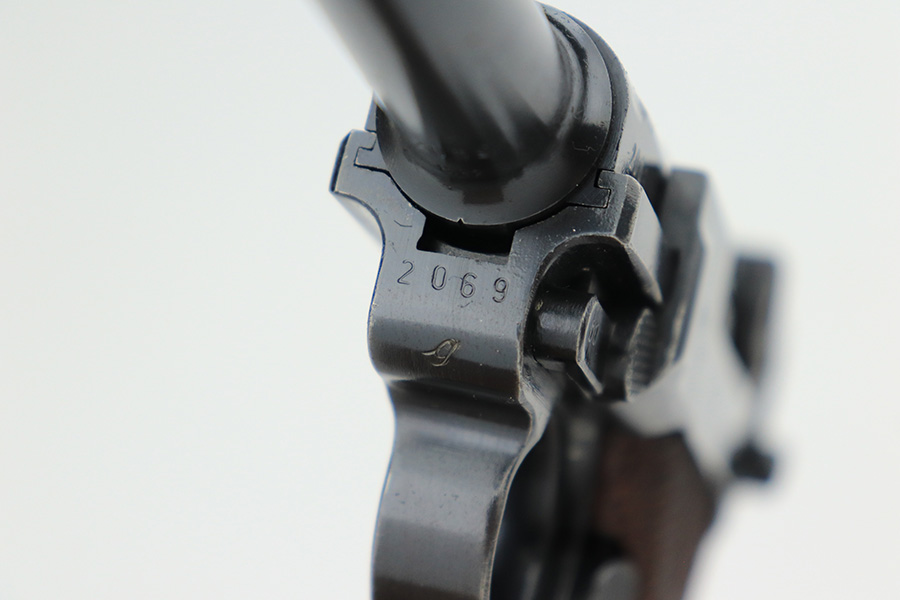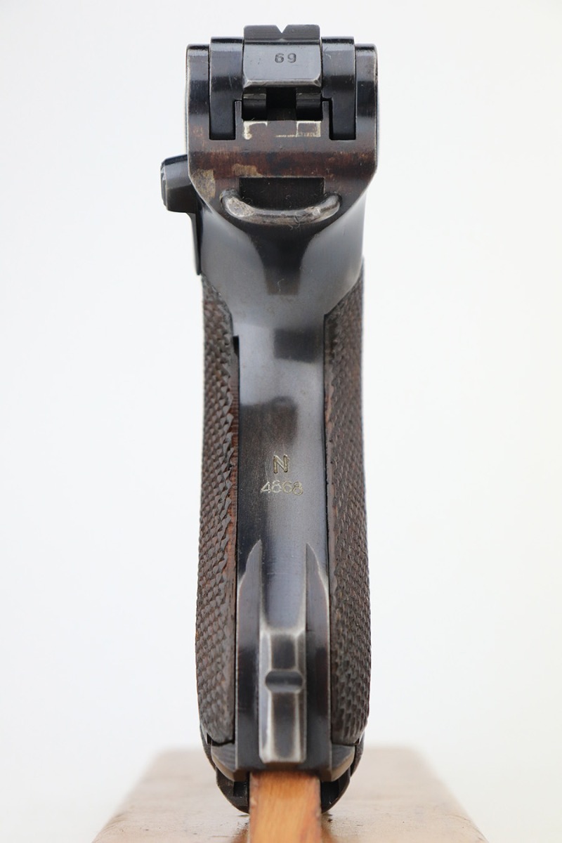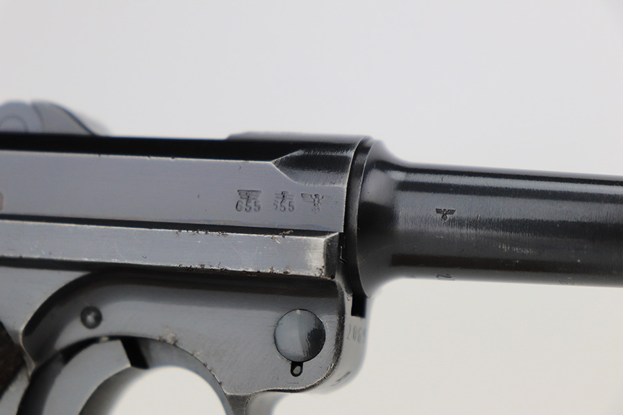 6/1/23 – This is an excellent example of a Mauser Luger from 1940 with an “N 4868” Navy marking on the back strap. Presumably, this is a Navy-issued gun. However, we’re unsure about the originality of the marking. These were all hand-engraved and the styles can vary slightly, so we can’t say for sure if this one is original. Examine the photos carefully. This example also comes with an original matching-numbered magazine with the matching Navy property marking. We have no issues with the serial numbering, but the Navy property marking on the magazine is questionable, similar to the marking on the back strap. In any case, the gun has retained about 97% of its original finish with very minor muzzle wear, hints of wear on the high edges, and a hint of thinning on the grip straps. Fitted with minty, un-numbered, “Eagle 655” proofed wood grips. The bore is shiny for the most part with strong rifling, but there is some minor freckling throughout.