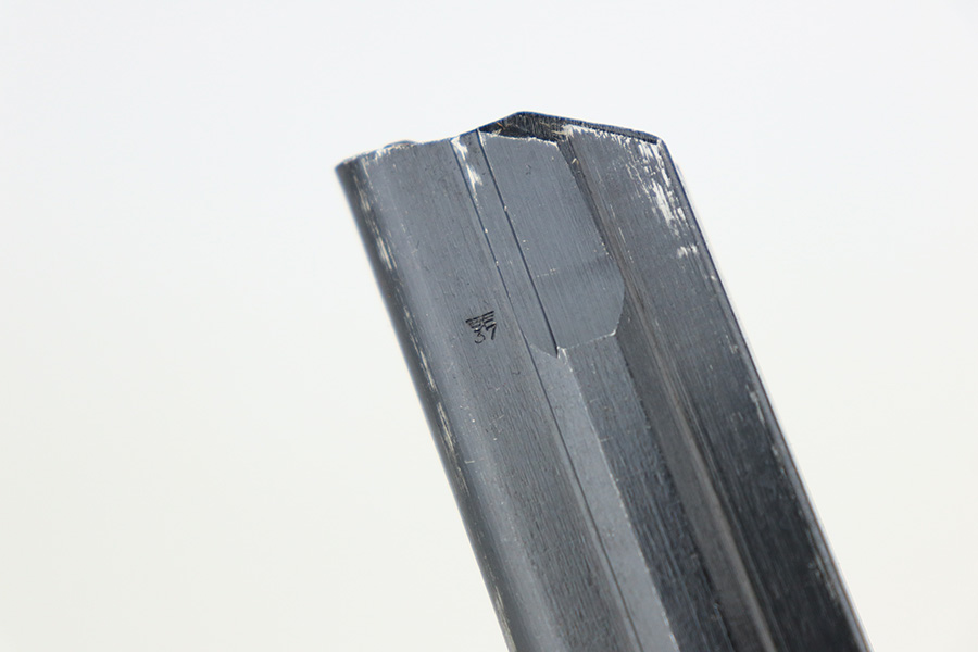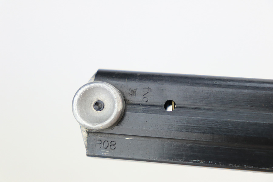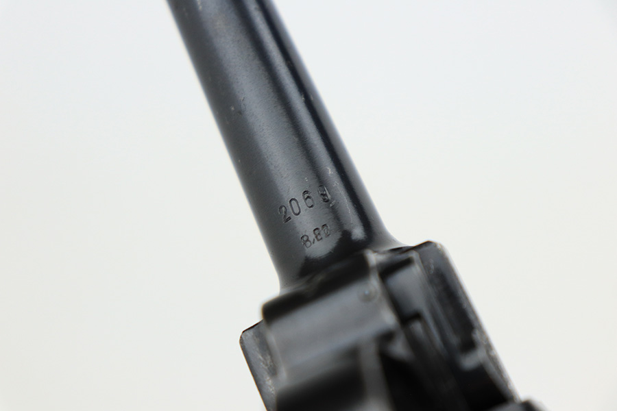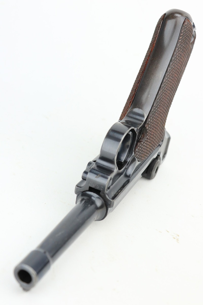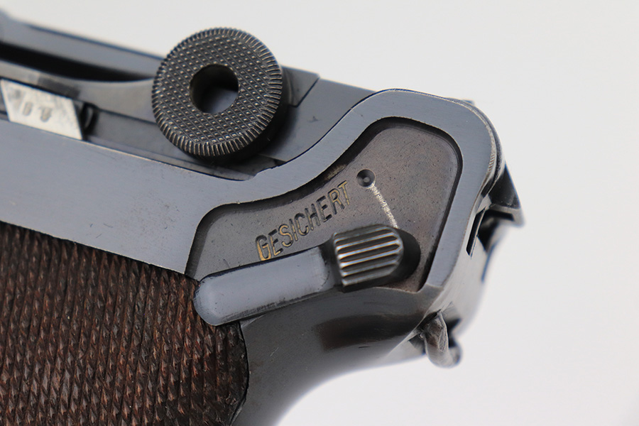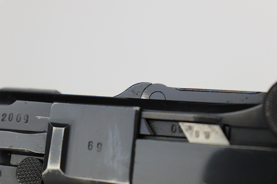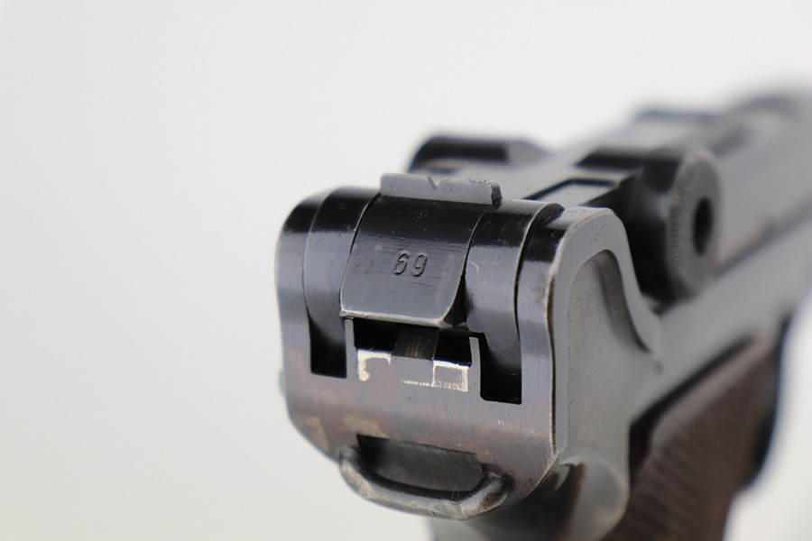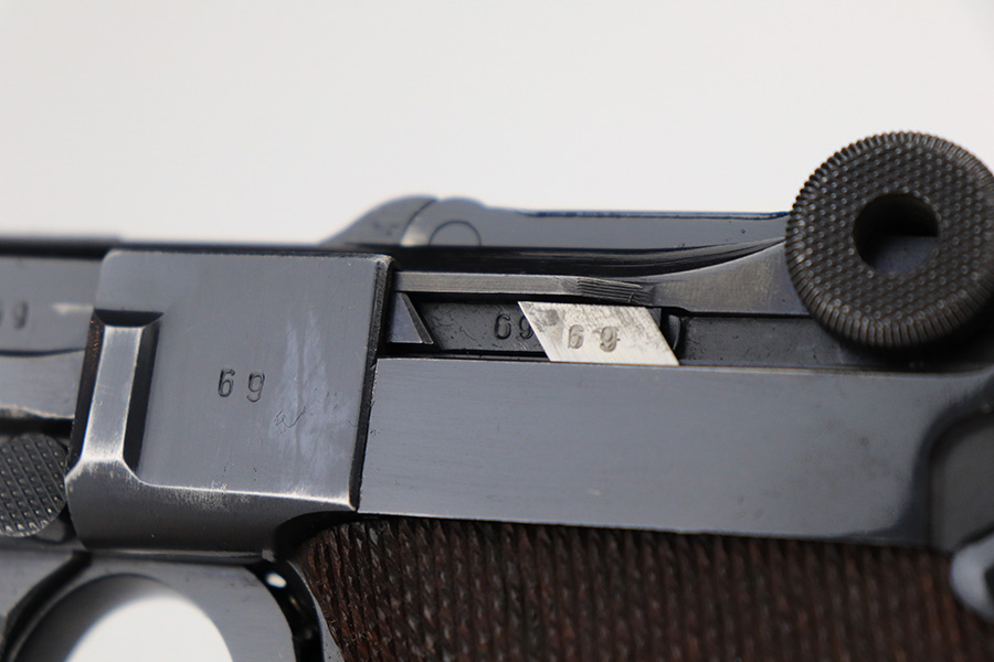 6/1/23 – This is an excellent example of a Mauser Luger from 1940 with an “N 4868” Navy marking on the back strap. Presumably, this is a Navy-issued gun. However, we’re unsure about the originality of the marking. These were all hand-engraved and the styles can vary slightly, so we can’t say for sure if this one is original. Examine the photos carefully. This example also comes with an original matching-numbered magazine with the matching Navy property marking. We have no issues with the serial numbering, but the Navy property marking on the magazine is questionable, similar to the marking on the back strap. In any case, the gun has retained about 97% of its original finish with very minor muzzle wear, hints of wear on the high edges, and a hint of thinning on the grip straps. Fitted with minty, un-numbered, “Eagle 655” proofed wood grips. The bore is shiny for the most part with strong rifling, but there is some minor freckling throughout.