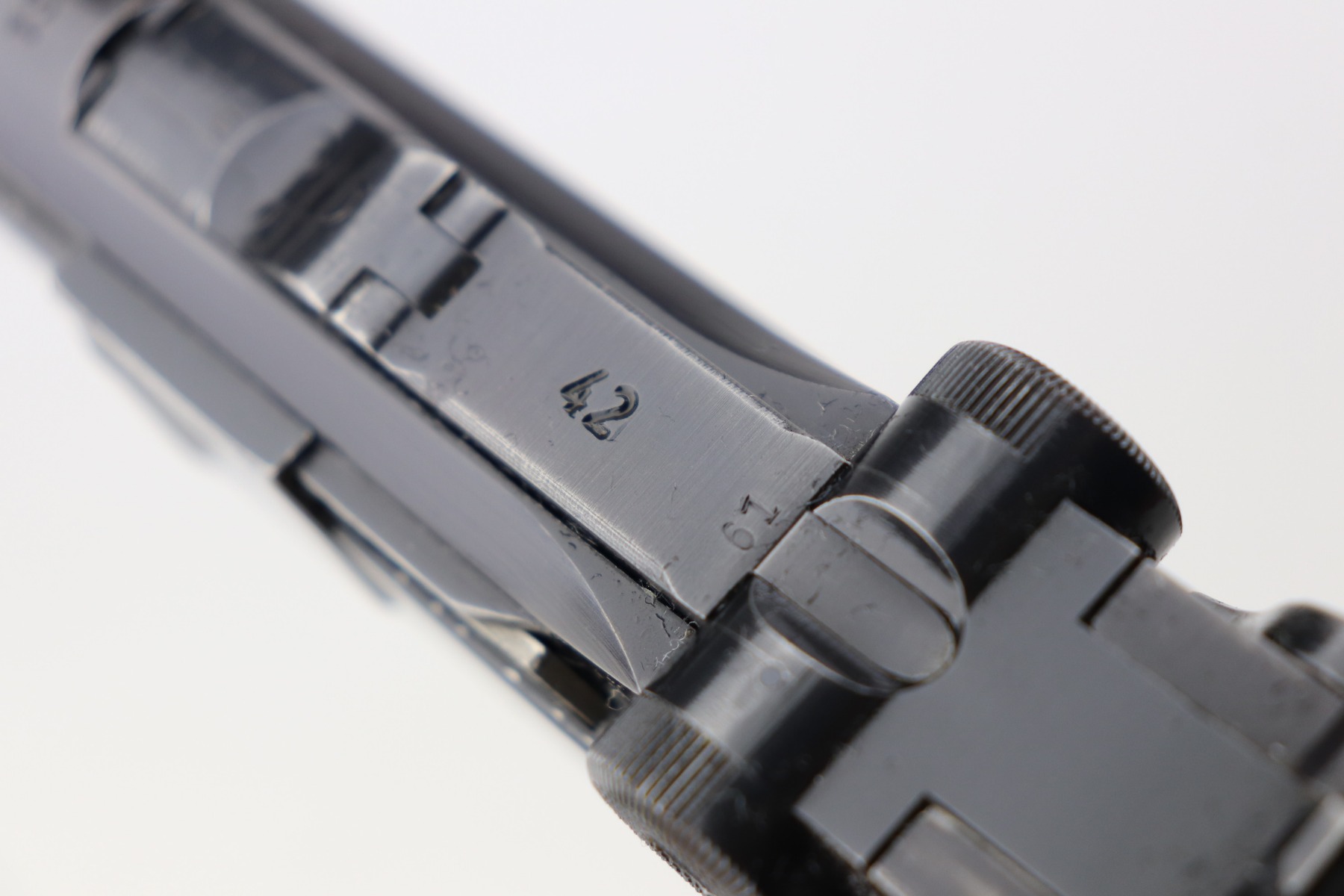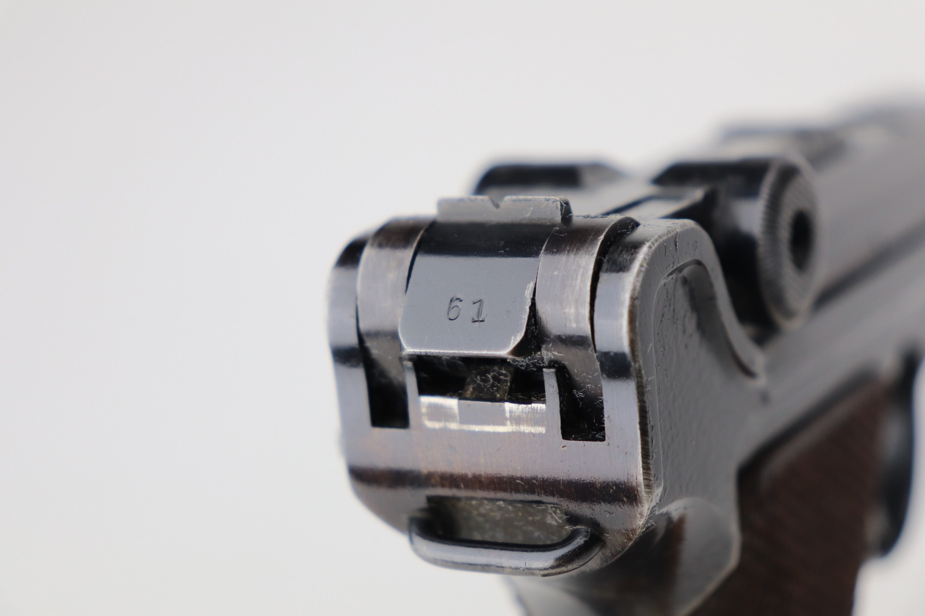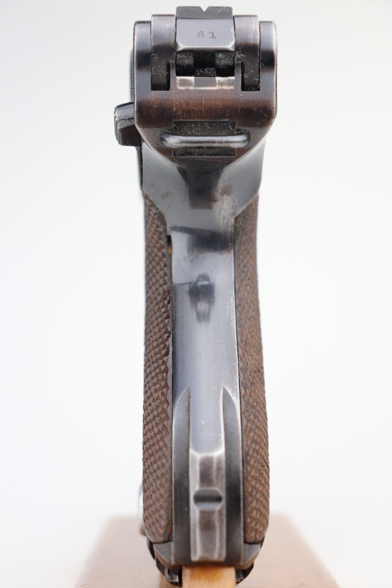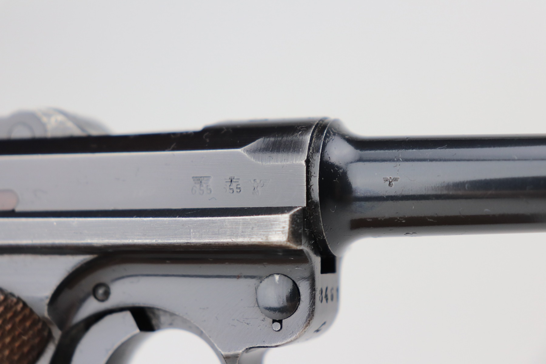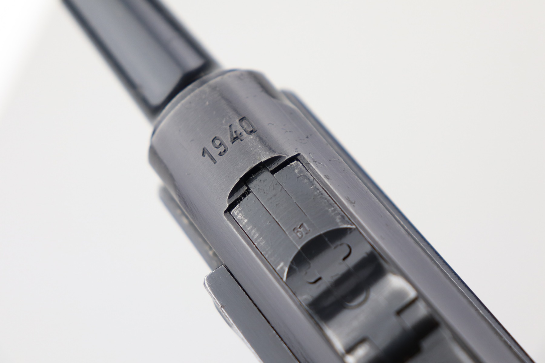 3/25/24 – This is an excellent example of a Mauser Luger issued to the Nazi military in 1940. This one is all matching and has the proper “Eagle 655” military proofs. It has retained about 95% of its original bluing. There is minor wear around the muzzle, side plate, and front edges of the frame. Very minor thinning on the straps. There a few very light handling marks on the barrel and front strap. It comes with excellent waffen-proofed grips and a mismatched period-correct magazine. Minty bore.