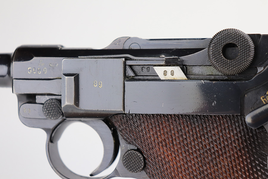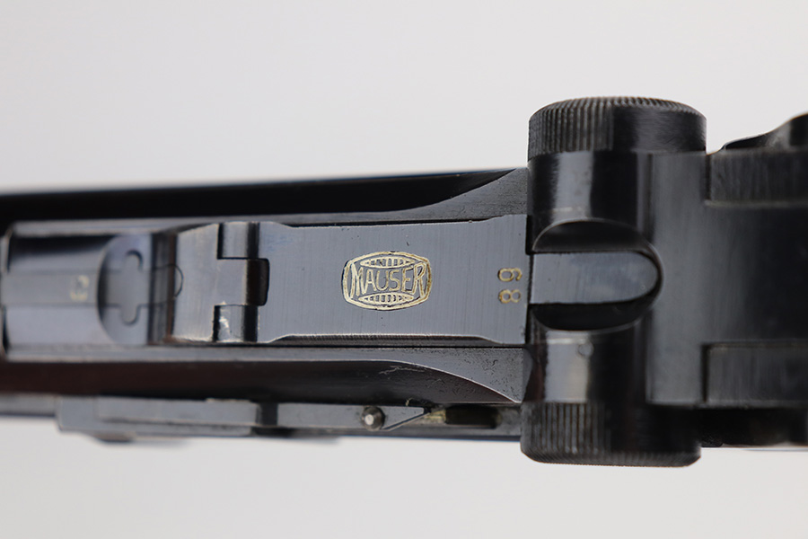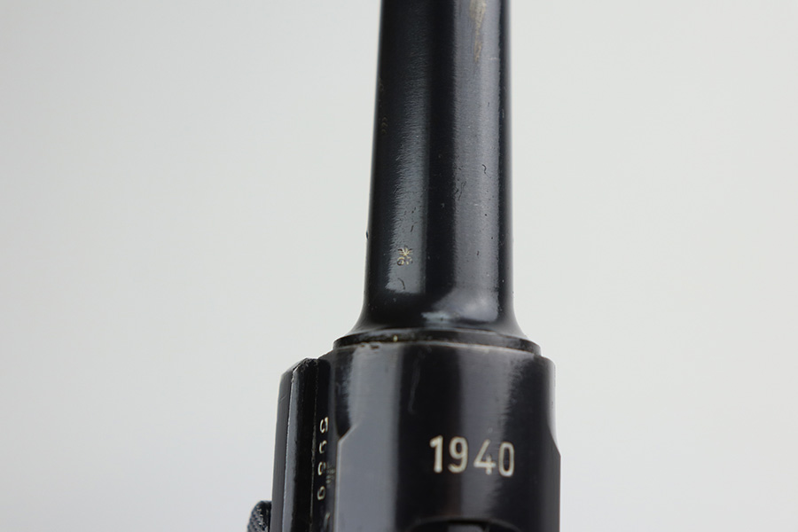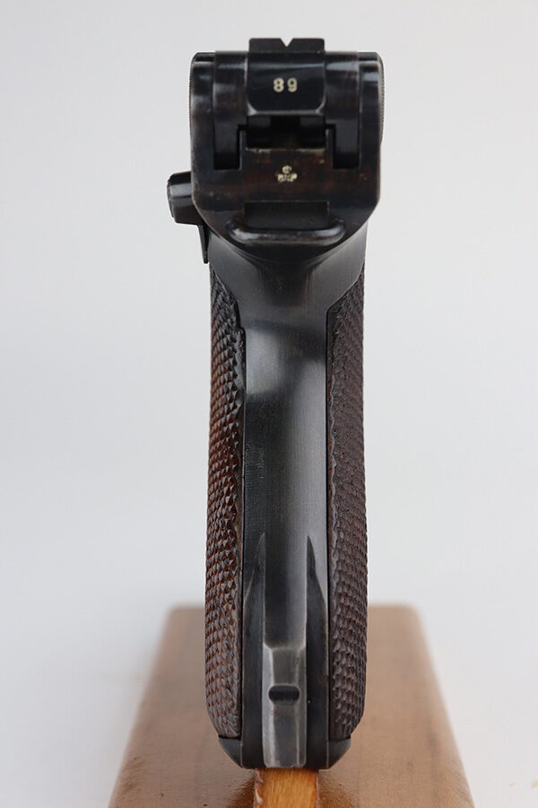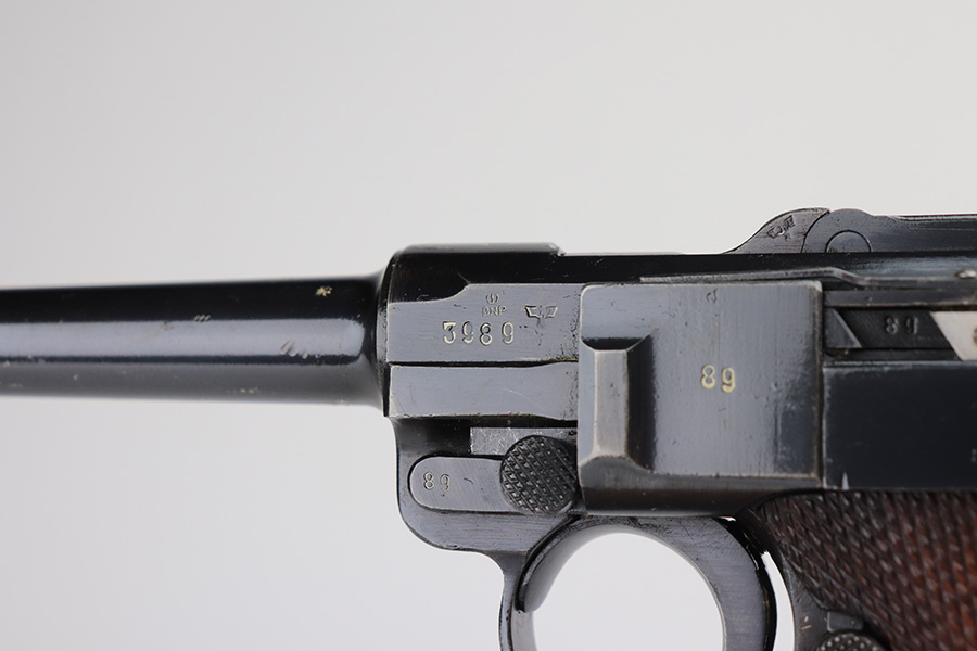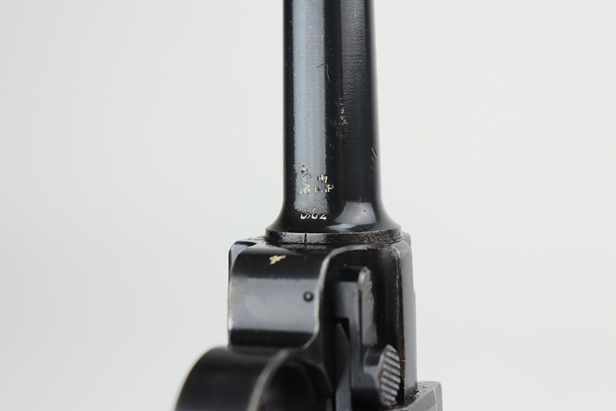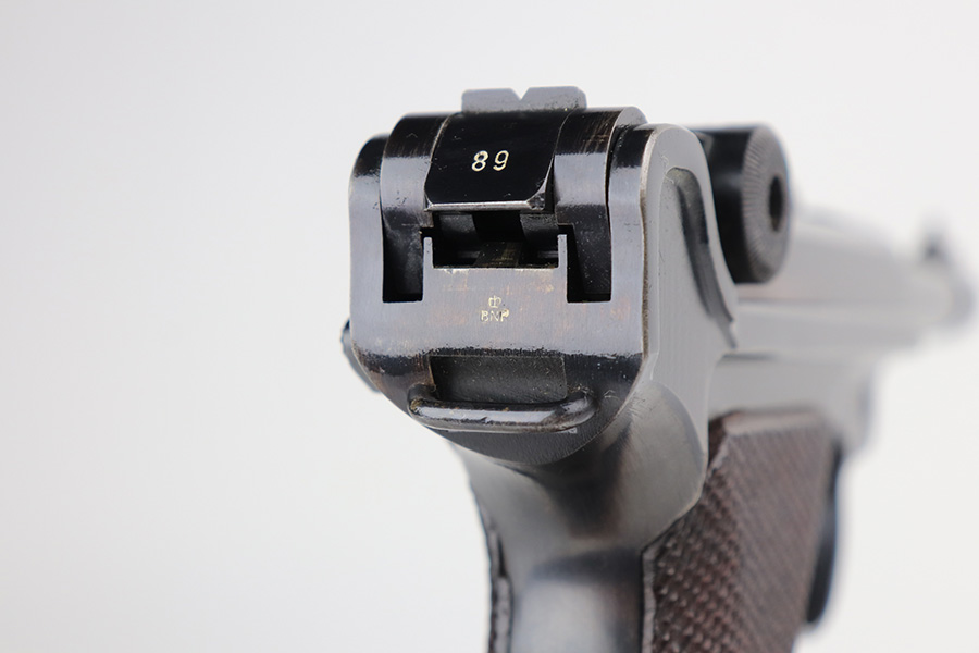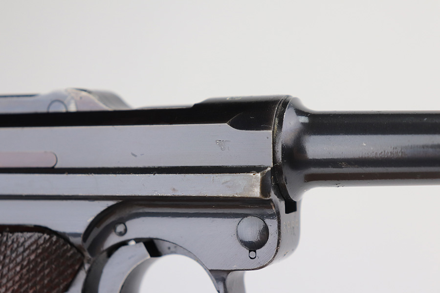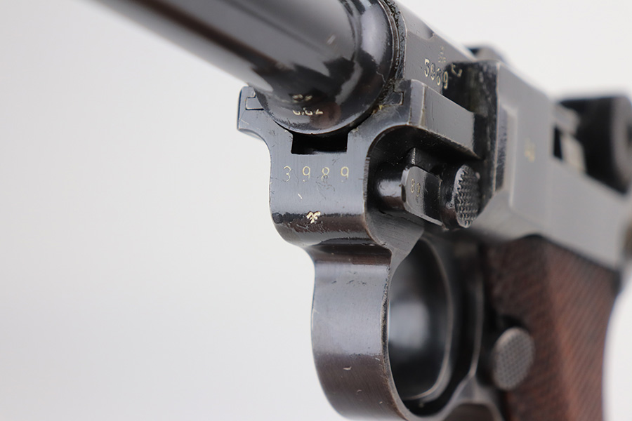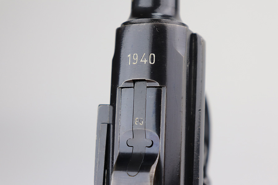 8/12/21 – This is an excellent example of a Mauser Luger issued to the Nazi police force in 1940. It is all matching, has a Mauser Banner logo on the toggle, an added police sear safety, and a police “Eagle L” marking on the right side of the slide. This one also has “Crown BNP” British proofs, indicating it was likely captured by the British and exported out of England. It has retained about 97% of its original finish. There are just hints of wear around the high edges, some minor dings on the barrel, just a hint of thinning and patina on the front strap, and a spot of wear at the base of the front strap. Comes with excellent un-numbered grips (the right panel has a waffen proof) and a matching magazine. Minty bore.