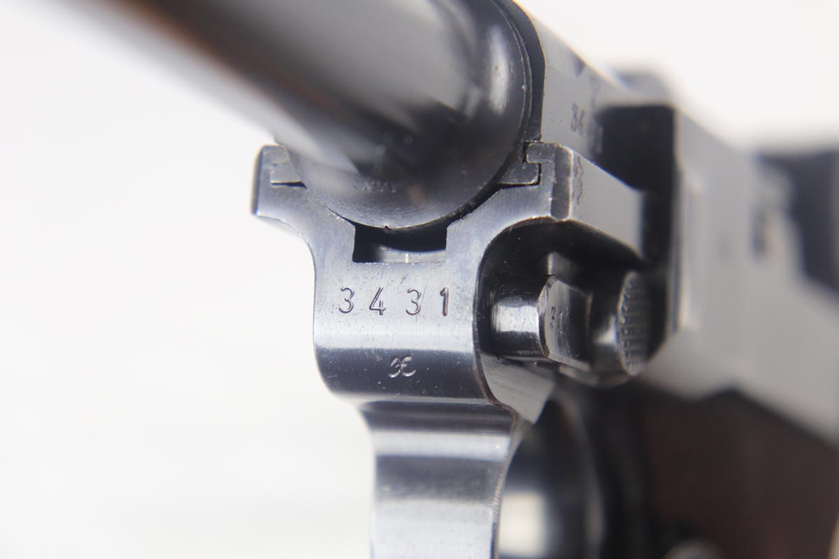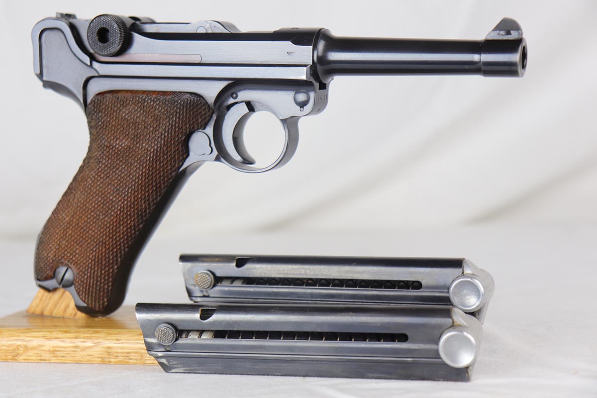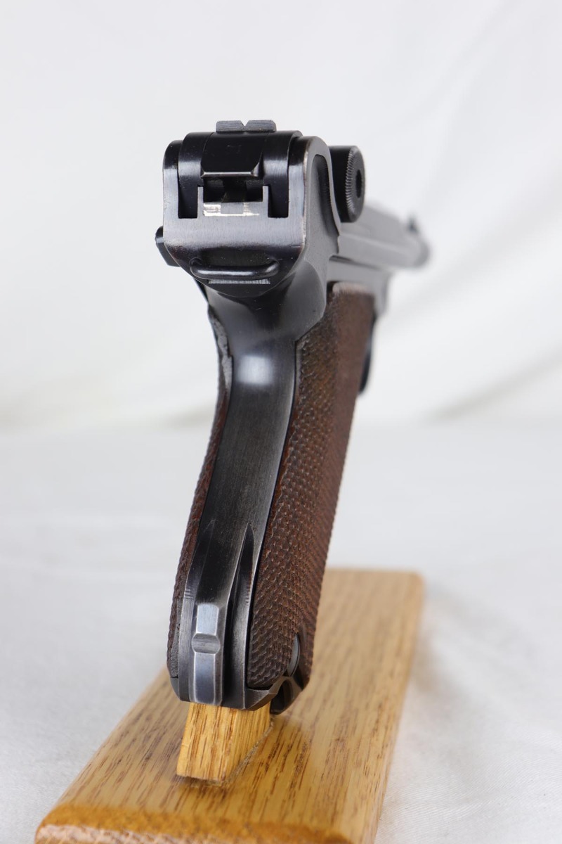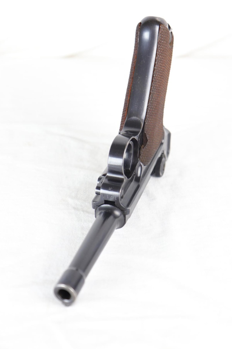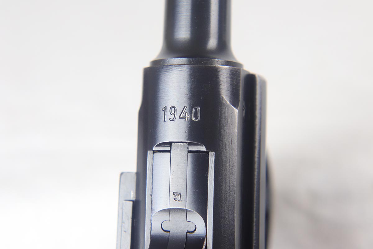 7/19/18 – This is an excellent and complete police issued Mauser Luger rig, with both factory original matching mags, tool and 1940 dated holster. The pistol is all matching and original, including the grips, and retains about 96-97% blue. There is minor holster wear on the muzzle and sideplate, and a spot of finish loss on the bottom of the front strap. There are also a couple of dings on the left side rail of the pistol. Comes with a blank luger tool and a very nice police-style holster, with maker mark and Berlin stamp. Excellent bore.