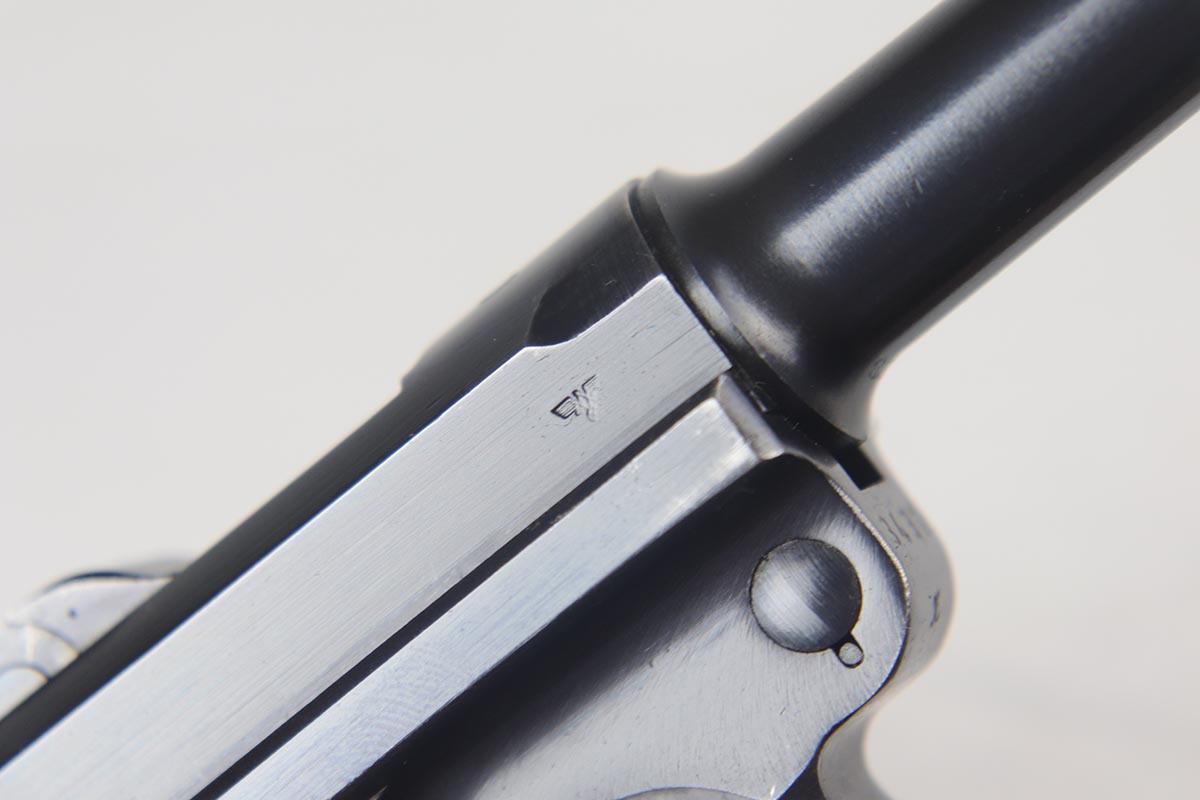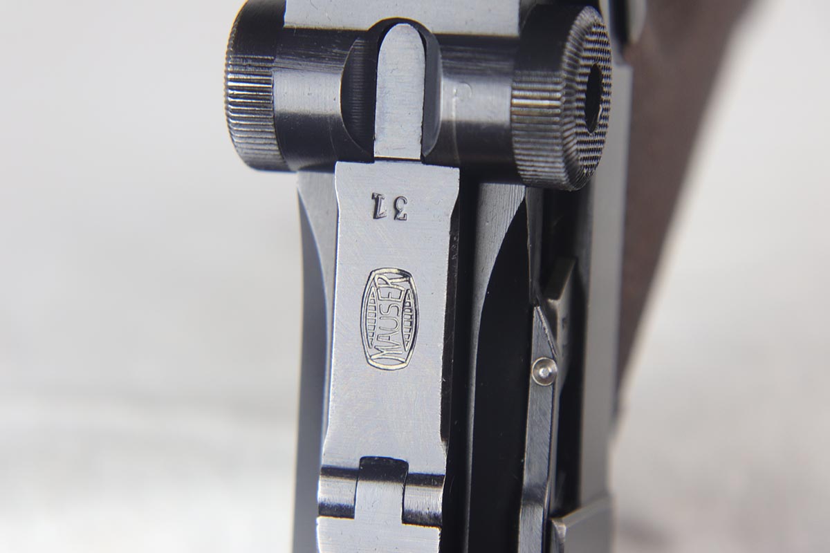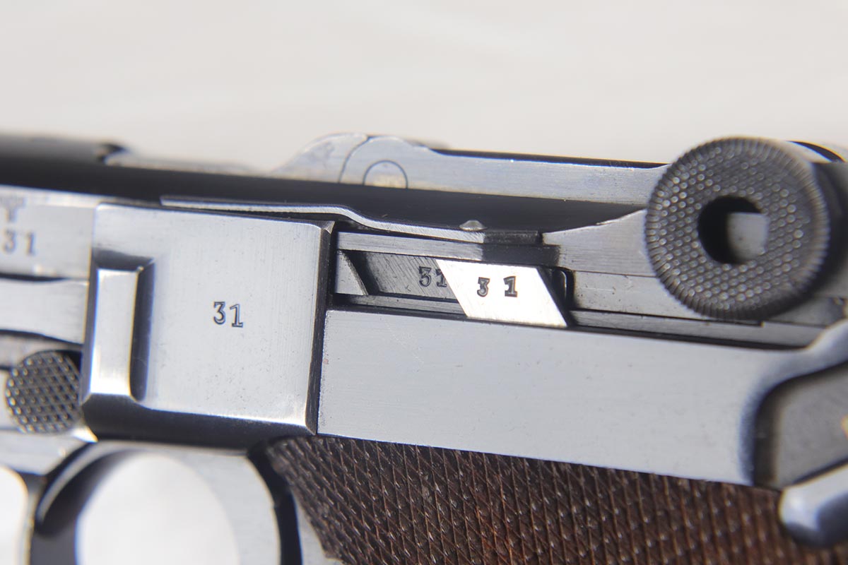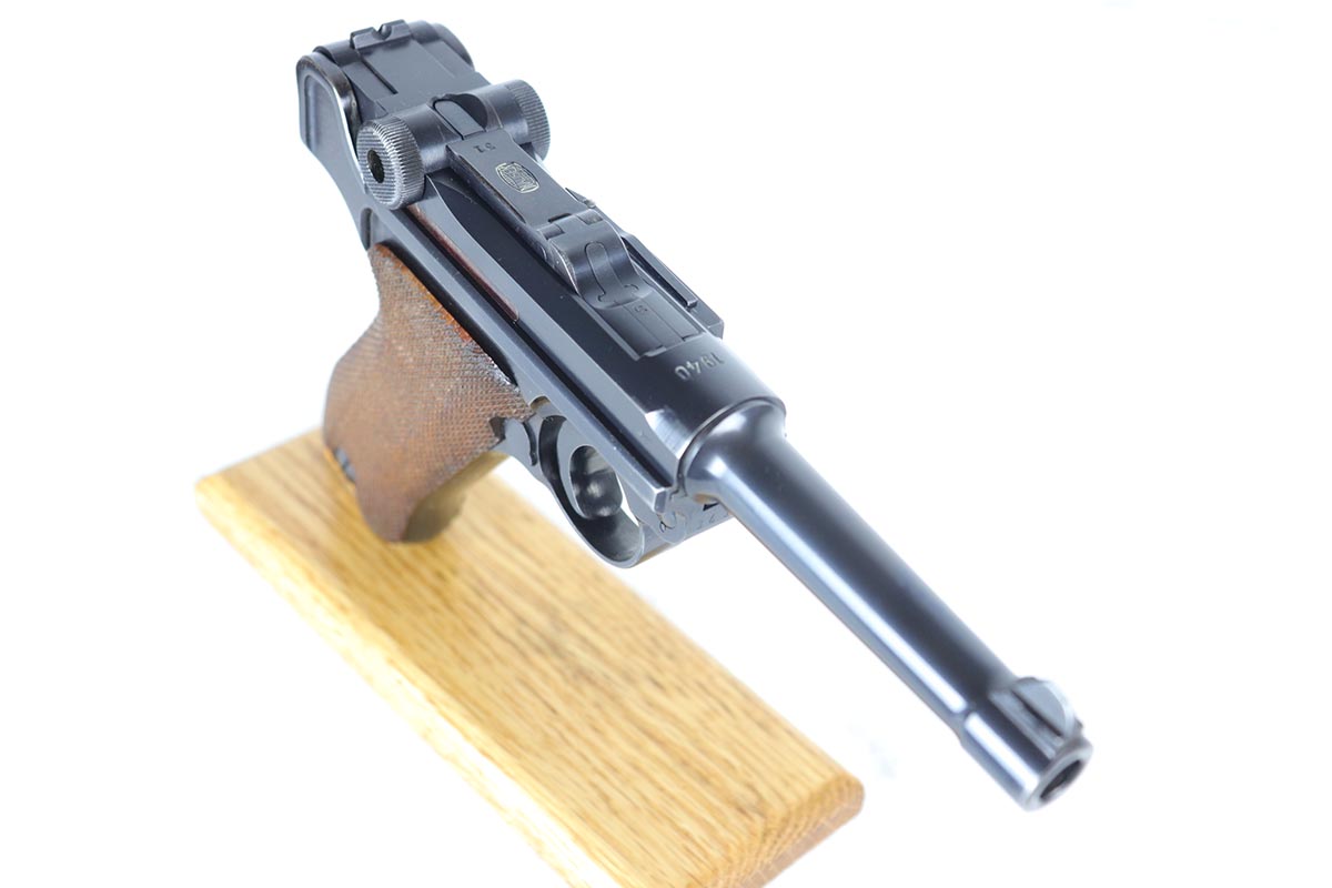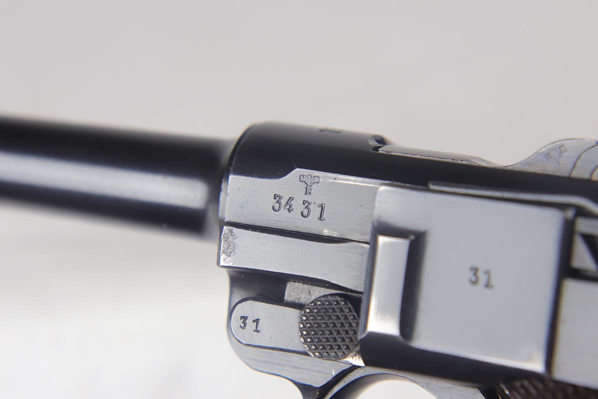 7/19/18 – This is an excellent and complete police issued Mauser Luger rig, with both factory original matching mags, tool and 1940 dated holster. The pistol is all matching and original, including the grips, and retains about 96-97% blue. There is minor holster wear on the muzzle and sideplate, and a spot of finish loss on the bottom of the front strap. There are also a couple of dings on the left side rail of the pistol. Comes with a blank luger tool and a very nice police-style holster, with maker mark and Berlin stamp. Excellent bore.
