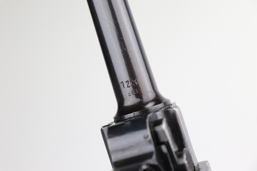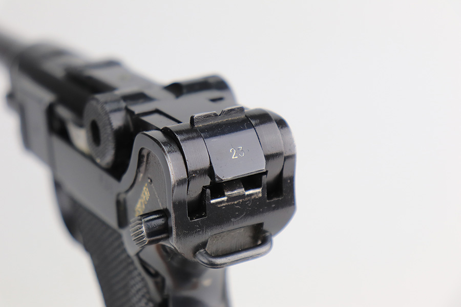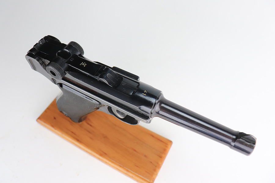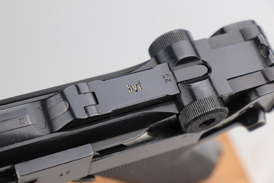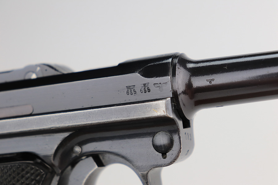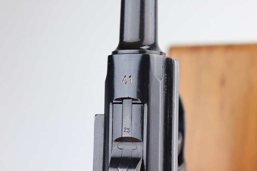 1/19/23 – This is an excellent example of a BYF 41 “Black Widow” Mauser Luger issued to the Nazi military in 1941. It is all matching and has the proper “Eagle 655” military acceptance proofs. It comes with a set of original black bakelite “Black Widow” grips and an original “Black Widow” magazine – all in excellent condition. The gun itself has retained about 96-97% of its original finish. Just hints of wear around some of the high edges and very minor dulling, thinning, and pin-pricking on the grip straps. The bore is shiny with strong rifling and some very light freckling in the grooves.