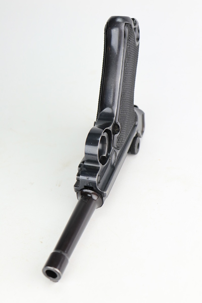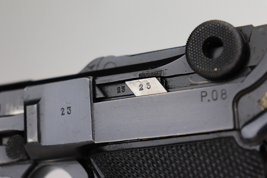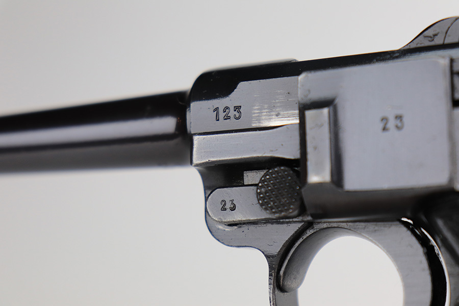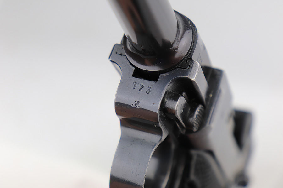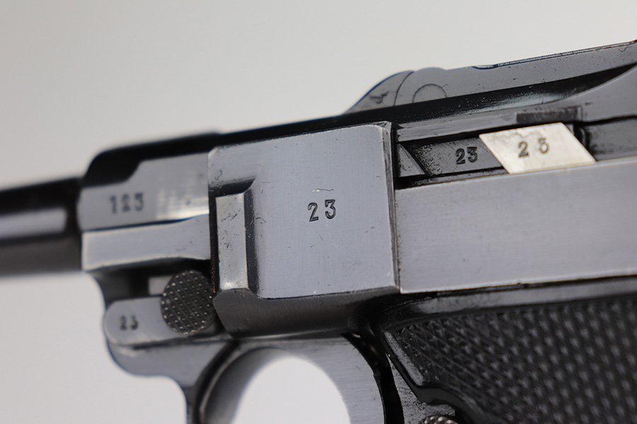 1/19/23 – This is an excellent example of a BYF 41 “Black Widow” Mauser Luger issued to the Nazi military in 1941. It is all matching and has the proper “Eagle 655” military acceptance proofs. It comes with a set of original black bakelite “Black Widow” grips and an original “Black Widow” magazine – all in excellent condition. The gun itself has retained about 96-97% of its original finish. Just hints of wear around some of the high edges and very minor dulling, thinning, and pin-pricking on the grip straps. The bore is shiny with strong rifling and some very light freckling in the grooves.