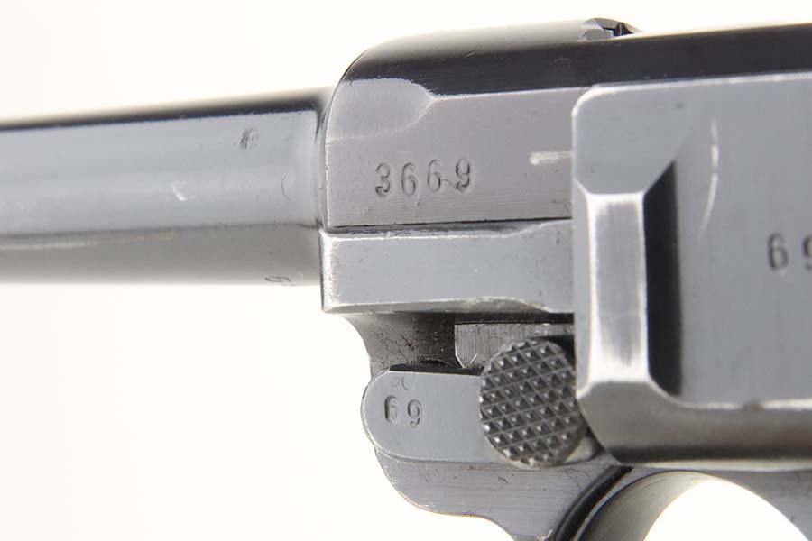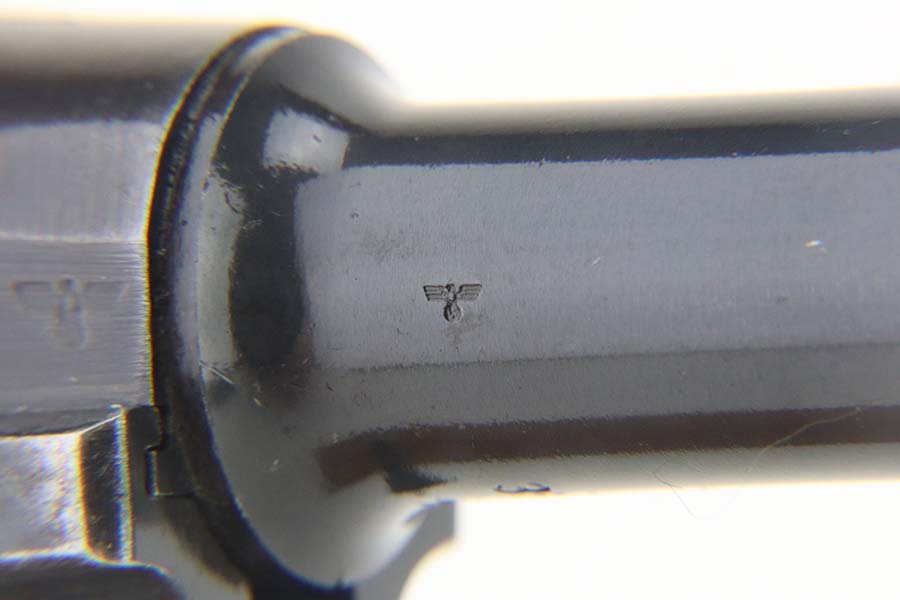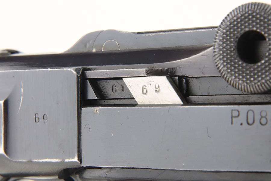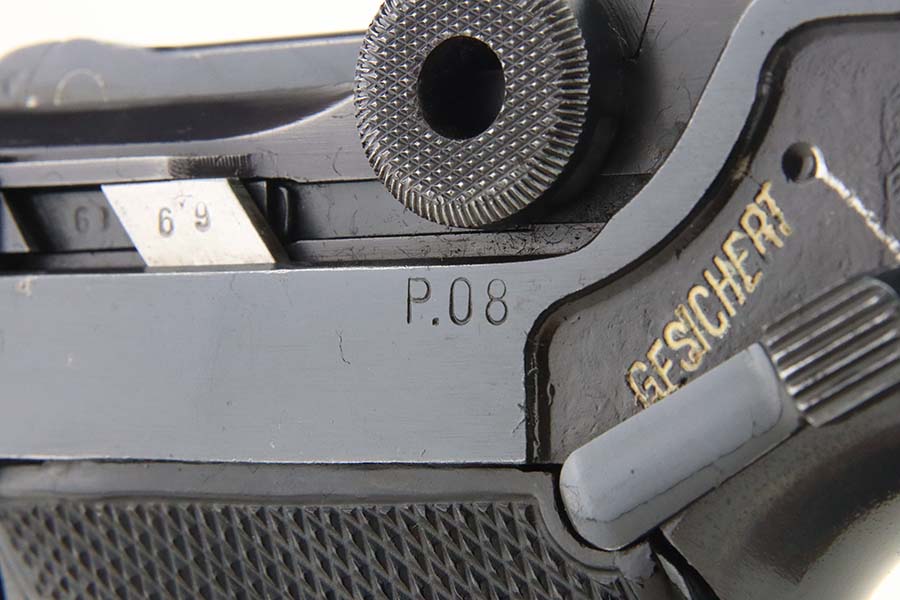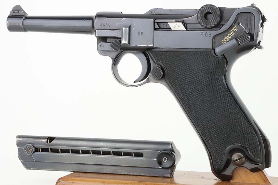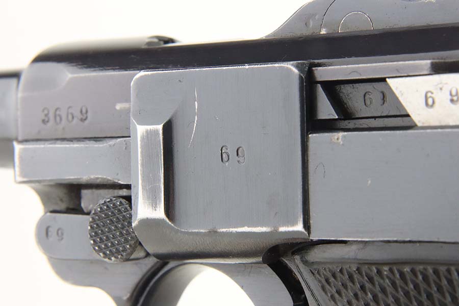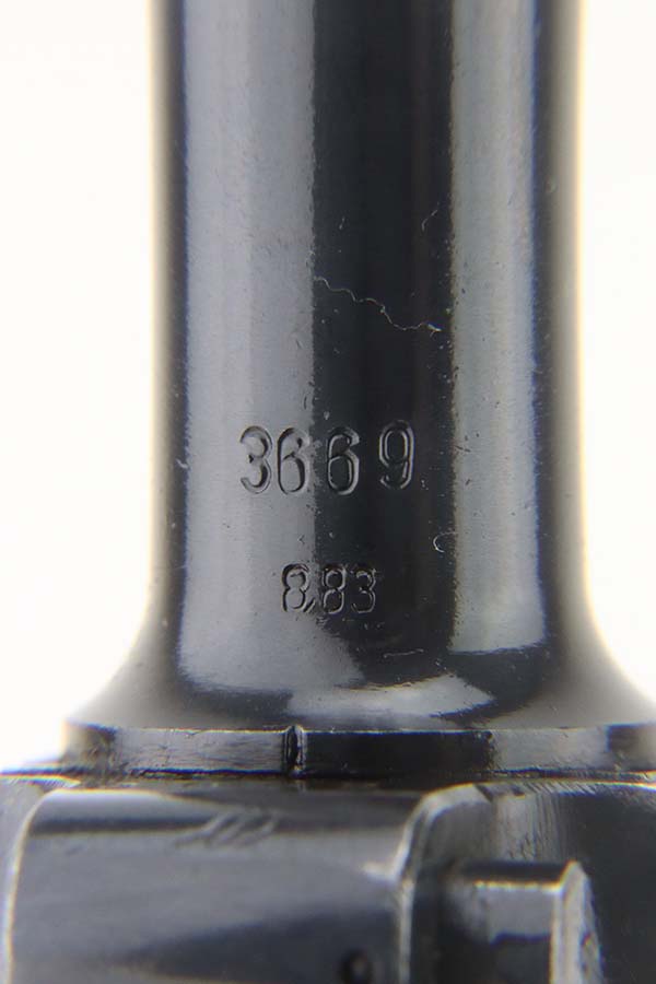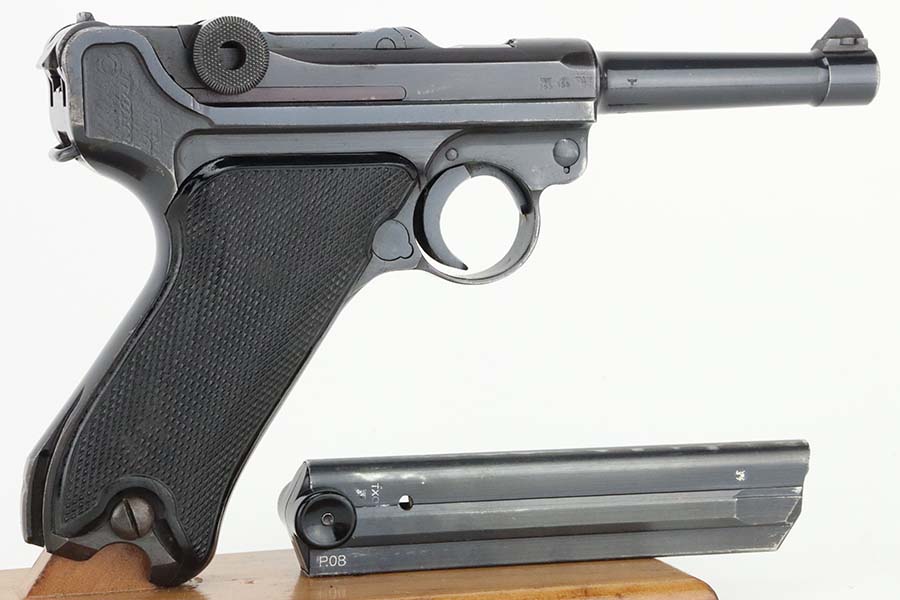 5/20/24 – This is an excellent example of a BYF 41 “Black Widow” Mauser Luger issued to the Nazi military in 1941. It is all matching, has the proper “Eagle 655” military acceptance proofs, and fitted with an excellent set of original “Black Widow” bakelite grips. It comes with one original “Black Widow” magazine. The gun has retained about 96% of its original finish with some minor muzzle wear, high edge wear, and some very light wear on the grip straps. Excellent, shiny bore.
