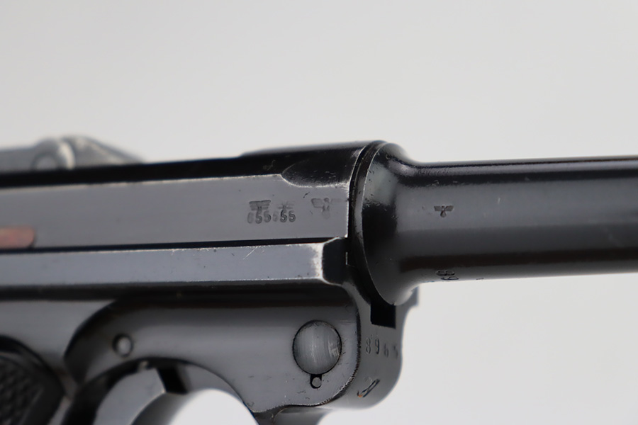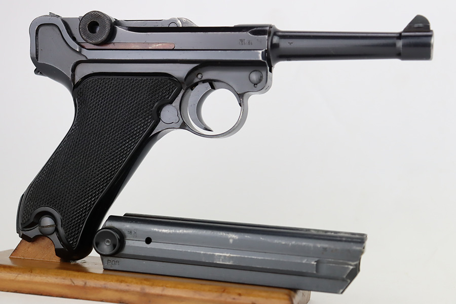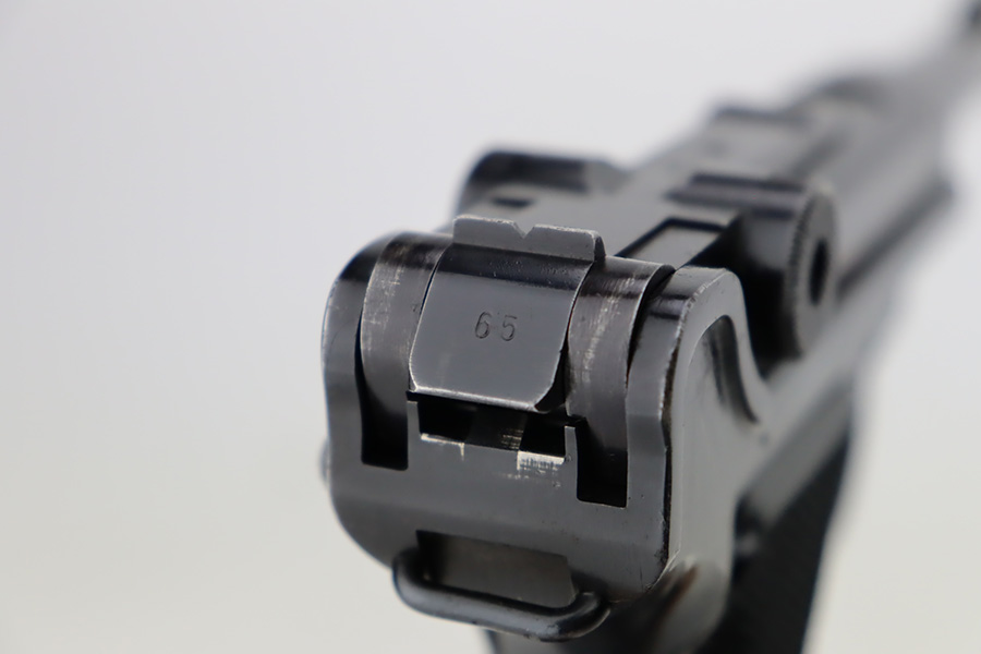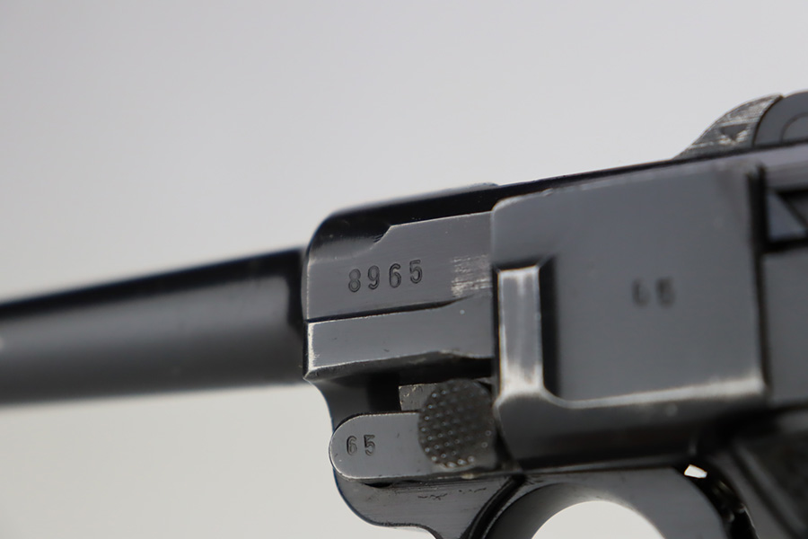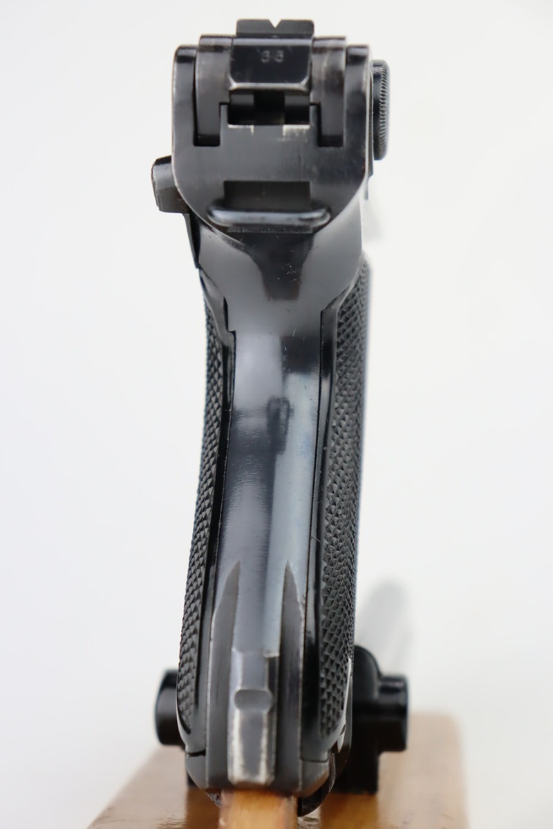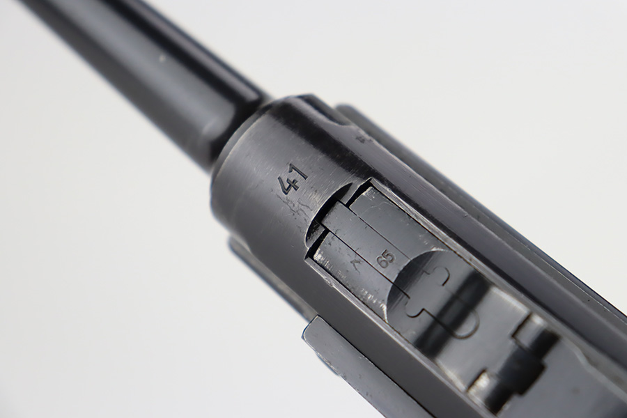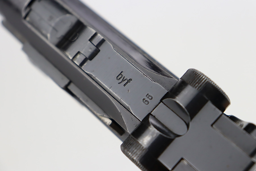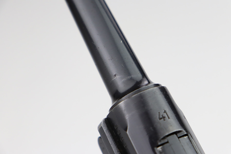 9/25/23 – This is an excellent example of a BYF 41 “Black Widow” Mauser Luger issued to the Nazi military in 1941. It is all matching, has the proper “Eagle 135” military acceptance proofs, and fitted with an excellent set of original “Black Widow” bakelite grips. It comes as a rig with two original “Black Widow” magazines, an “Eagle 63” marked tool, and an excellent 1941-dated holster. The gun itself has retained about 96% of its original finish. There is very minor wear around the muzzle, on the side plate, on the side rails, and one small spot at the base of the front strap. The bore is excellent – shiny with strong rifling.