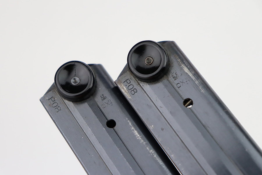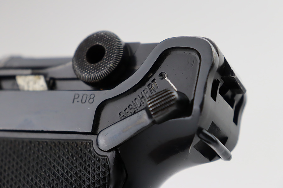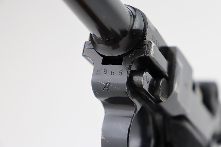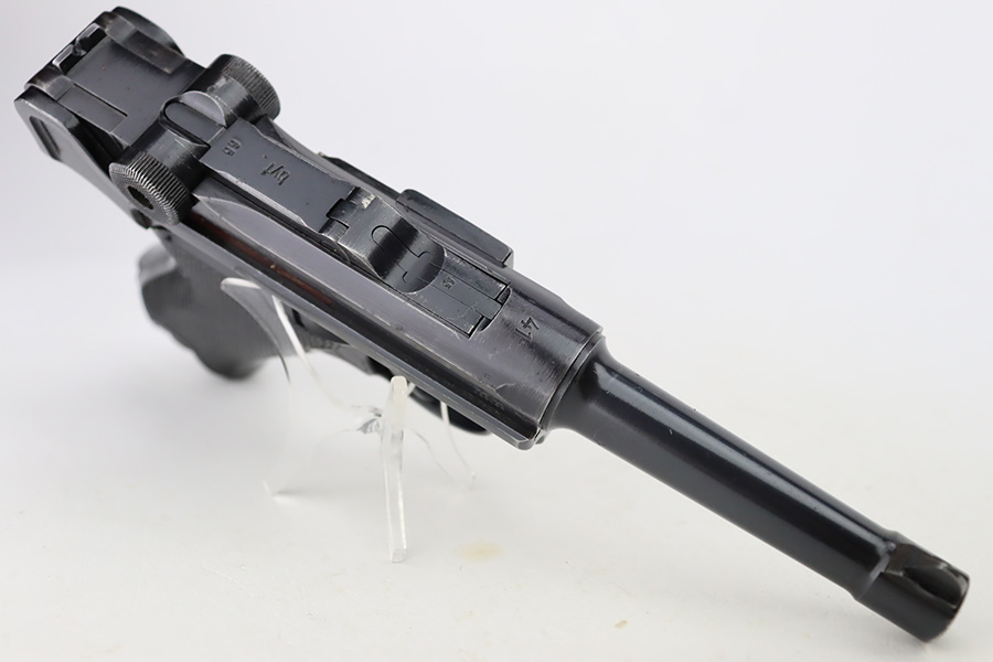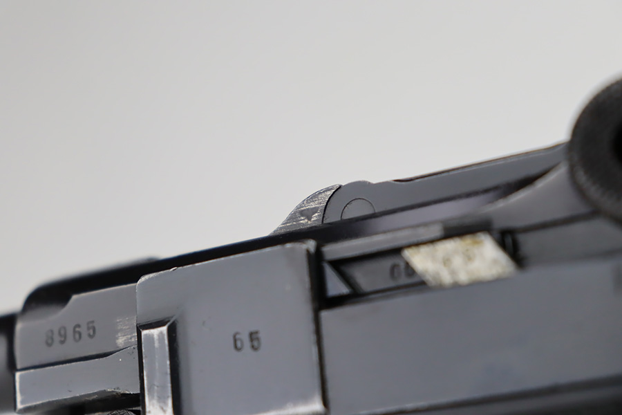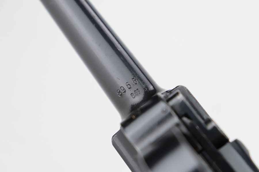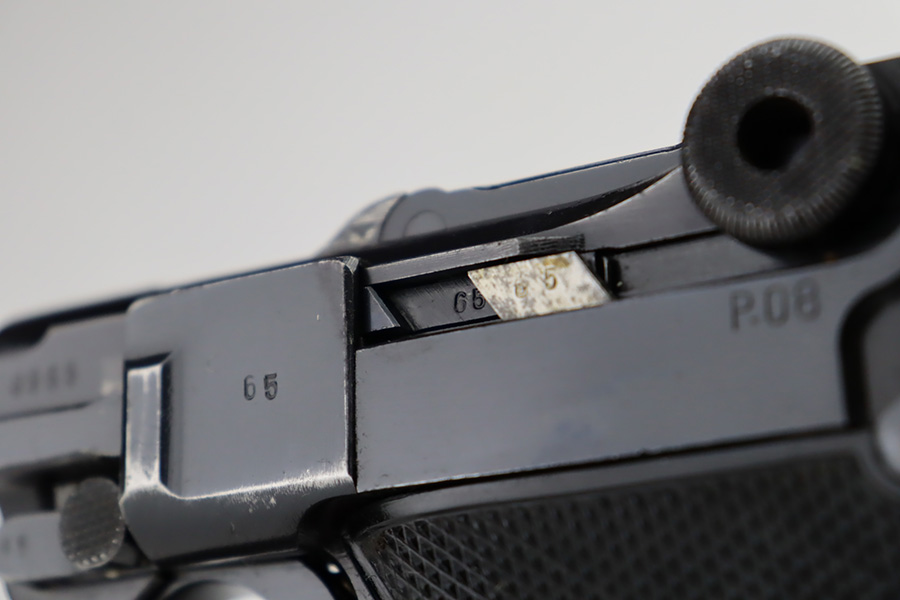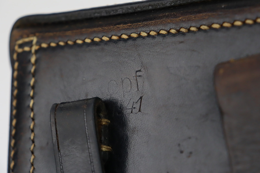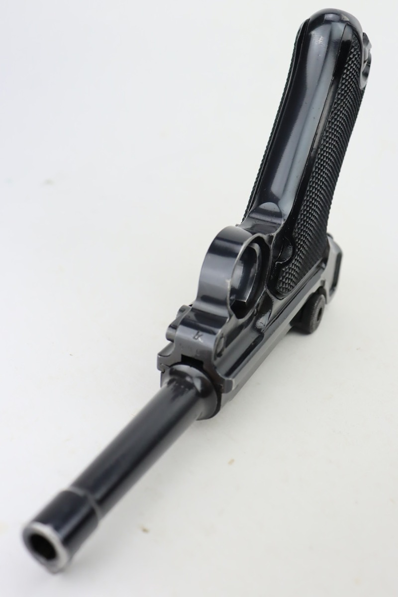 9/25/23 – This is an excellent example of a BYF 41 “Black Widow” Mauser Luger issued to the Nazi military in 1941. It is all matching, has the proper “Eagle 135” military acceptance proofs, and fitted with an excellent set of original “Black Widow” bakelite grips. It comes as a rig with two original “Black Widow” magazines, an “Eagle 63” marked tool, and an excellent 1941-dated holster. The gun itself has retained about 96% of its original finish. There is very minor wear around the muzzle, on the side plate, on the side rails, and one small spot at the base of the front strap. The bore is excellent – shiny with strong rifling.