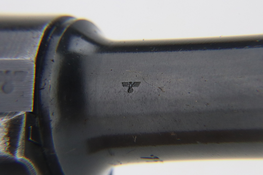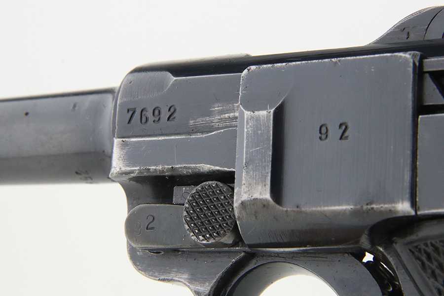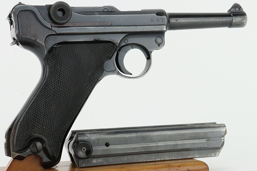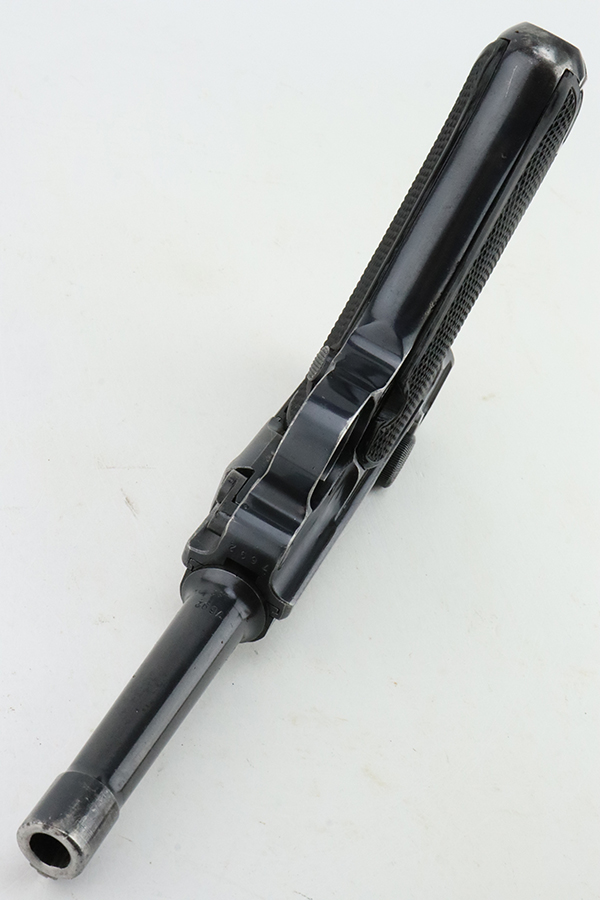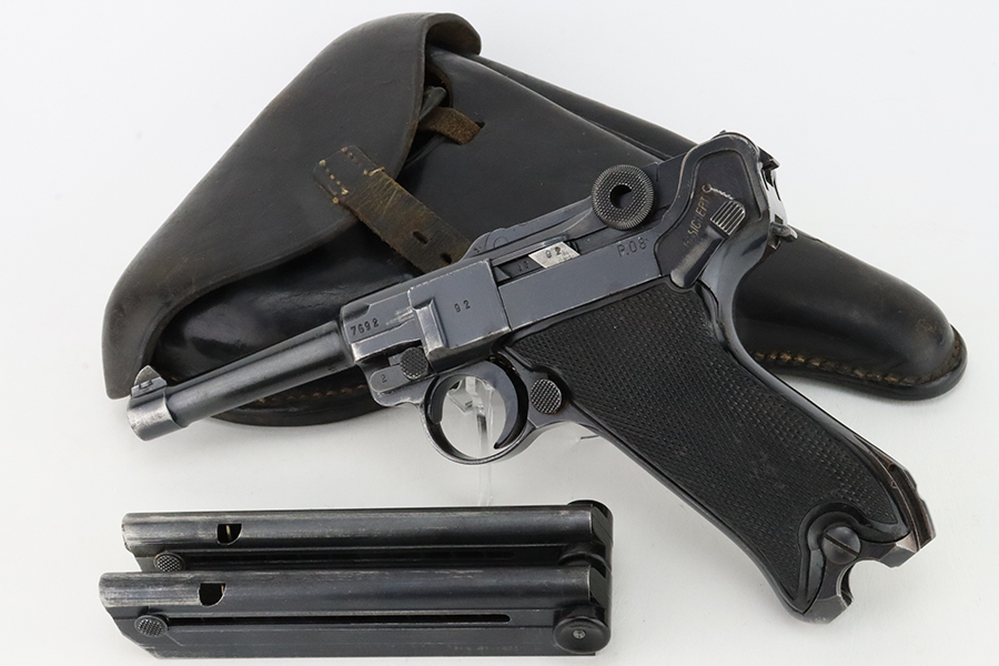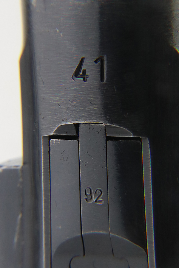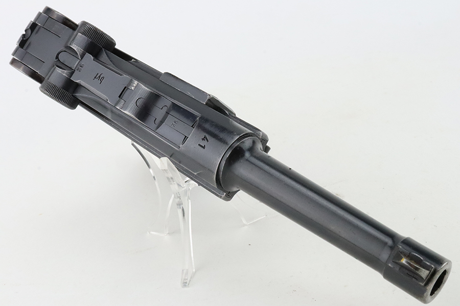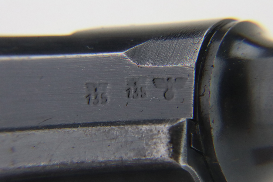 1/29/24 – This is an excellent example of a BYF 41 “Black Widow” Mauser Luger issued to the German military in 1941. It is all matching, has the proper “Eagle 135” military acceptance proofs, and fitted with an excellent set of original “Black Widow” bakelite grips. It comes as a rig with two original “Black Widow” magazines and a very nice 1942-dated holster. The gun itself has retained about 94-95% of its original finish. There is very minor general high edge wear, some muzzle wear, and a spot of wear at the base of the front strap. Minty bore.
