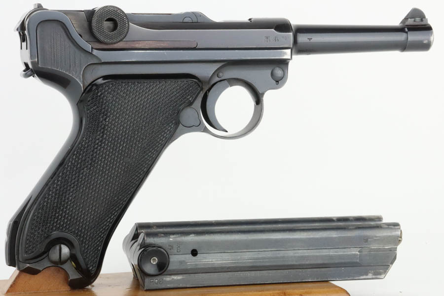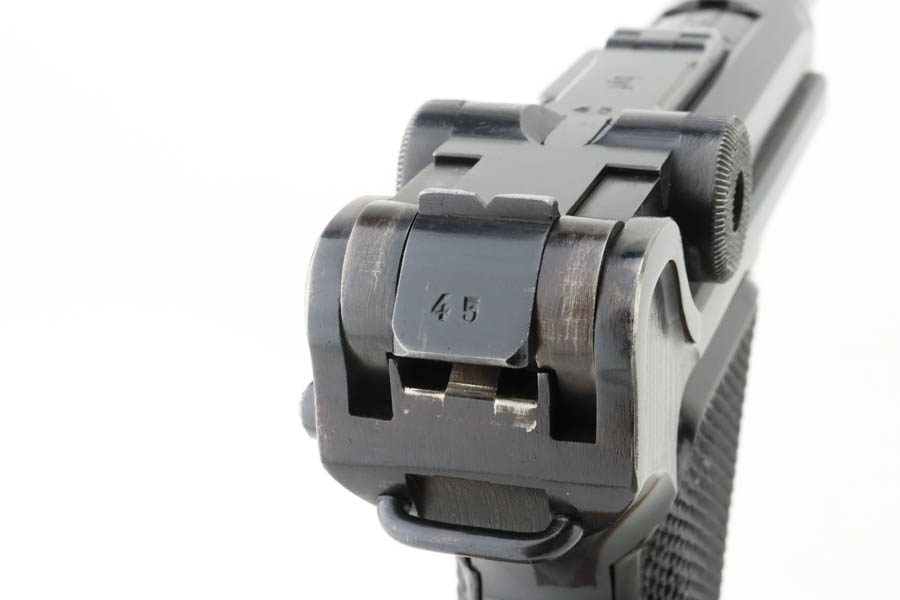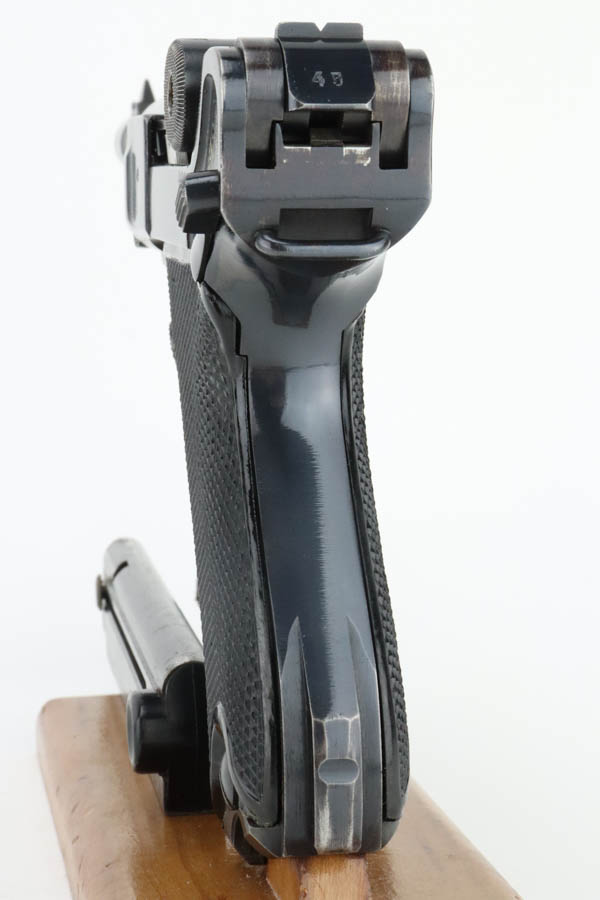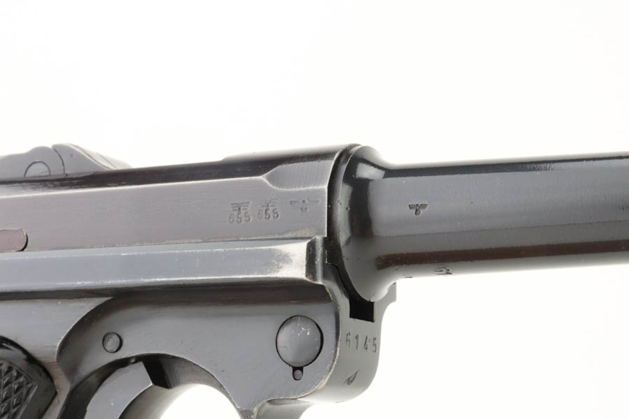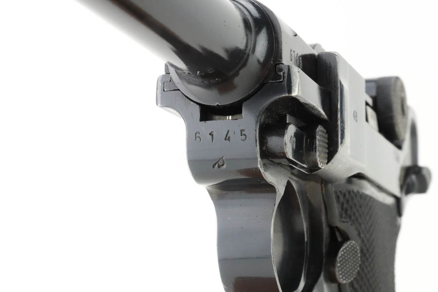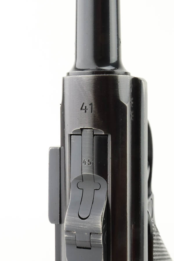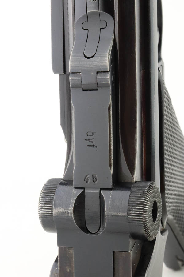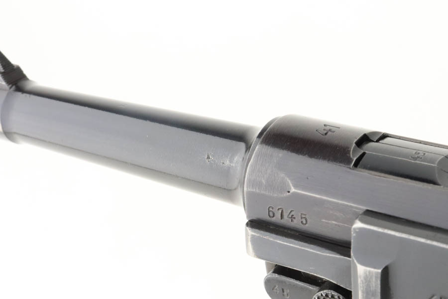 6/26/24 – This is an excellent example of a BYF 41 “Black Widow” Mauser Luger issued to the German military in 1941. It is all matching, has the proper “Eagle 655” military acceptance proofs, and fitted with an excellent set of original “Black Widow” bakelite grips. It comes as a rig with two original “Black Widow” magazines, an “Eagle 655” tool, and a minty 1941-dated holster. The gun itself has retained about 96% of its original finish with very minor high edge and muzzle wear. The bore is mostly shiny with strong rifling, but there is some light freckling in the grooves.