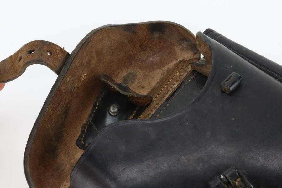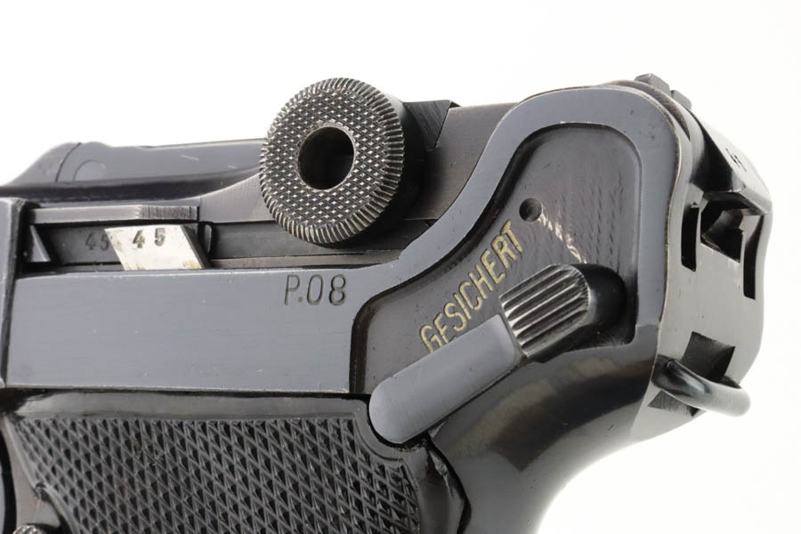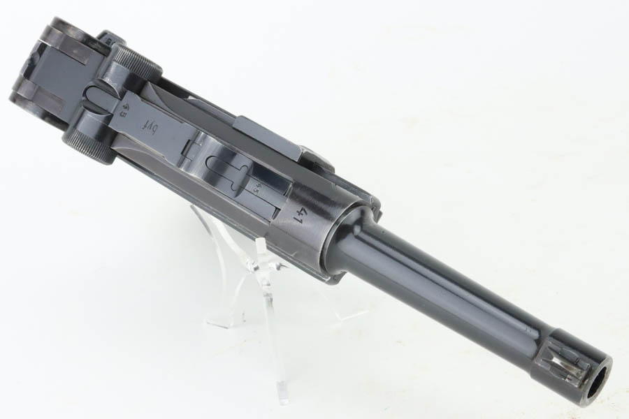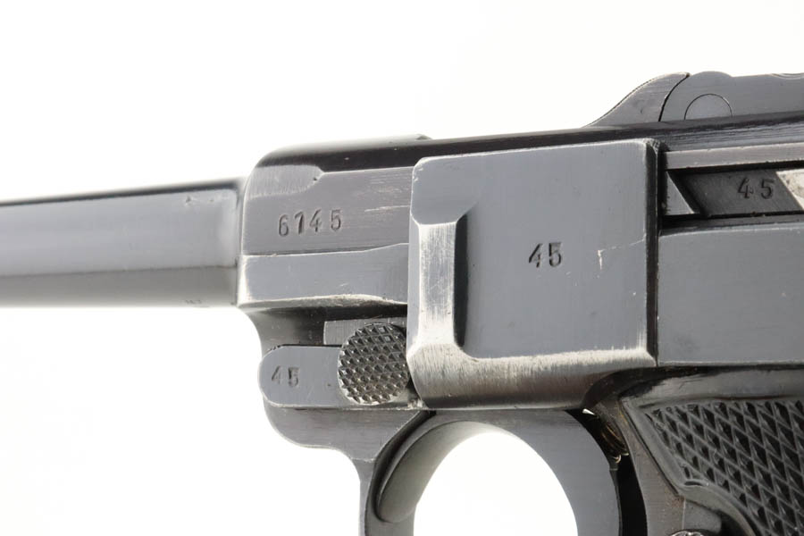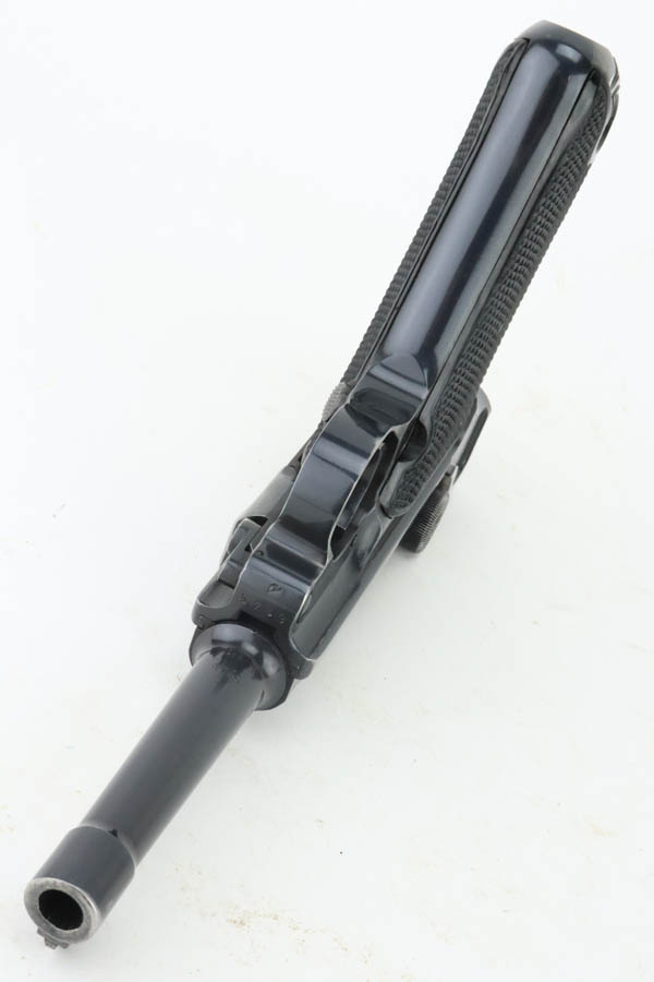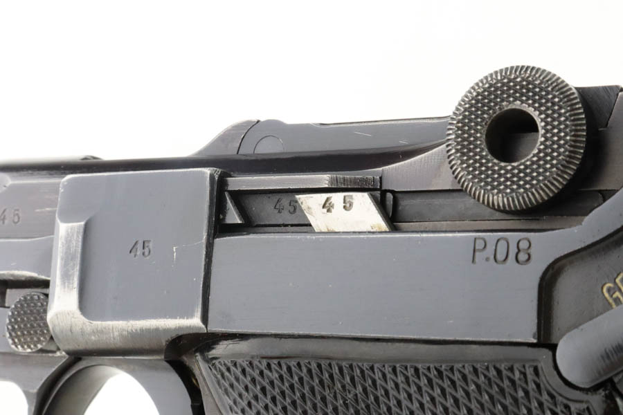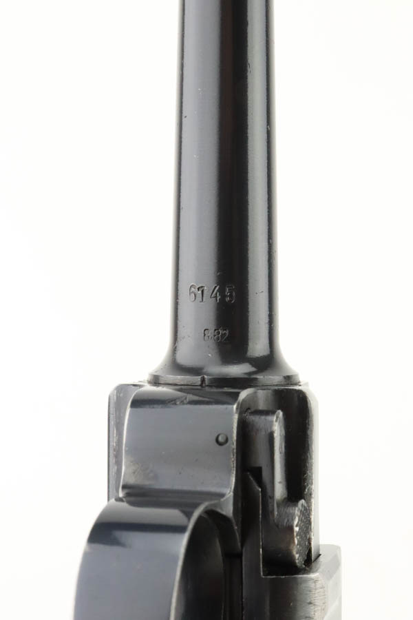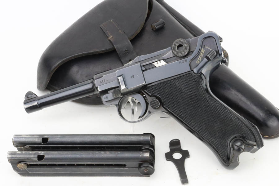 6/26/24 – This is an excellent example of a BYF 41 “Black Widow” Mauser Luger issued to the German military in 1941. It is all matching, has the proper “Eagle 655” military acceptance proofs, and fitted with an excellent set of original “Black Widow” bakelite grips. It comes as a rig with two original “Black Widow” magazines, an “Eagle 655” tool, and a minty 1941-dated holster. The gun itself has retained about 96% of its original finish with very minor high edge and muzzle wear. The bore is mostly shiny with strong rifling, but there is some light freckling in the grooves.