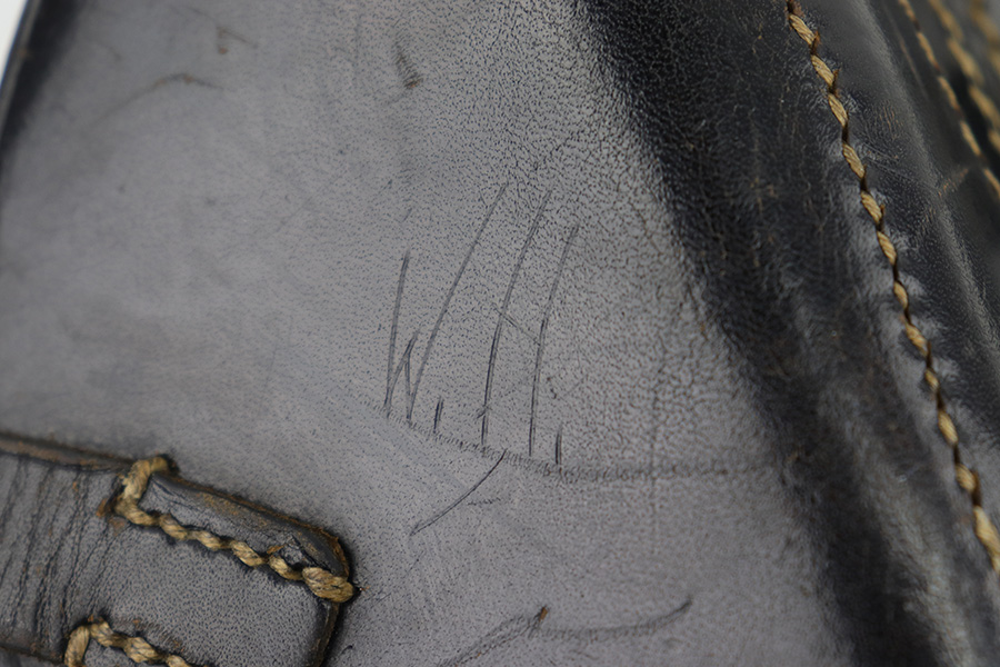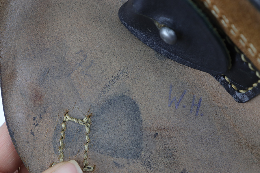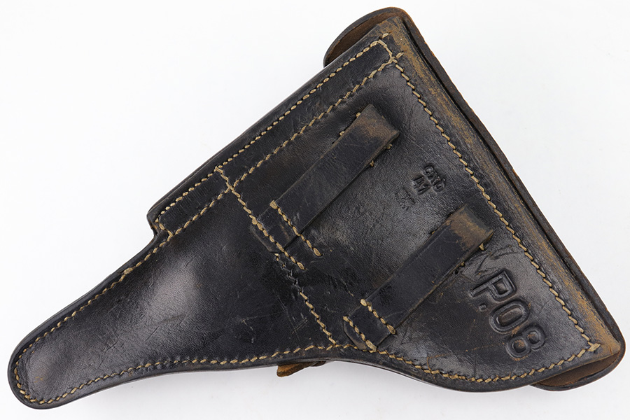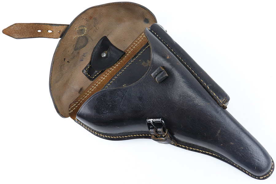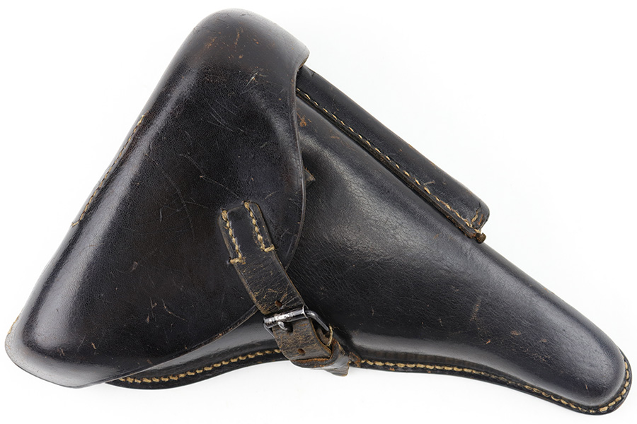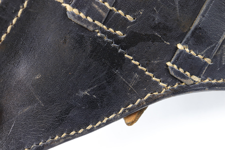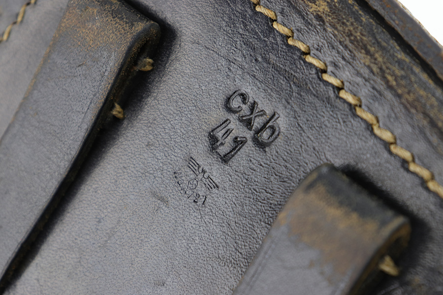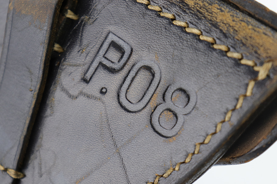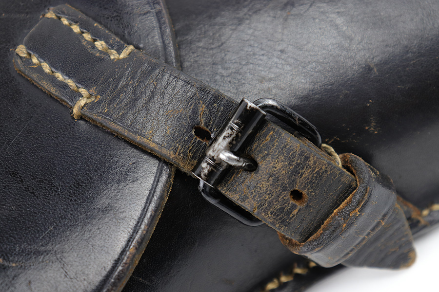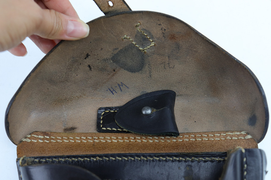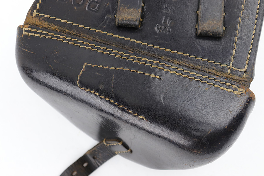7/6/23 – This is a holster for a BYF 41 or 42 “black widow” luger. The maker is Joseph Moll and it is dated 1941. “P.08” marking on the back along with proper Waffen stamp. All markings are crisp and easily visible. Excellent black dyed leather. White thread stitching is intact and original throughout. Leather is soft and pliable with nice overall shape. Inside the leather is clean and pull up strap intact. The exterior leather has minor dings and scrapes from minor use wear. Overall this is an excellent condition WW2 era holster that is getting much harder to find in this condition.