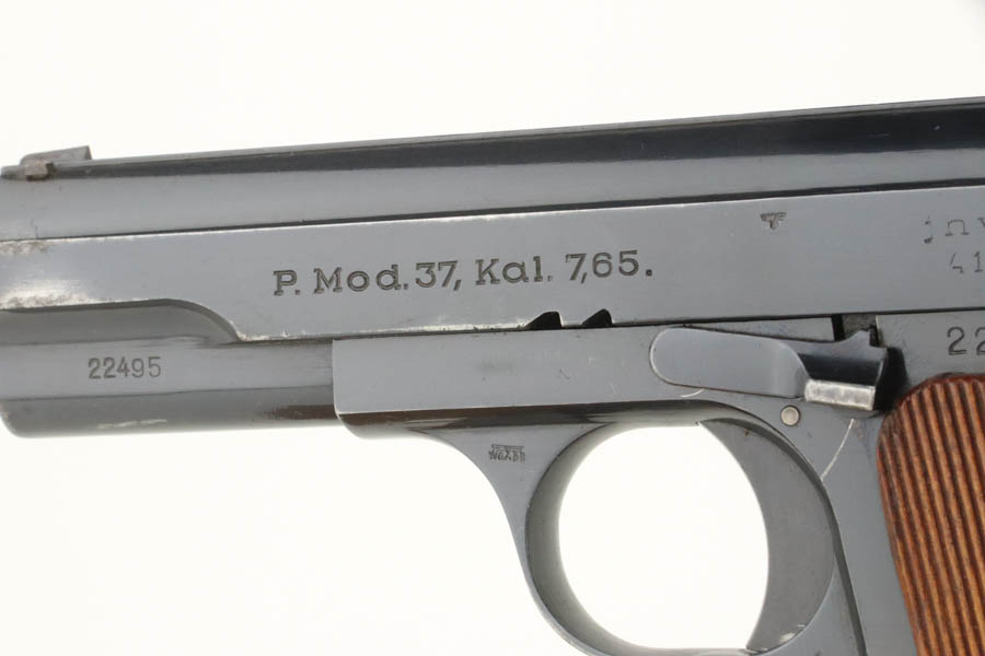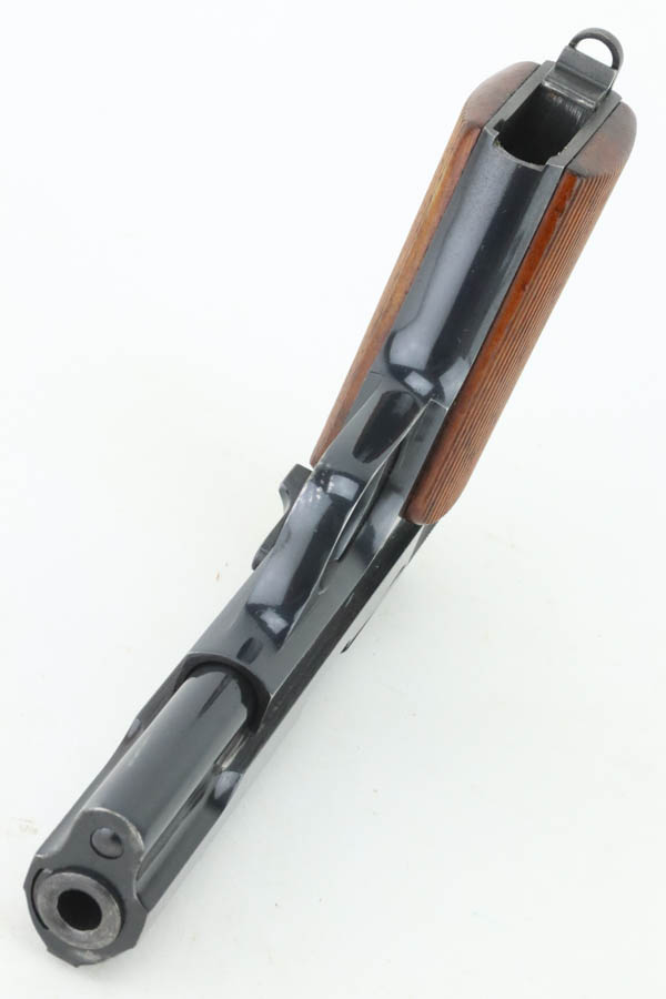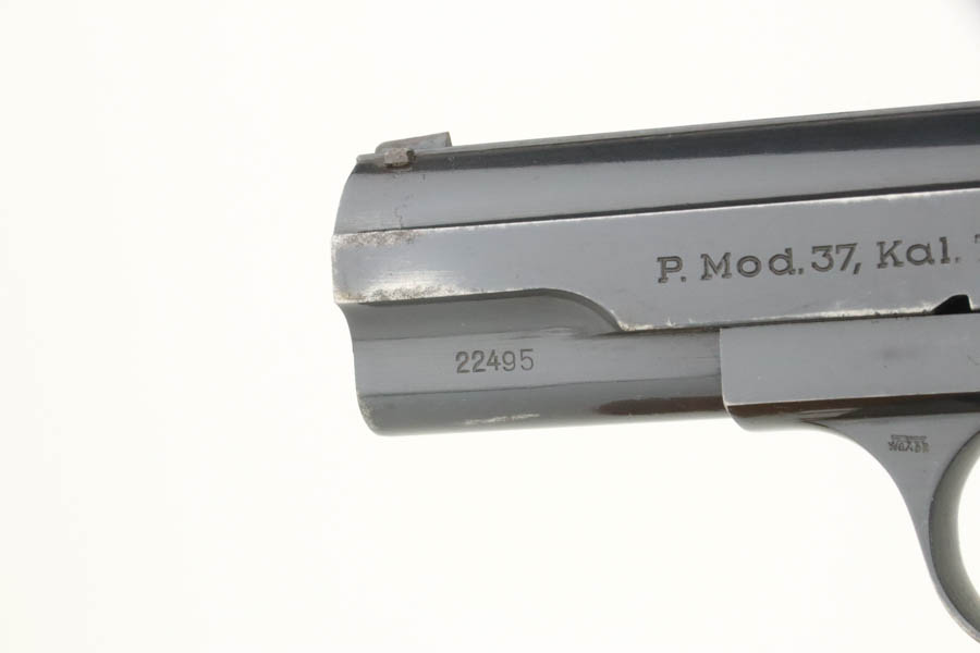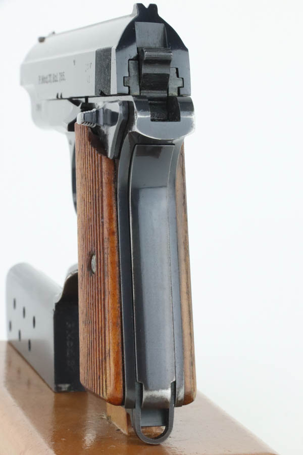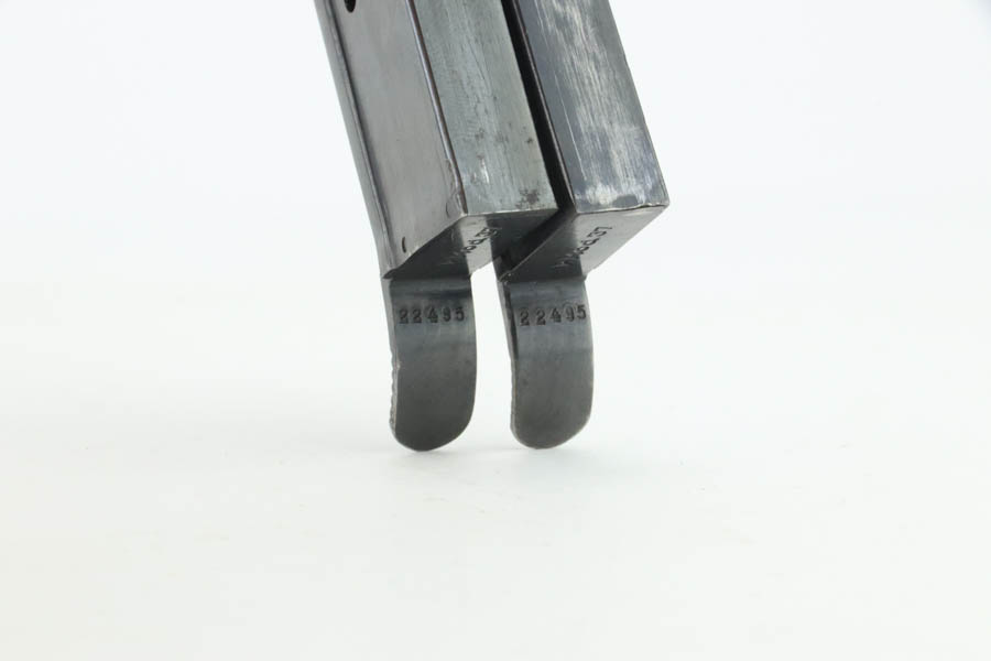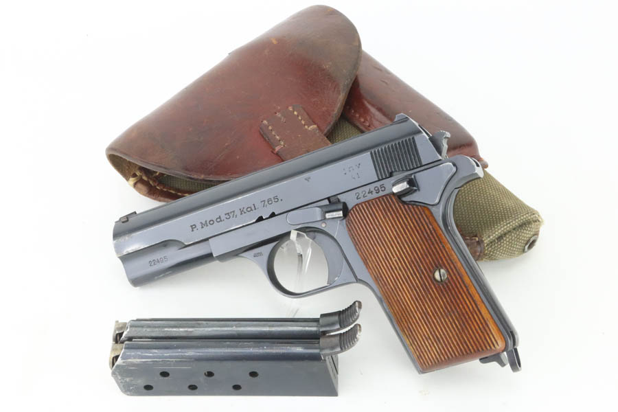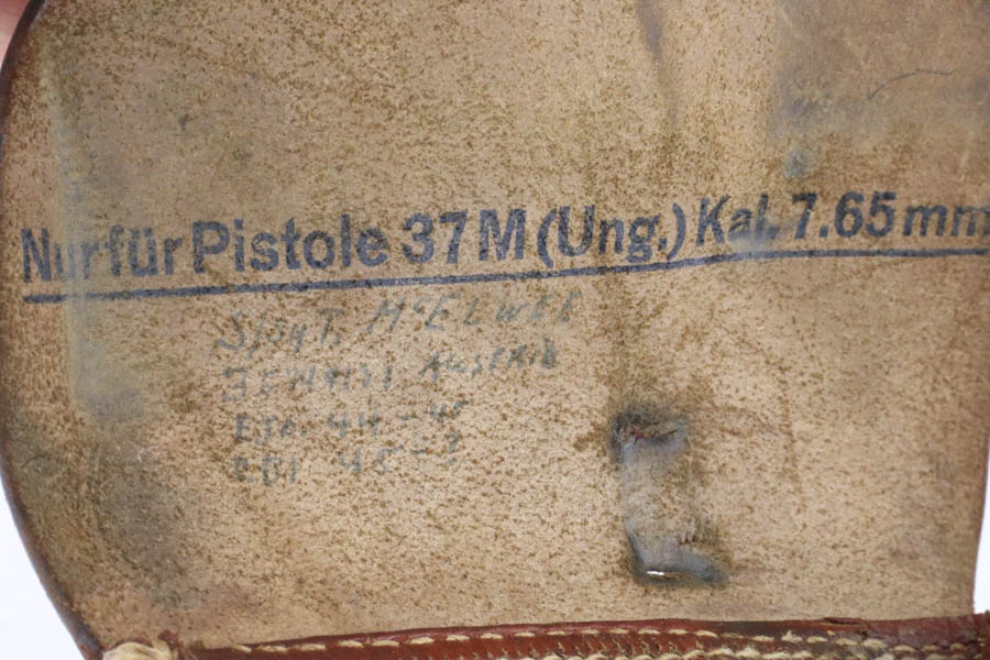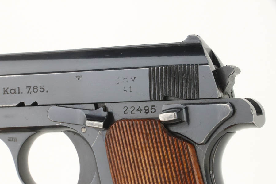 8/7/24 – This is an excellent example of a Femaru Model 37 issued to the Luftwaffe in 1941. All matching with the proper Waffen proof on the left side of the trigger guard. It comes as a rig with two original matching-numbered magazines and a very nice 1941-dated tropical holster (clear ink stamp on the inside). The gun itself has retained about 97% of its original high polish finish. One small spot of wear and pin-pricking on the left side of the muzzle. Fitted with excellent wood grips. Very nice bore with great rifling and just very light frosting in the grooves.