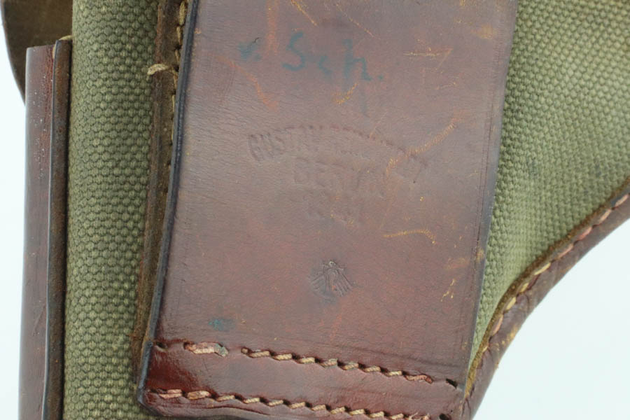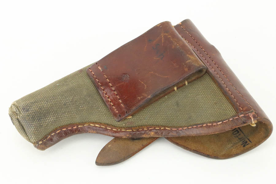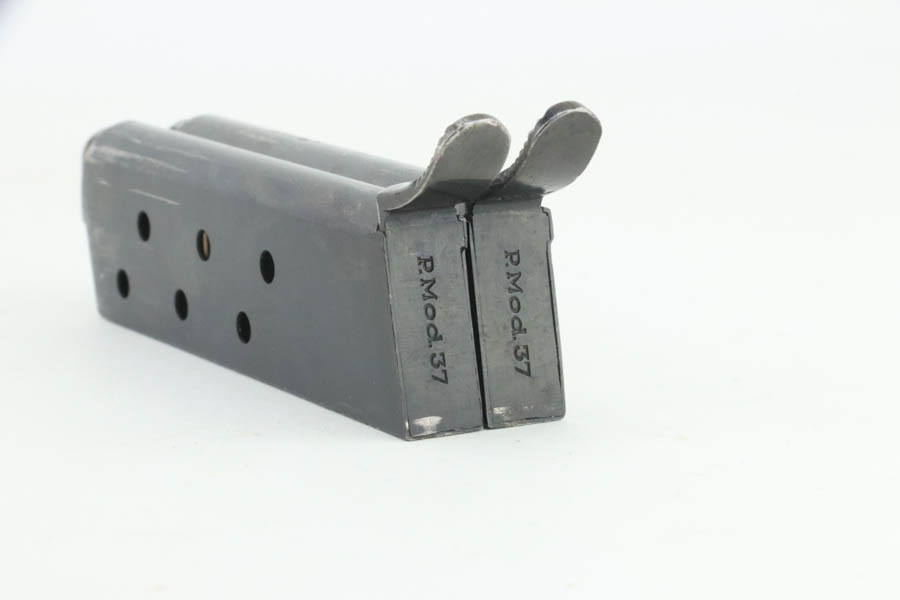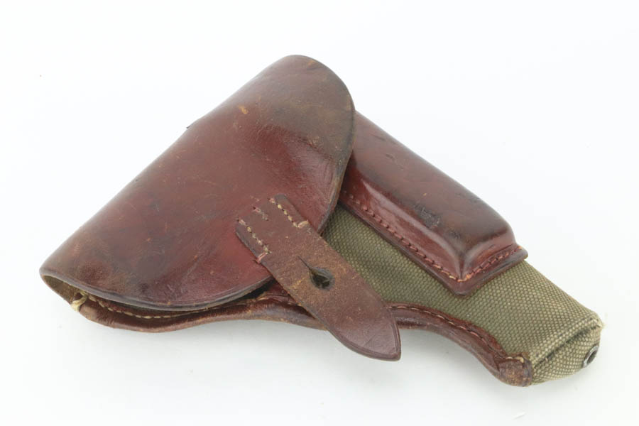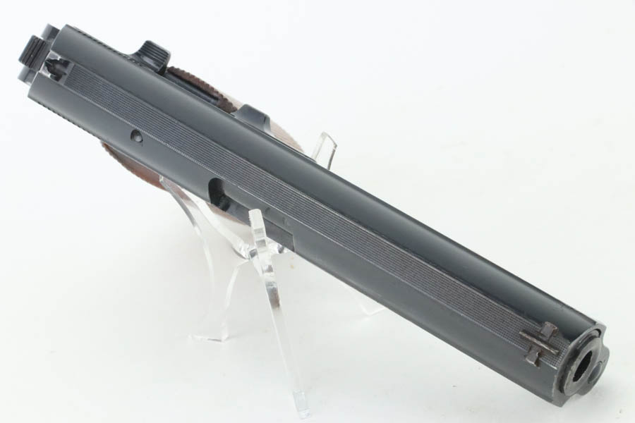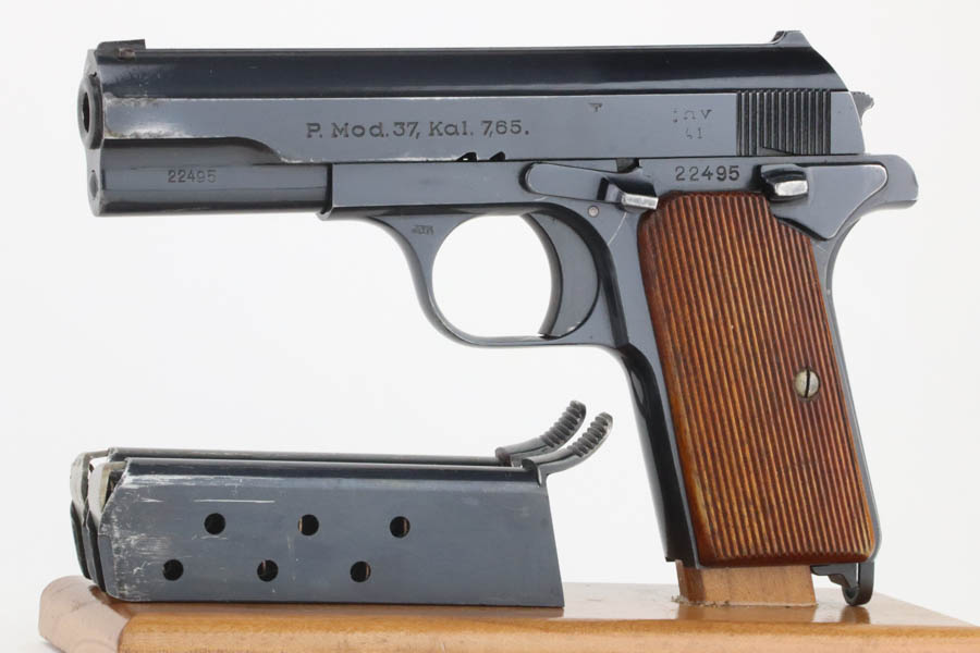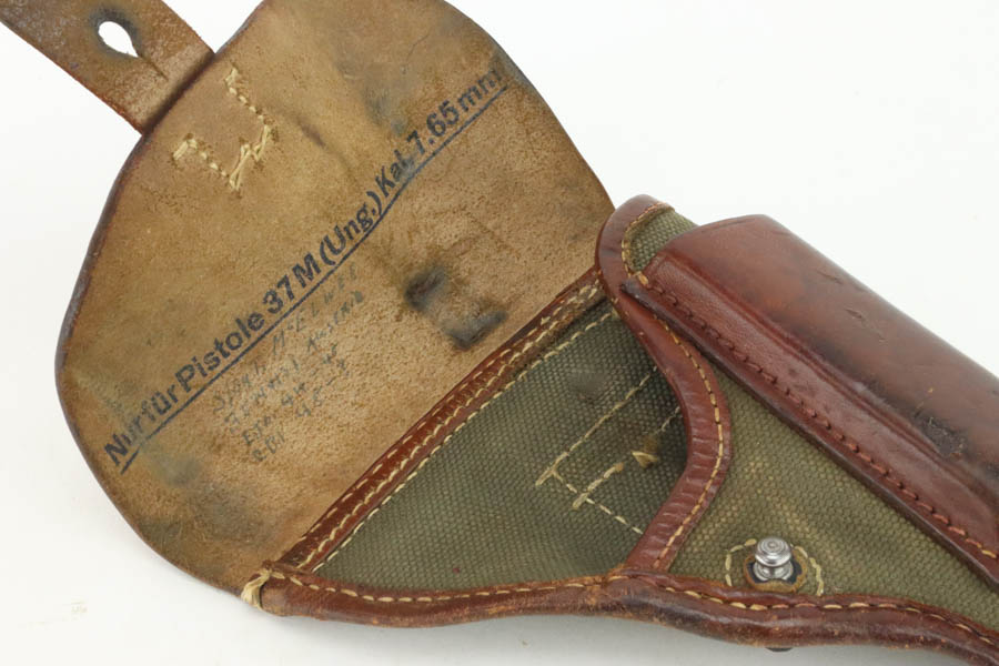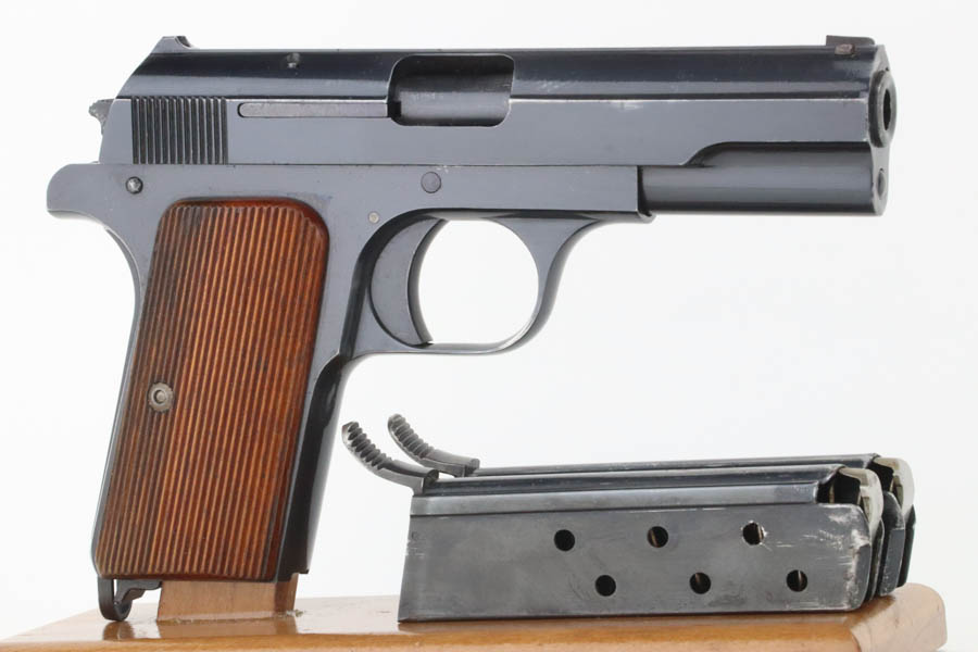 8/7/24 – This is an excellent example of a Femaru Model 37 issued to the Luftwaffe in 1941. All matching with the proper Waffen proof on the left side of the trigger guard. It comes as a rig with two original matching-numbered magazines and a very nice 1941-dated tropical holster (clear ink stamp on the inside). The gun itself has retained about 97% of its original high polish finish. One small spot of wear and pin-pricking on the left side of the muzzle. Fitted with excellent wood grips. Very nice bore with great rifling and just very light frosting in the grooves.