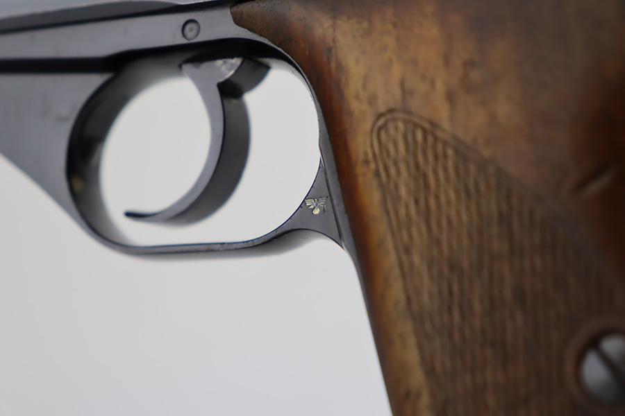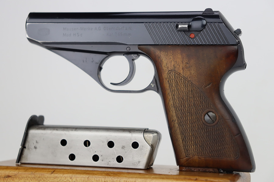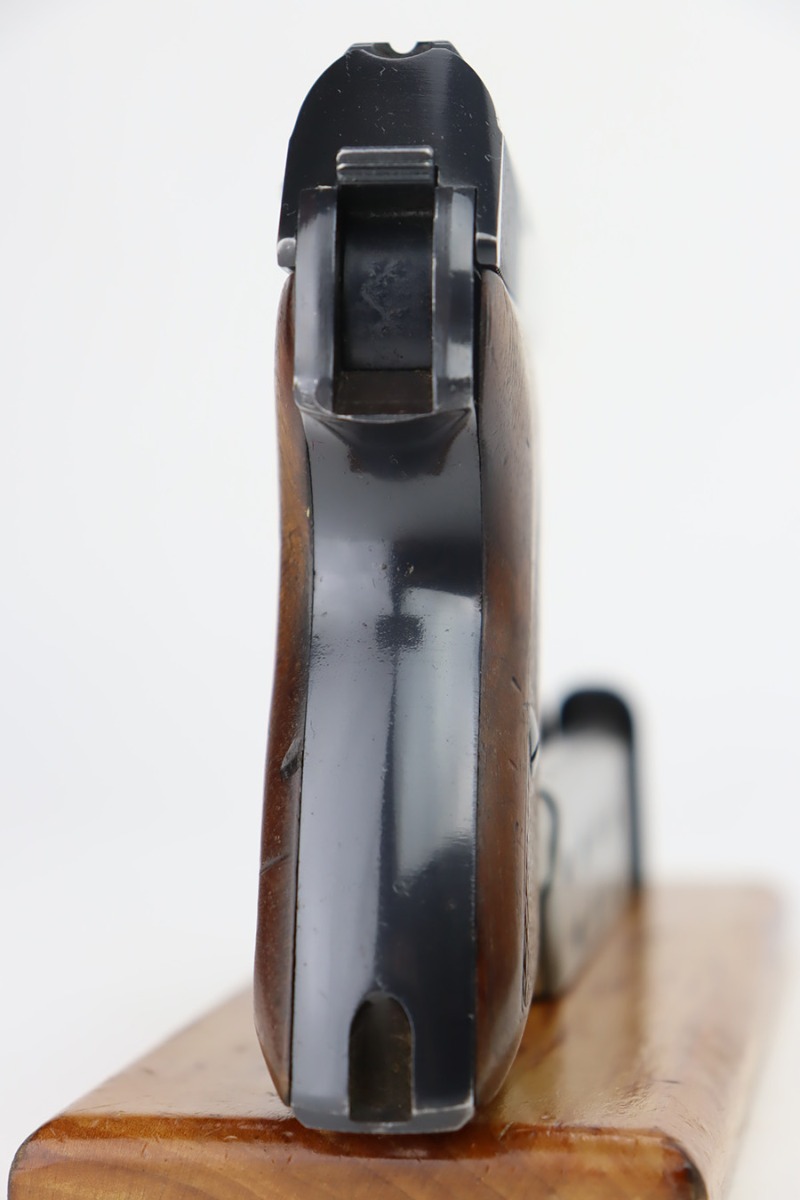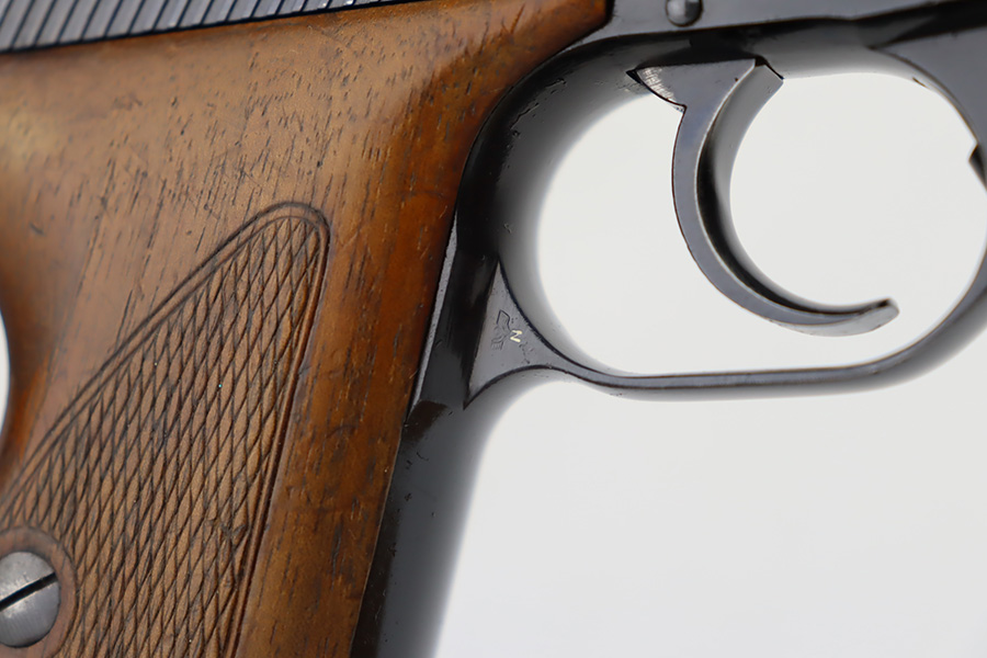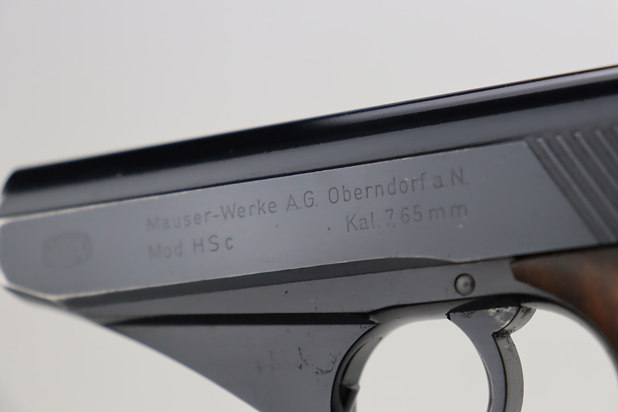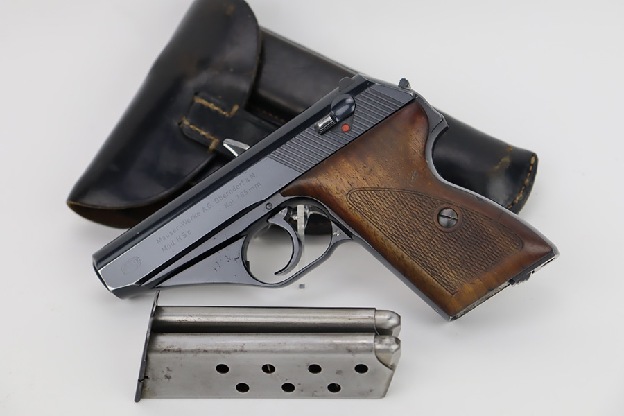 9/25/23 – This is an excellent example of a Mauser HSC issued to the Nazi police force in 1941. It is all matching and has the proper “Eagle L” police proof on the trigger guard. It comes as a rig with a really nice 1941-dated police holster and two Mauser banner magazines. The gun itself has retained about 97% of its original high polish finish. Just some very minor muzzle wear, a few light scratches on the right side of the slide, and one small area of very light freckling on the front strap. Very nice period-correct wood grips. Mint bore.