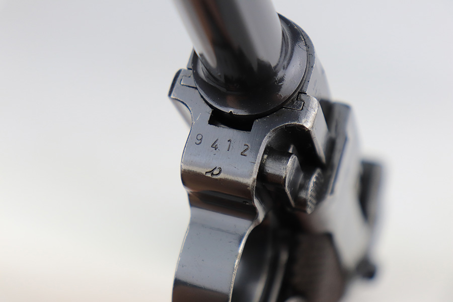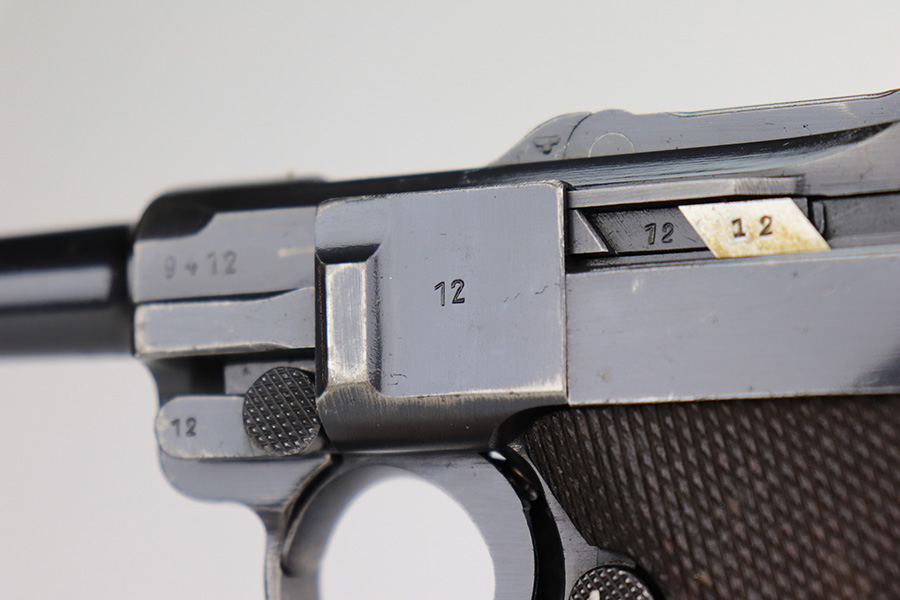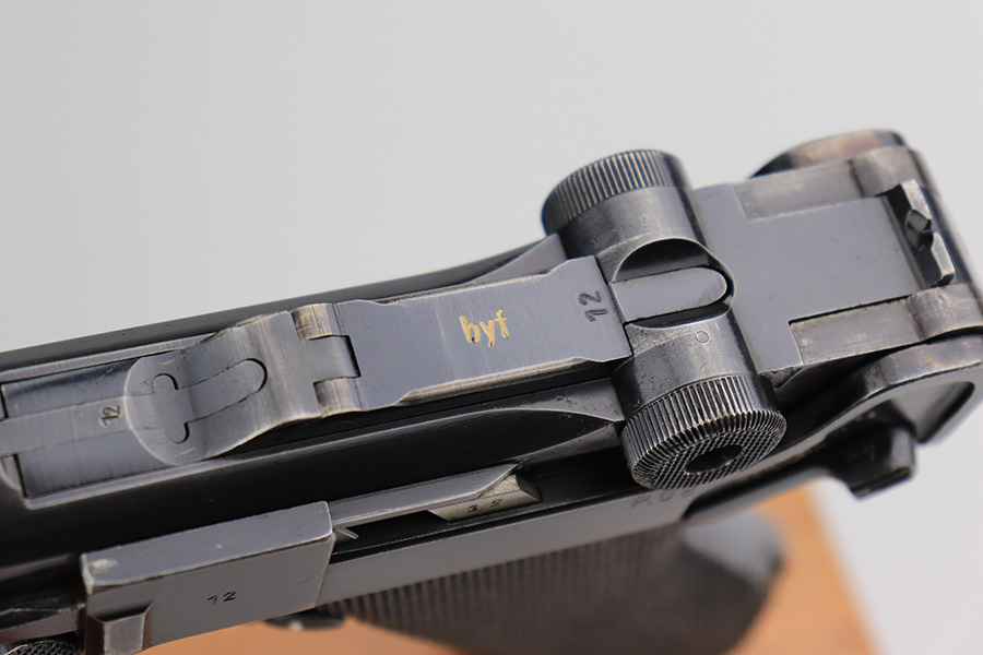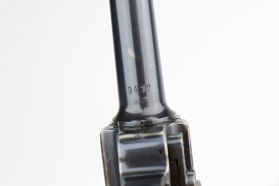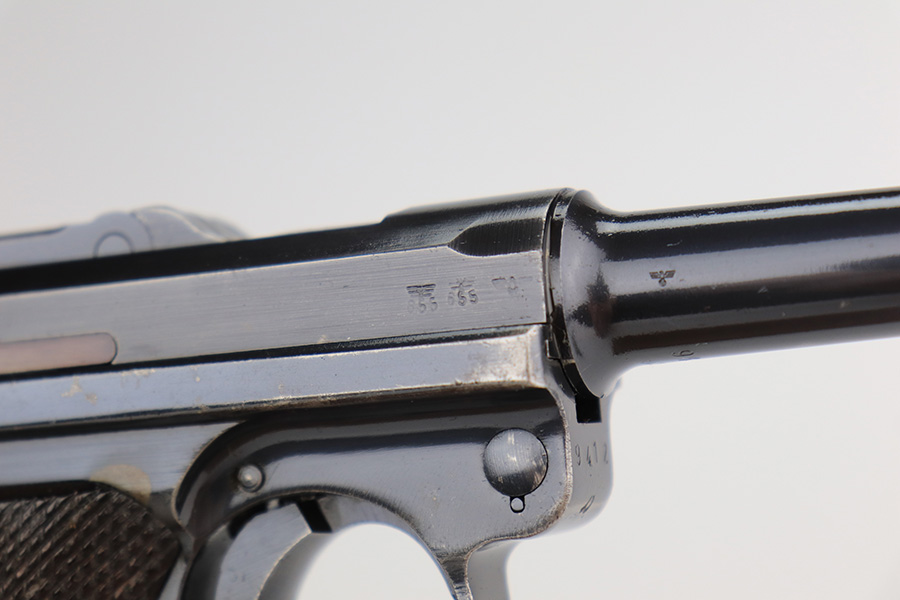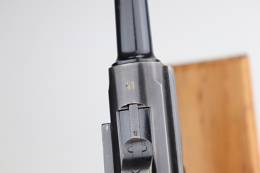 1/11/23 – This is an excellent example of a BYF 41 Mauser Luger issued to the Nazi military in 1941. It is all matching and has the proper “Eagle 655” military acceptance proofs. It has retained about 96% of its original finish. There is very minor wear around the muzzle, on the side plate, and on the side rails. Minor wear at the base of both grip straps. A small area of very light scratching on the left side of the barrel. A few tiny dots of discoloration on the back strap and on the right side of the frame. Fitted with an excellent set of matching-numbered, “Eagle 655” proofed wood grips. Comes with a period-correct magazine that is not matching to the gun. The bore is shiny with strong rifling, but there is light freckling throughout.