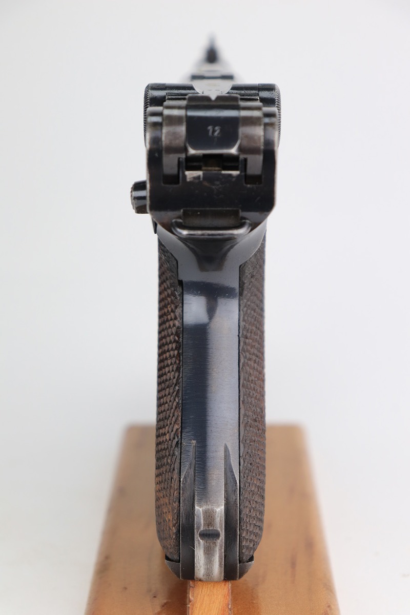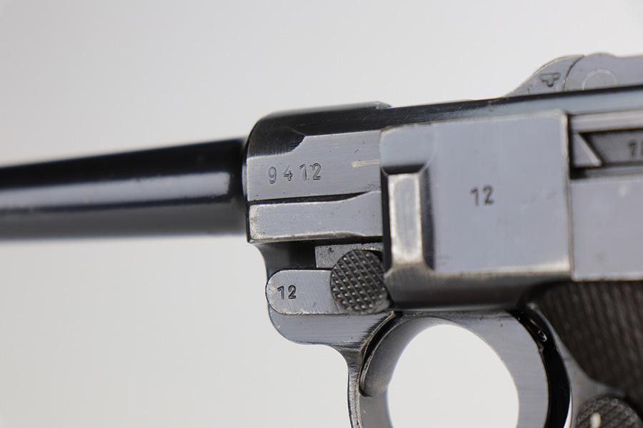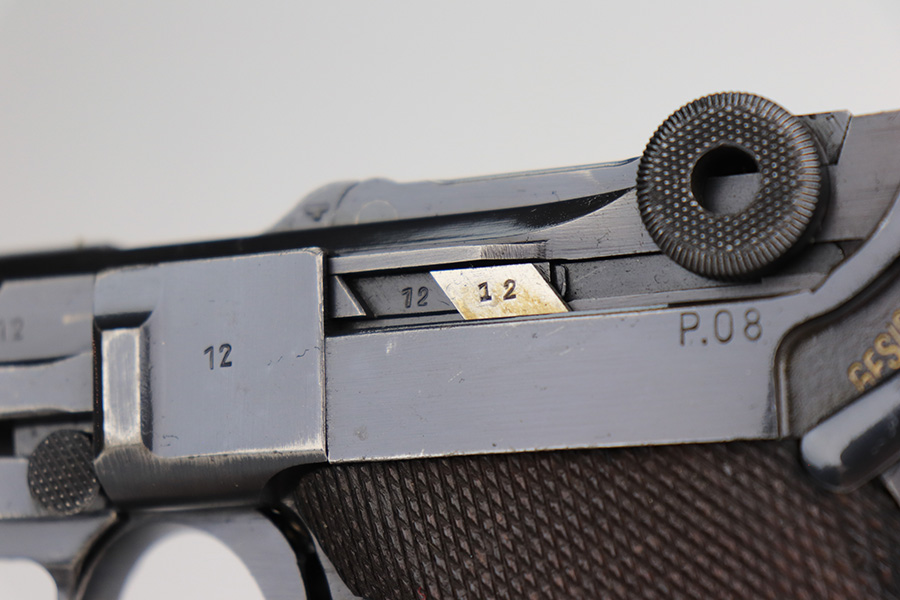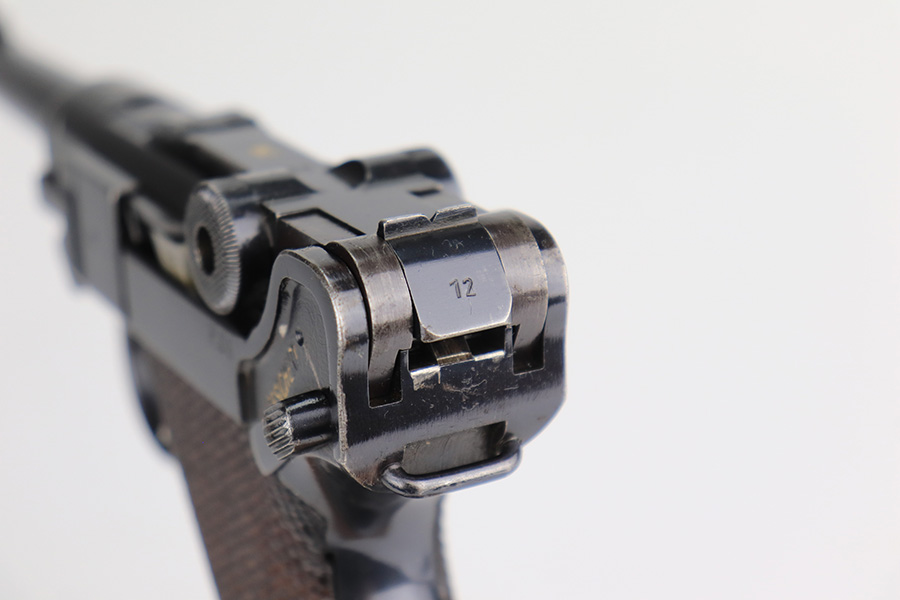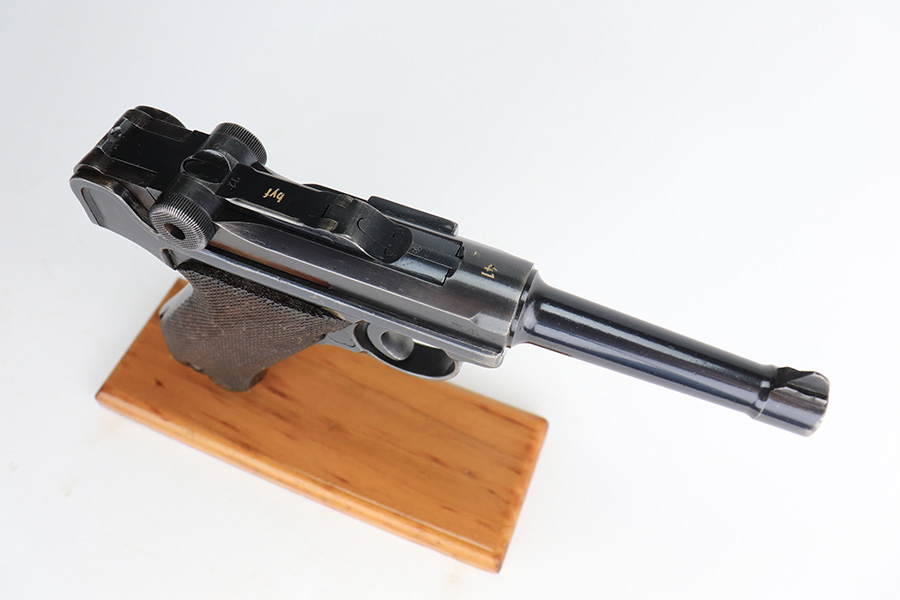 1/11/23 – This is an excellent example of a BYF 41 Mauser Luger issued to the Nazi military in 1941. It is all matching and has the proper “Eagle 655” military acceptance proofs. It has retained about 96% of its original finish. There is very minor wear around the muzzle, on the side plate, and on the side rails. Minor wear at the base of both grip straps. A small area of very light scratching on the left side of the barrel. A few tiny dots of discoloration on the back strap and on the right side of the frame. Fitted with an excellent set of matching-numbered, “Eagle 655” proofed wood grips. Comes with a period-correct magazine that is not matching to the gun. The bore is shiny with strong rifling, but there is light freckling throughout.
