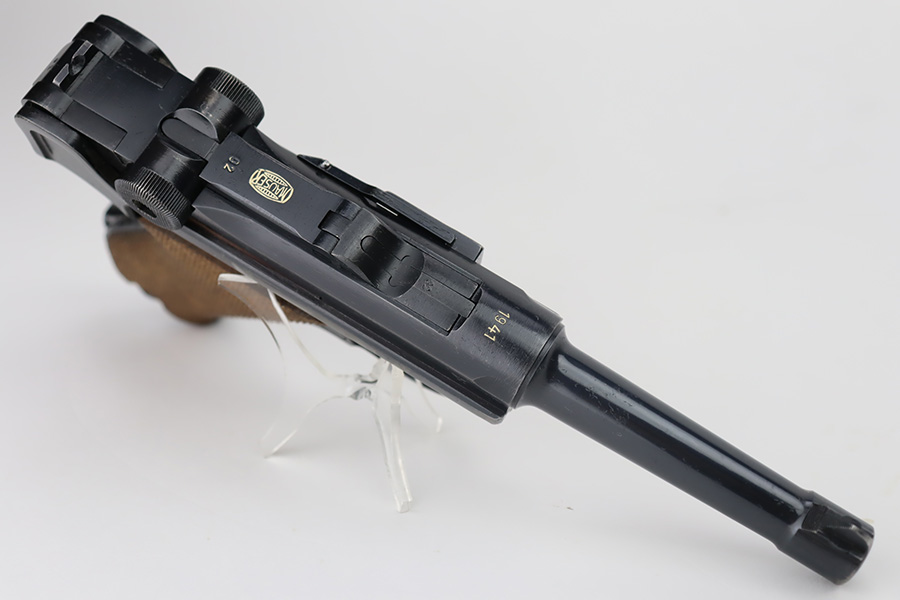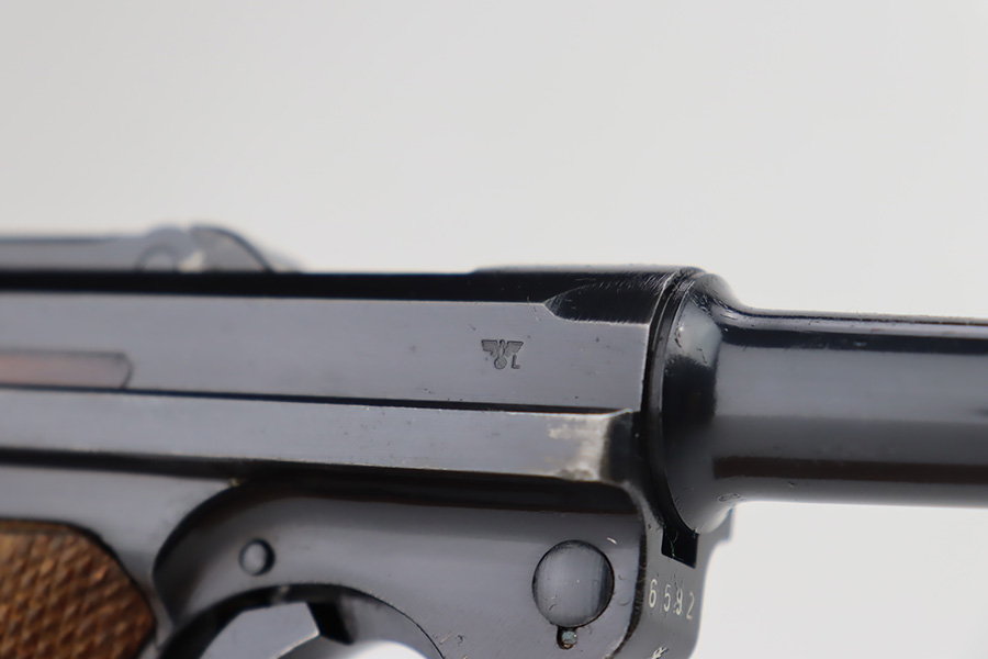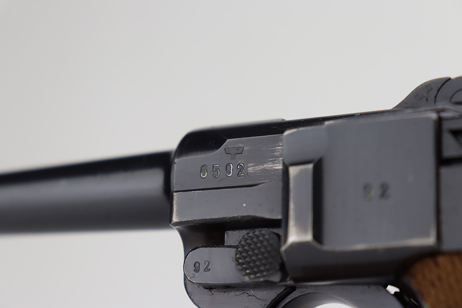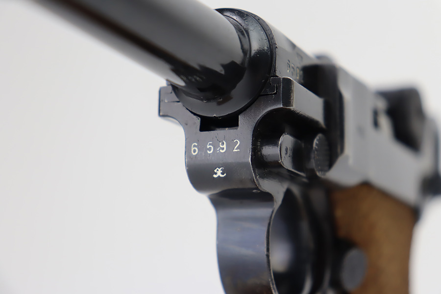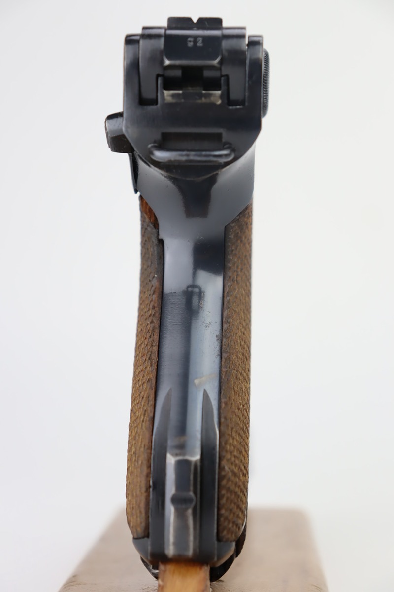 9/26/23 – This an excellent Mauser Luger issued to the Nazi police force in 1941. All matching with the proper police “Eagle L” proof and added police sear safety. Comes with an original matching magazine. The bluing rates about 96% with very minor wear around the muzzle and on the high edges. A few small spots of wear on the grip straps. Fitted with minty “Eagle 655” proofed grips – tiny chip in the upper corner of the left panel. Stone-mint bore.