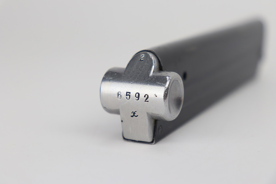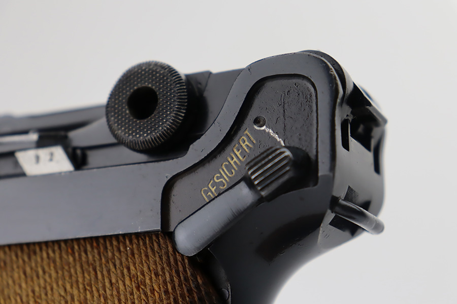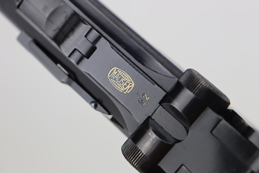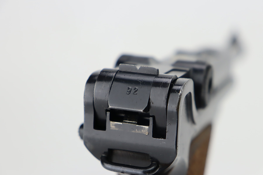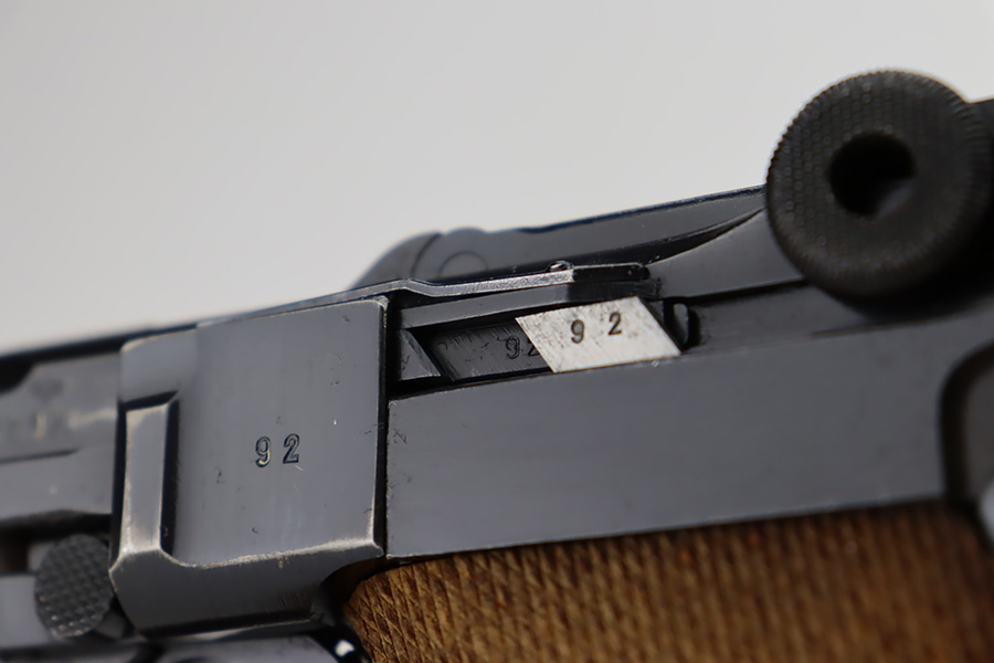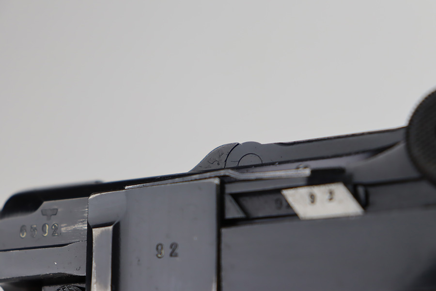 9/26/23 – This an excellent Mauser Luger issued to the Nazi police force in 1941. All matching with the proper police “Eagle L” proof and added police sear safety. Comes with an original matching magazine. The bluing rates about 96% with very minor wear around the muzzle and on the high edges. A few small spots of wear on the grip straps. Fitted with minty “Eagle 655” proofed grips – tiny chip in the upper corner of the left panel. Stone-mint bore.