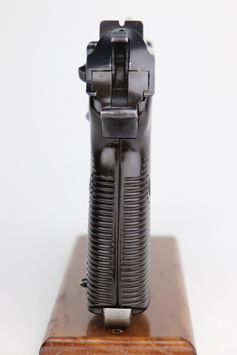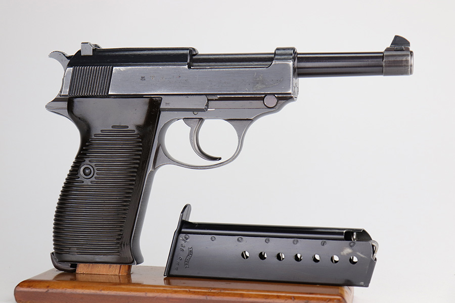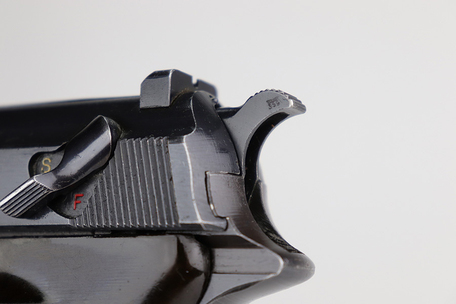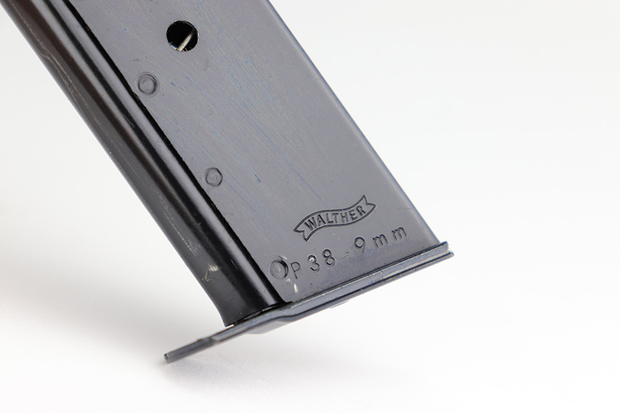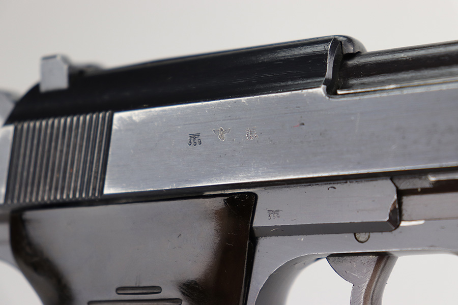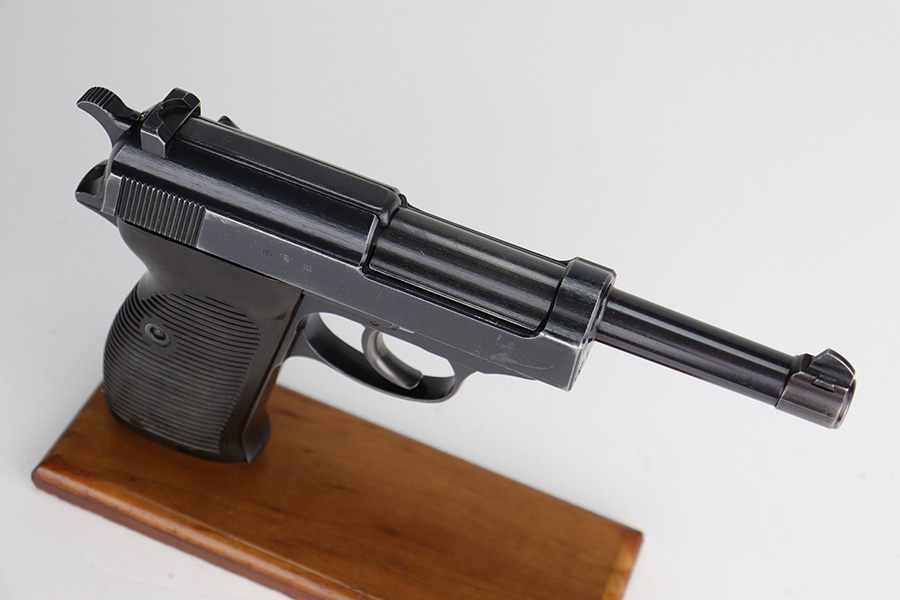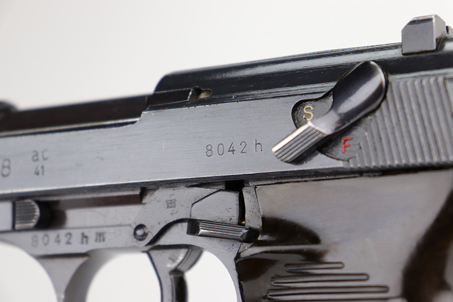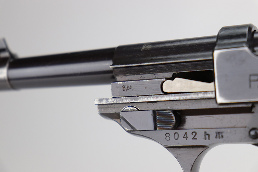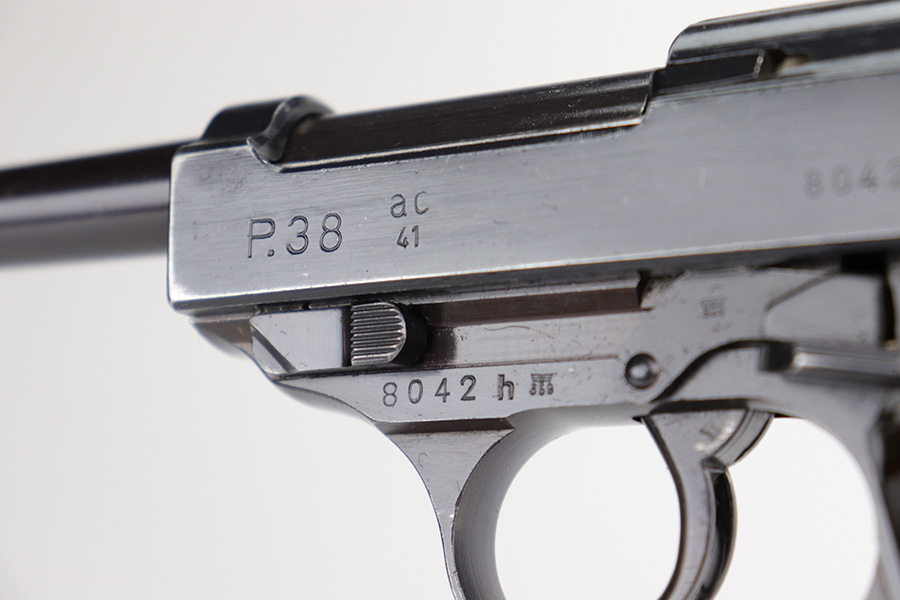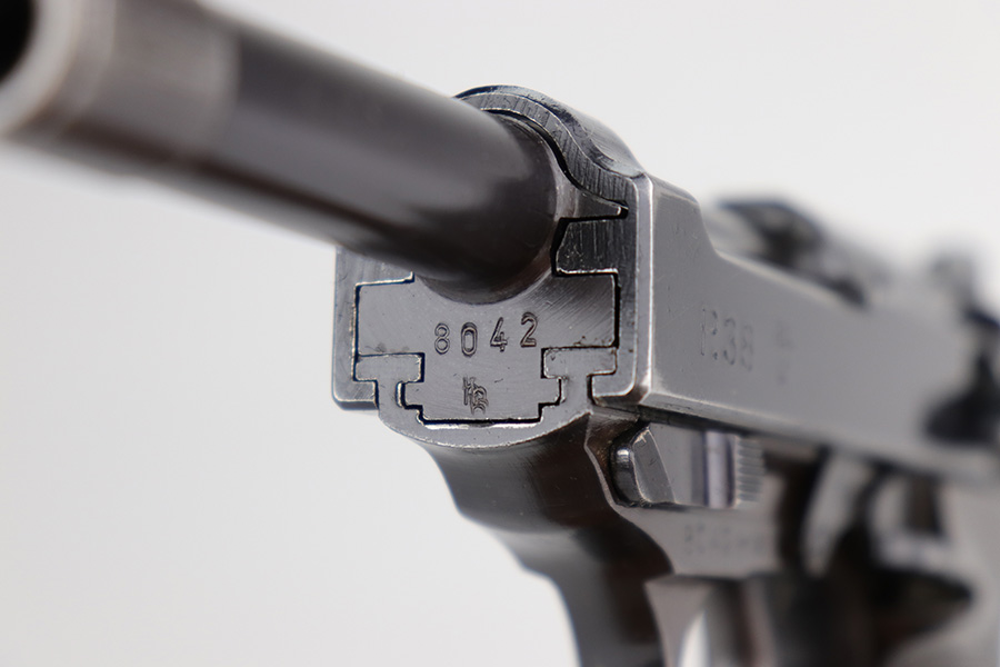 12/16/22 – This is an excellent example of an AC 41 Walther P.38 issued to the Nazi military in 1941. It is a second variant with no “ac” on the trigger guard. It has the proper “Eagle 359” Nazi military acceptance proofs throughout, even on the small parts. All numbered parts match, but the locking block is an unnumbered replacement. It has retained about 96-97% of its original finish. There is minor wear around the muzzle and along the slide, concentrated around the high edges. Some tiny handling marks here and there. Very minor thinning on the front strap. Comes with excellent “Eagle 359” proofed Walther grips and a post-war magazine. The bore has strong rifling, but there are some tiny pits in the grooves. De-cocker is functional.