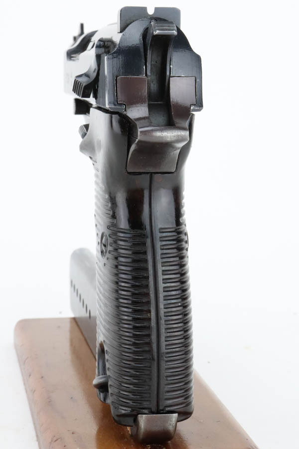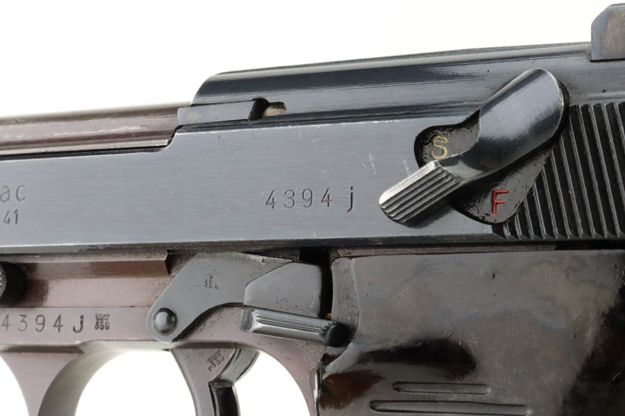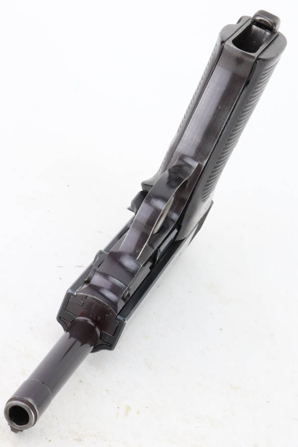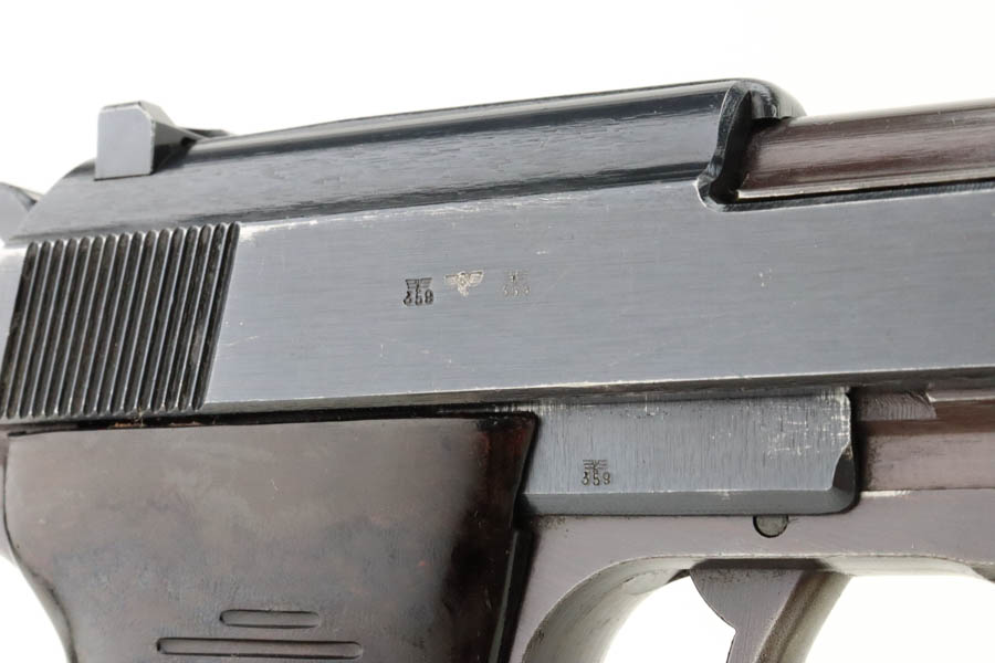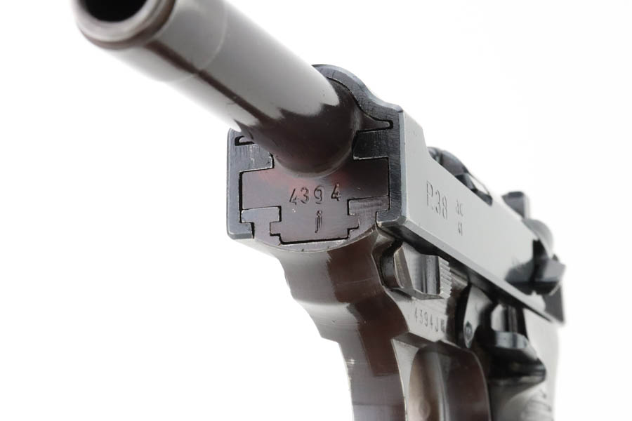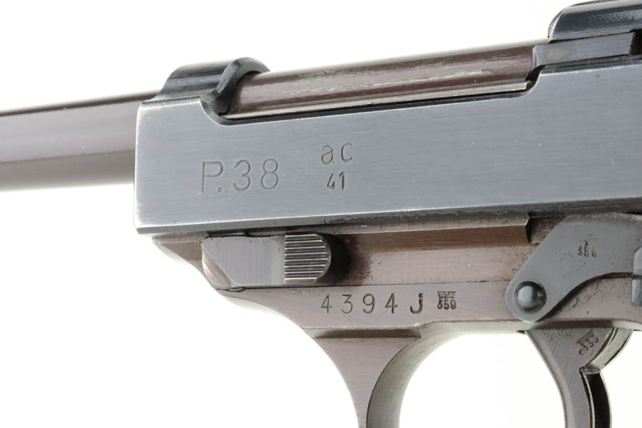 7/11/24 – This is an excellent example of an AC 41 Walther P.38 issued to the Nazi military in 1941. All matching with the proper “Eagle 359” military acceptance proofs throughout. Fitted with “Eagle 359” proofed Walther grips and comes with a numbered magazine that is not matching but in the same “j” serial block. The gun’s original finish rates about 96% with very minor muzzle and high edge wear and a hint of thinning on the front strap. Mint bore. De-cocker is functional.