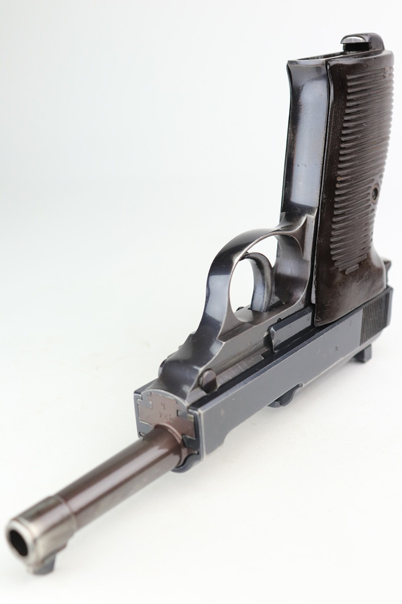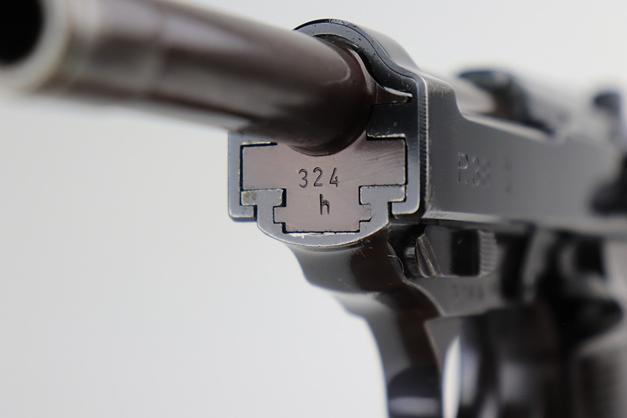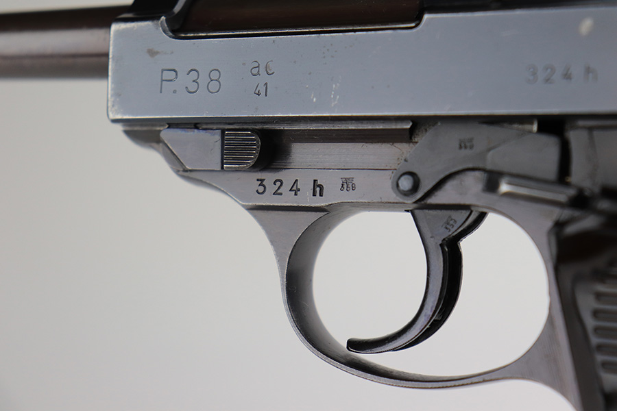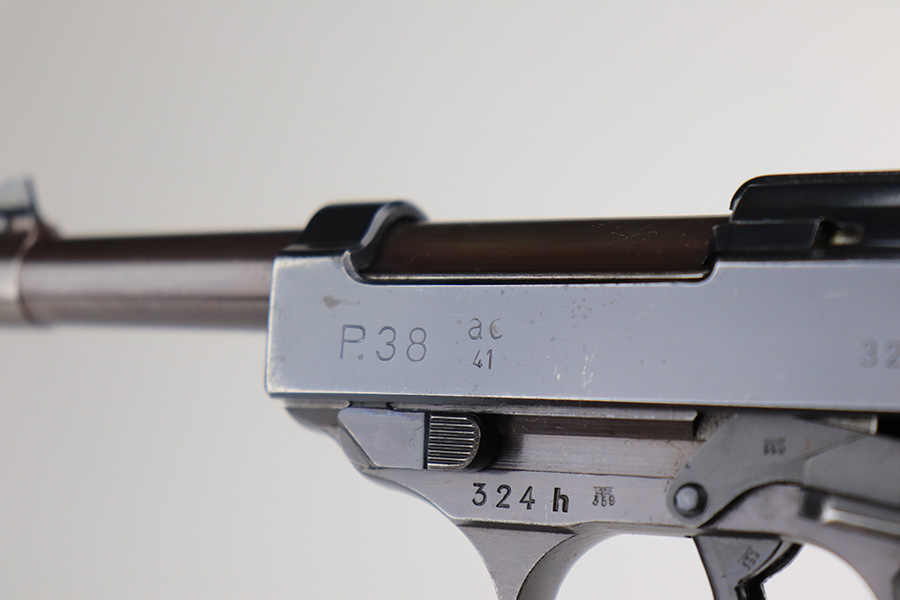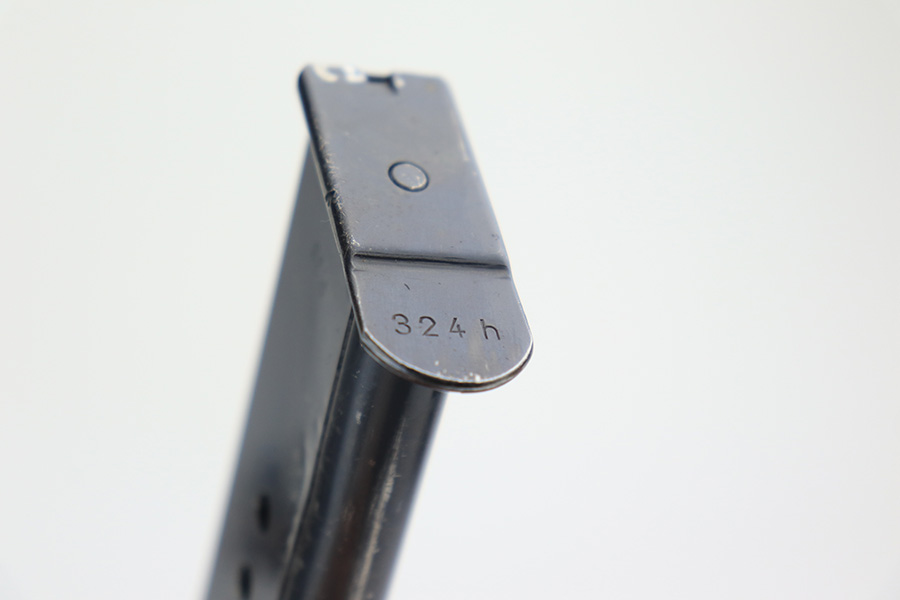 4/1/22 – This is an excellent Walther P.38 rig from 1941 with holster, spare magazine and one of the original, matching magazines. It’s an all matching, second variation example with ~94% of the high-polish blue remaining. Holster wear on the muzzle and front edges of the slide, and a little more on the front strap and trigger guard. Good mechanics, including de-cocker. The bore is tough to rate on this one as it’s very shiny with strong rifling, but a previous owner didn’t care for it well enough and there is pitting in the grooves. The strong rifling leads us to believe it would still be an accurate shooter. Excellent brown grips with E/359 markings inside. The spare mag is Mauser-made. The rig is complete with a very nice hardshell holster that has visible waffenamt and faint maker mark. Holster is 1943 dated.