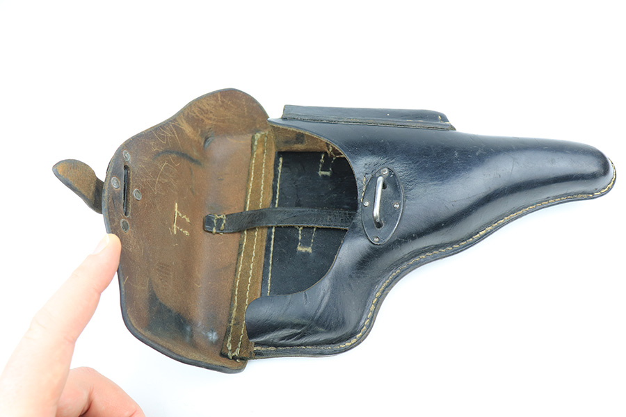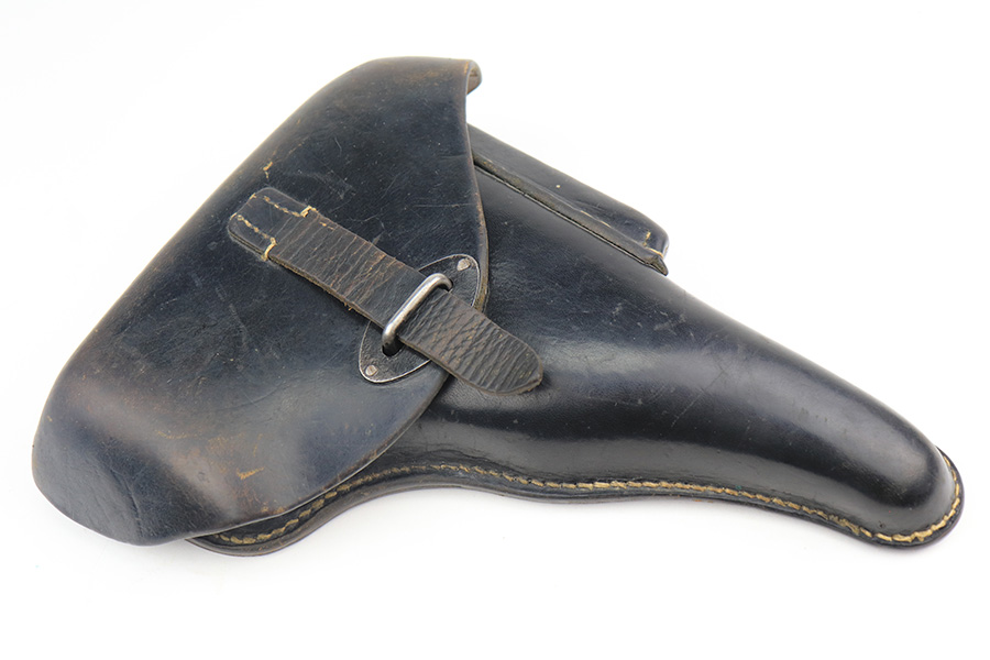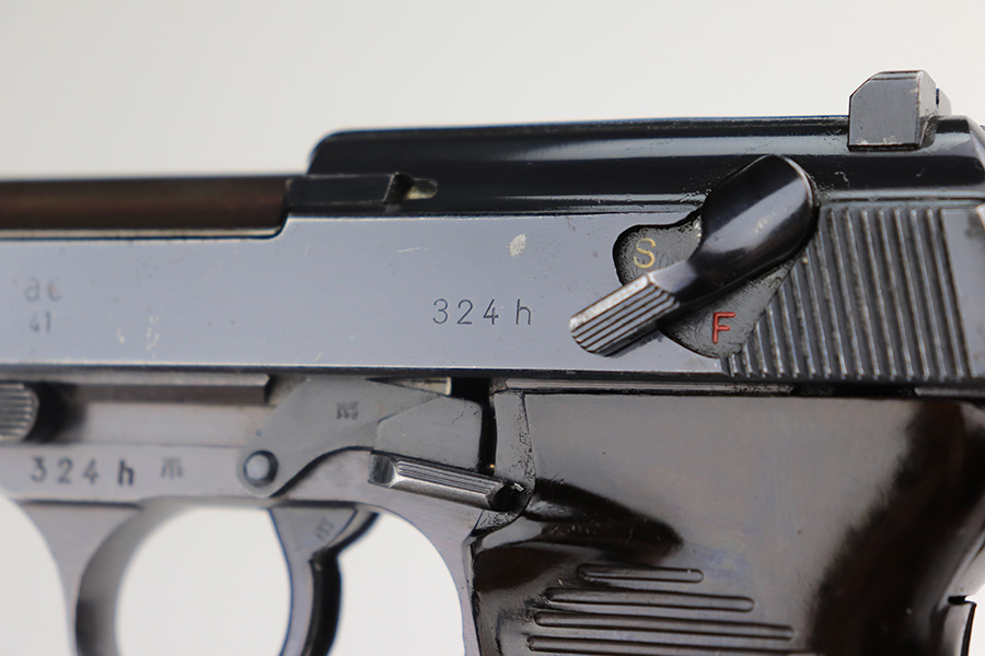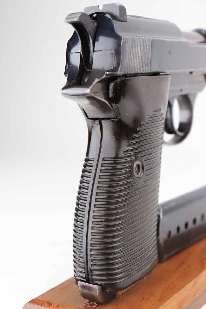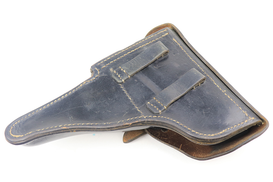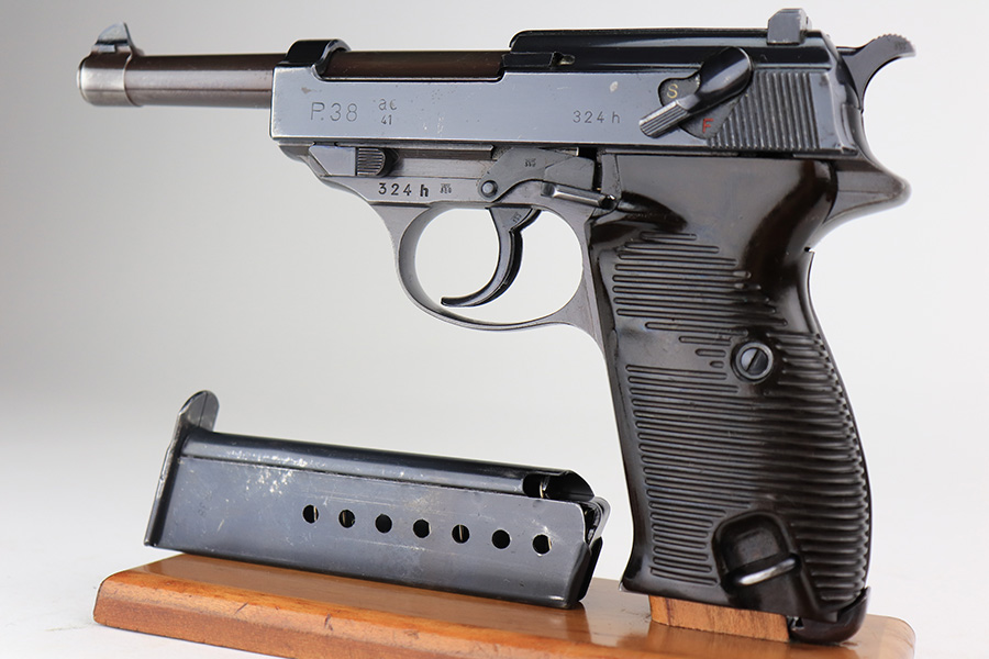 4/1/22 – This is an excellent Walther P.38 rig from 1941 with holster, spare magazine and one of the original, matching magazines. It’s an all matching, second variation example with ~94% of the high-polish blue remaining. Holster wear on the muzzle and front edges of the slide, and a little more on the front strap and trigger guard. Good mechanics, including de-cocker. The bore is tough to rate on this one as it’s very shiny with strong rifling, but a previous owner didn’t care for it well enough and there is pitting in the grooves. The strong rifling leads us to believe it would still be an accurate shooter. Excellent brown grips with E/359 markings inside. The spare mag is Mauser-made. The rig is complete with a very nice hardshell holster that has visible waffenamt and faint maker mark. Holster is 1943 dated.
