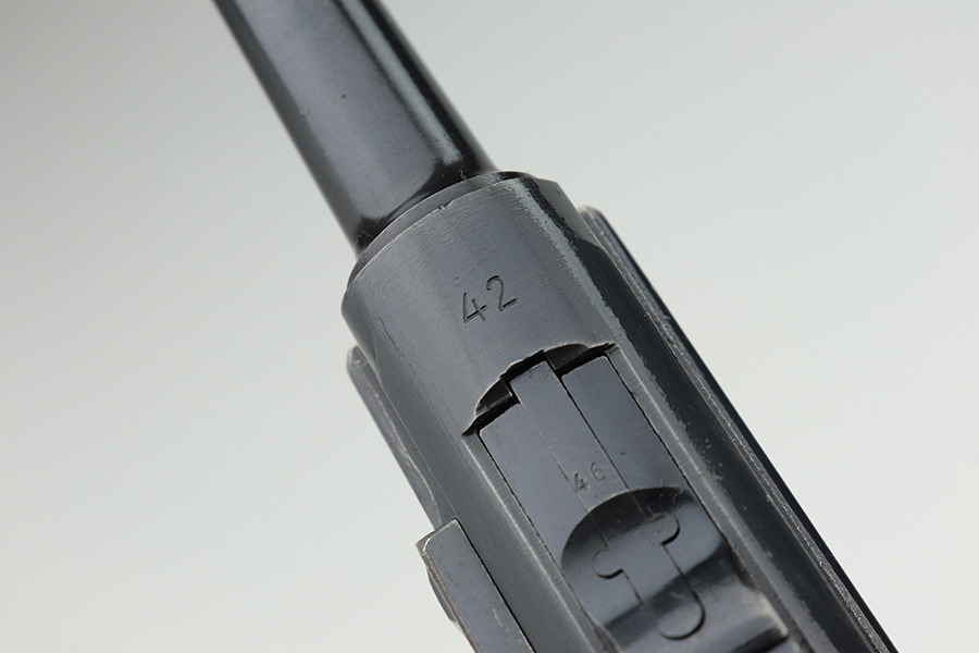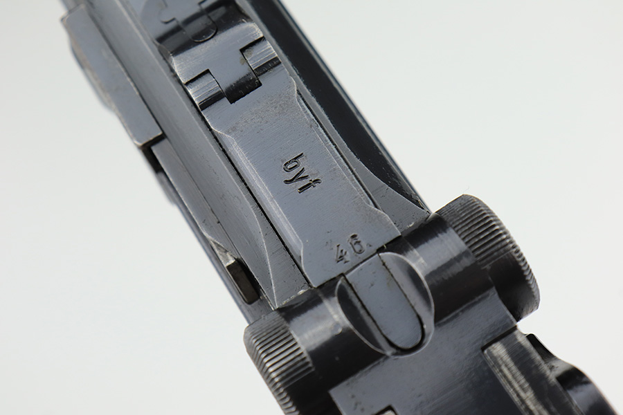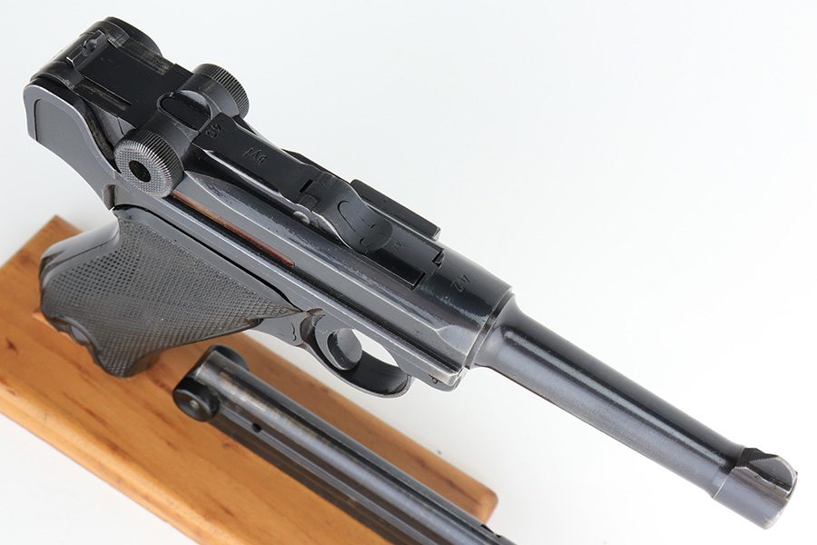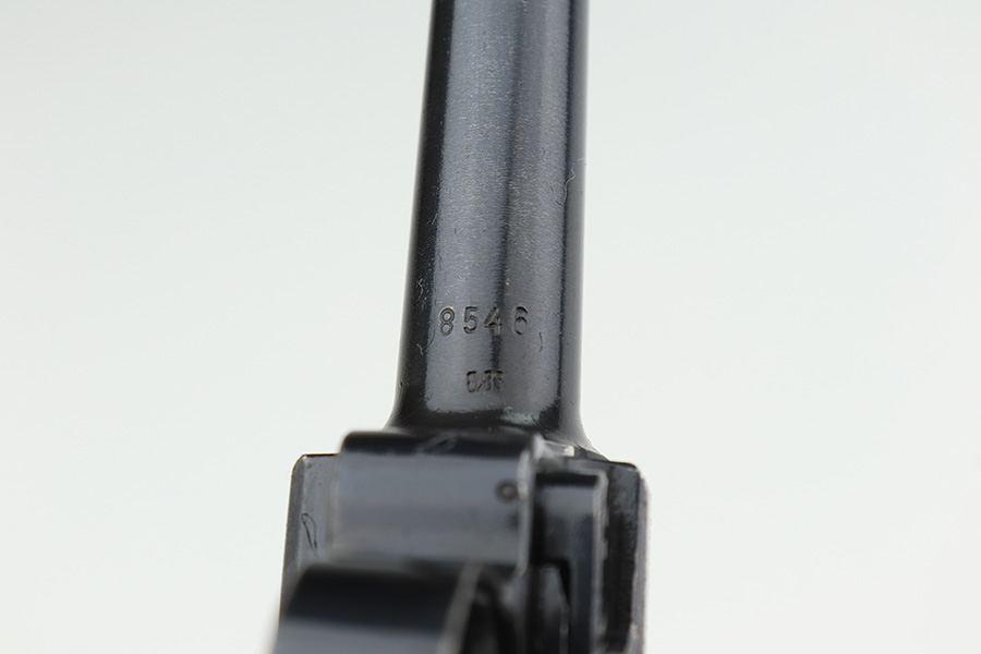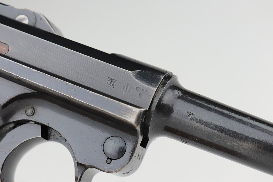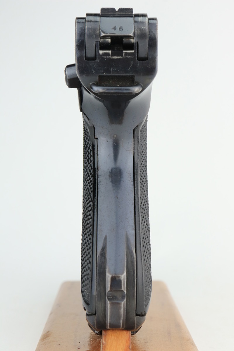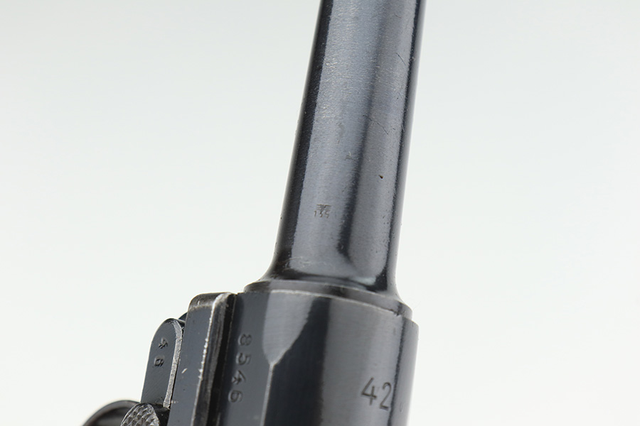 7/17/24 – This is an excellent example of a BYF 42 “Black Widow” Mauser Luger issued to the Nazi military in 1942. It is all matching and has the proper “Eagle 135” military acceptance proofs. It comes with a set of original black bakelite “Black Widow” grips and an original “Black Widow” magazine. There are a few minor blemishes on the left grip, and there is a repaired crack in the bakelite magazine bottom. The gun itself has retained about 97 of its original finish. There is minor wear around the muzzle, on the side plate, and on the very front edges of the side rails. Just a hint of thinning on the barrel. A couple of tiny scratches on the left side of the frame and some very light freckling on the grip straps. The bore has strong rifling with some light spotty freckling throughout.