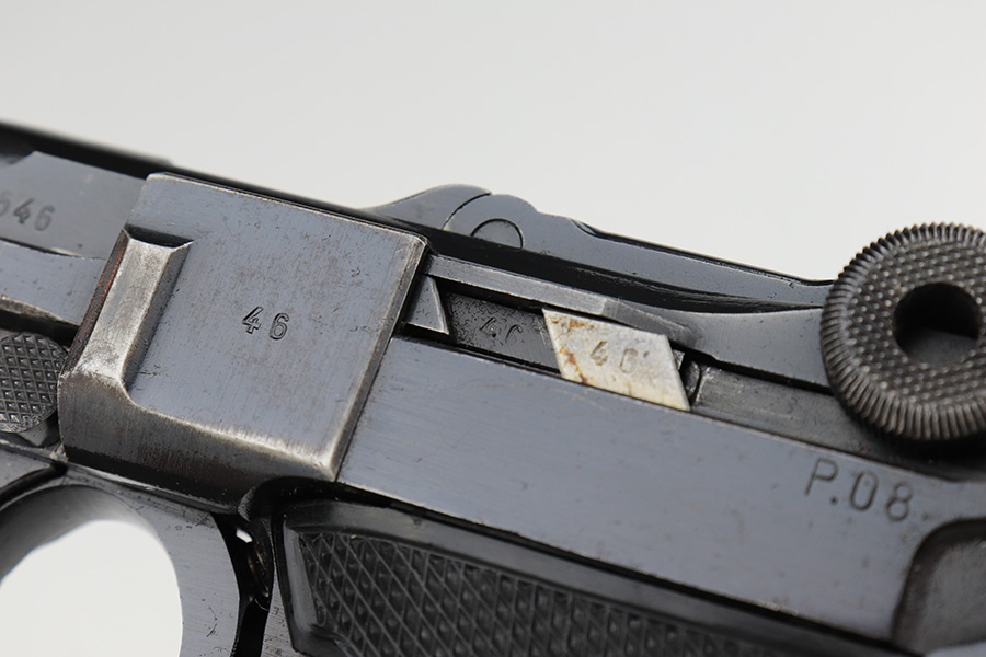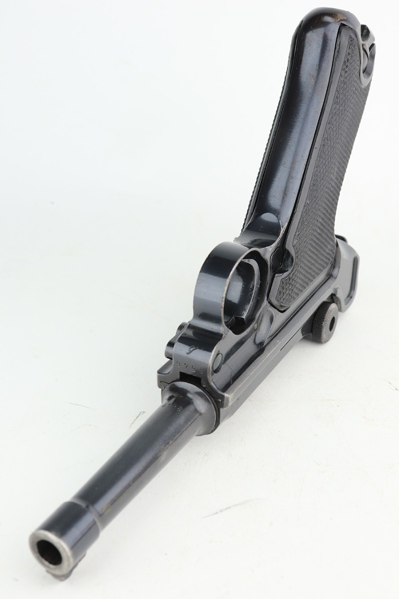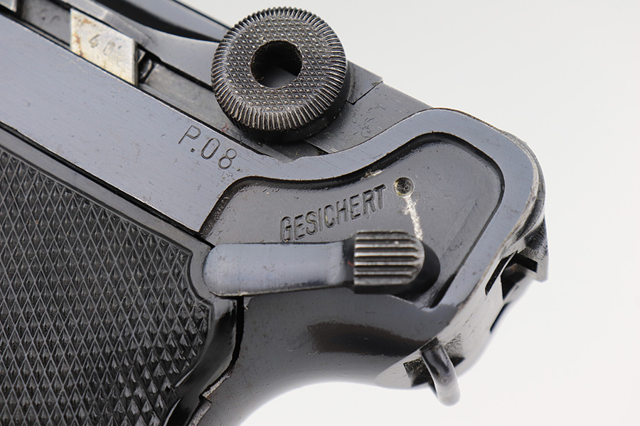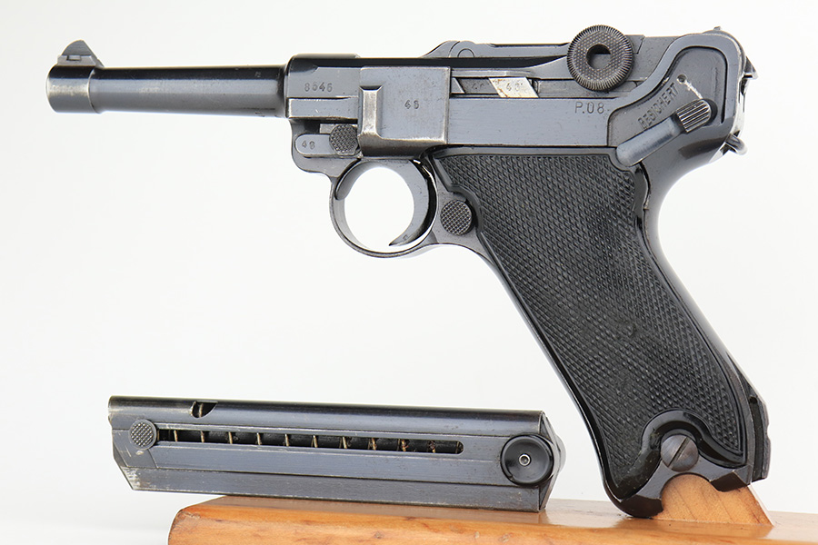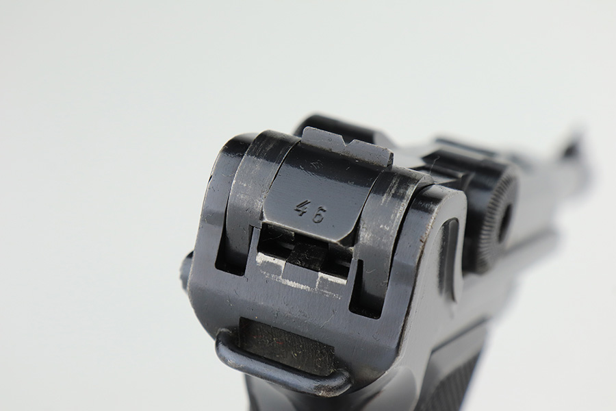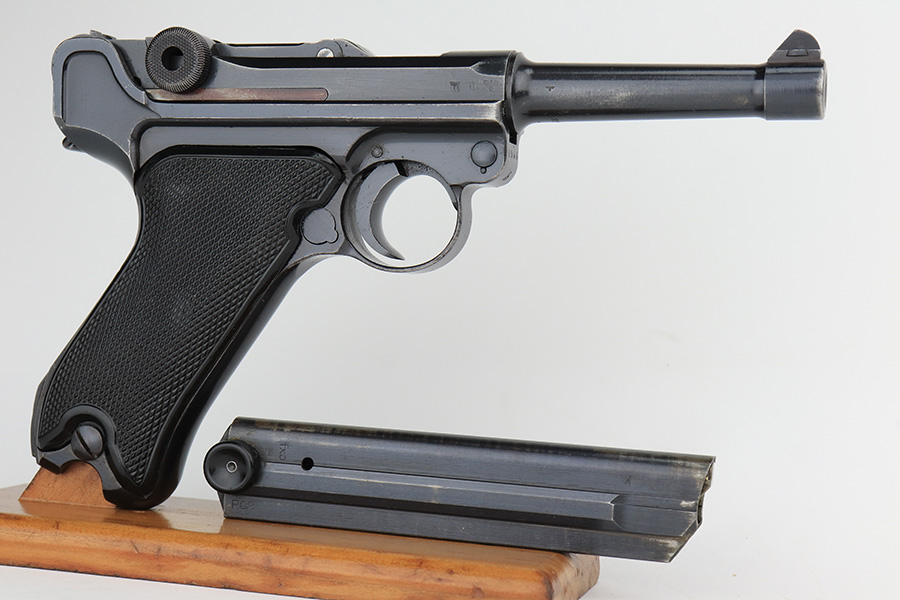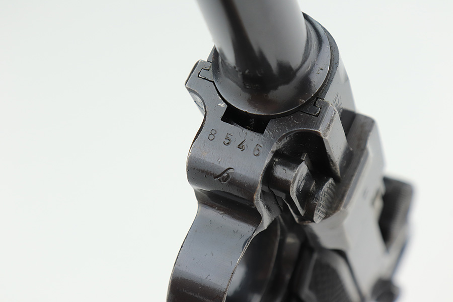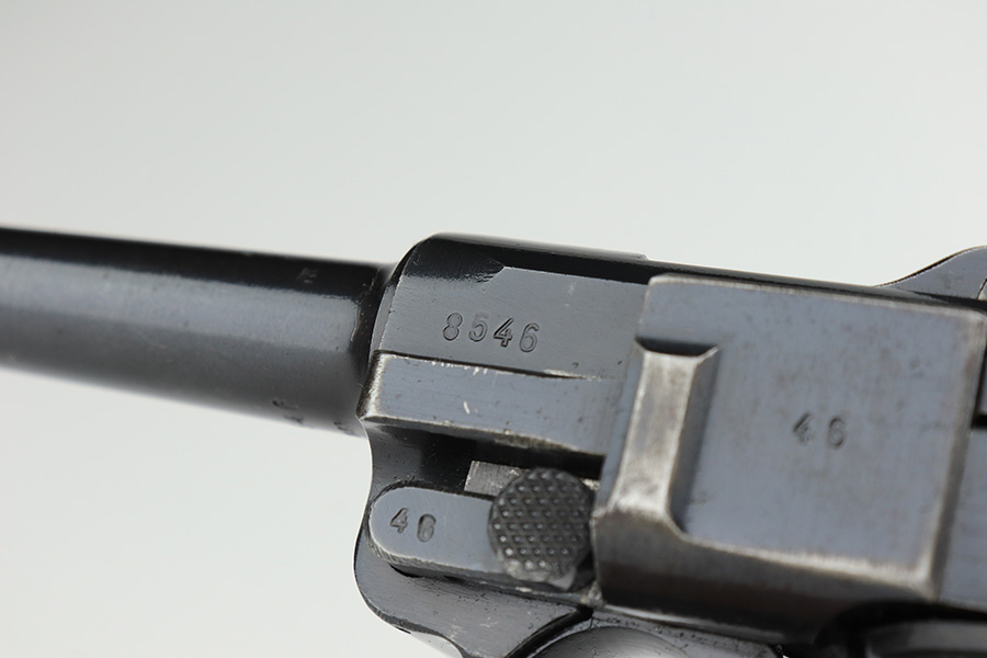 7/17/24 – This is an excellent example of a BYF 42 “Black Widow” Mauser Luger issued to the Nazi military in 1942. It is all matching and has the proper “Eagle 135” military acceptance proofs. It comes with a set of original black bakelite “Black Widow” grips and an original “Black Widow” magazine. There are a few minor blemishes on the left grip, and there is a repaired crack in the bakelite magazine bottom. The gun itself has retained about 97 of its original finish. There is minor wear around the muzzle, on the side plate, and on the very front edges of the side rails. Just a hint of thinning on the barrel. A couple of tiny scratches on the left side of the frame and some very light freckling on the grip straps. The bore has strong rifling with some light spotty freckling throughout.