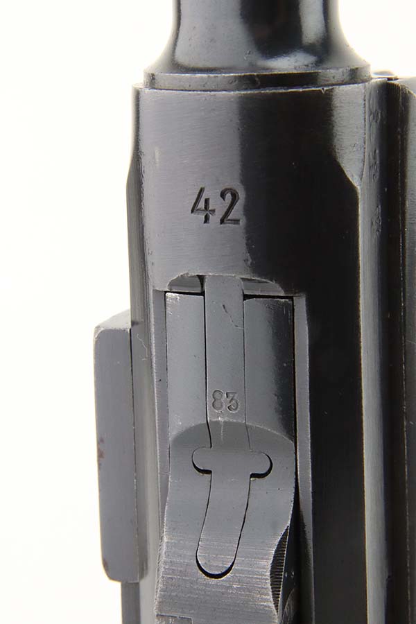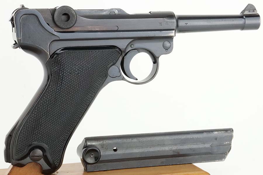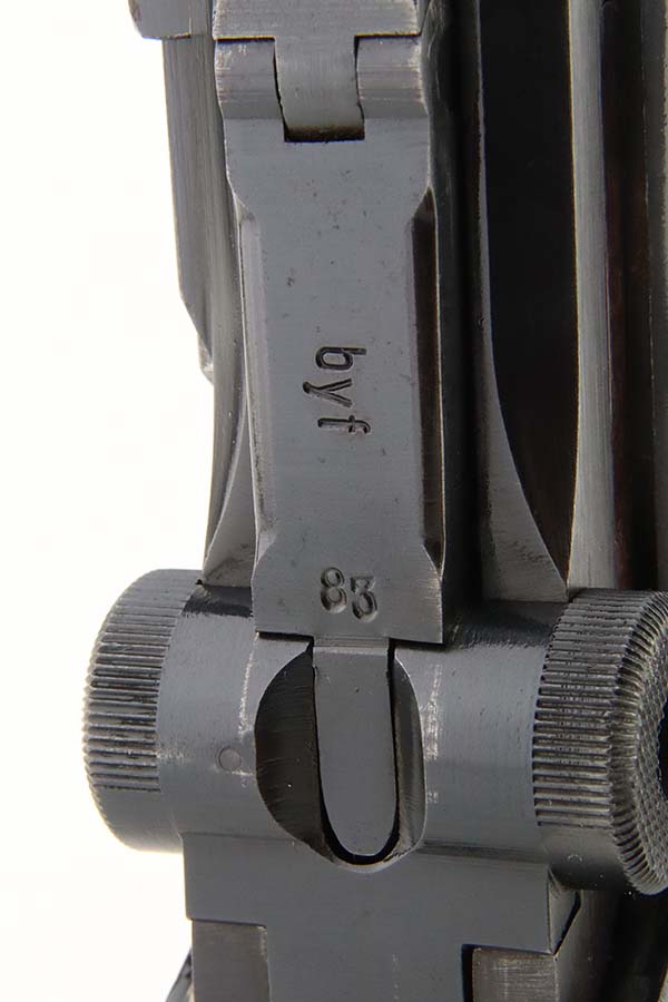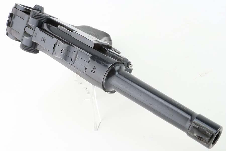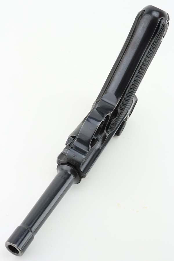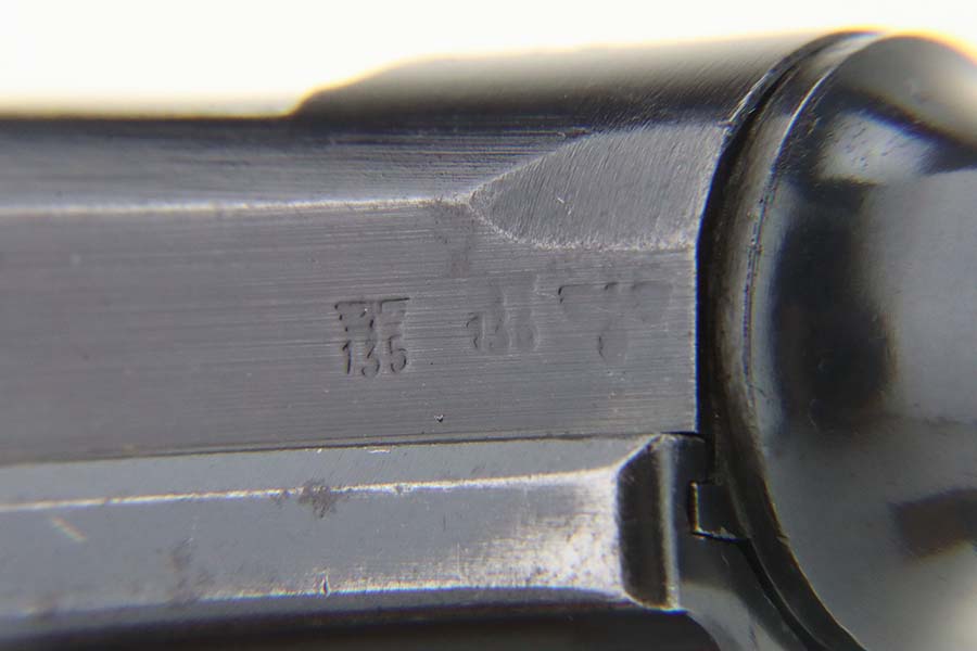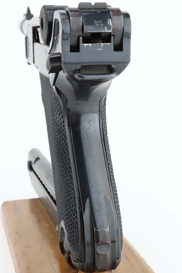 3/15/24 – This is an excellent example of a BYF 42 “Black Widow” Mauser Luger issued to the Nazi military in 1942. It is all matching, has the proper “Eagle 135” military acceptance proofs, and fitted with an excellent set of original “Black Widow” bakelite grips. It comes with one original “Black Widow” magazine – chip in the base. The gun has retained about 97% of its original finish with some minor muzzle wear, high edge wear, some very light pin-pricking on the grip straps, and a series of tiny dings on the left side of the frame. Excellent, shiny bore.