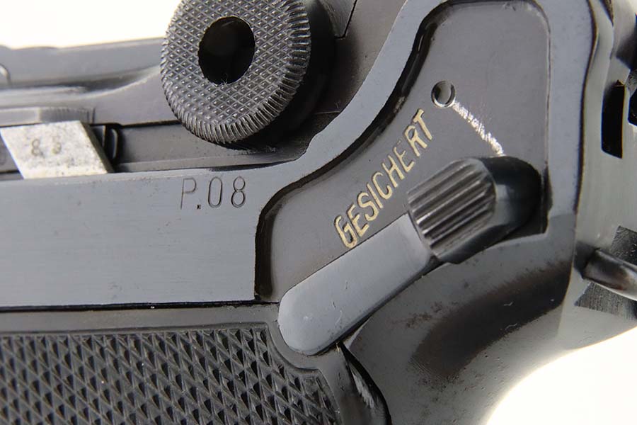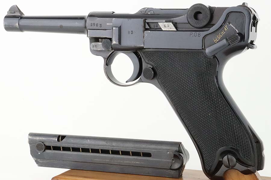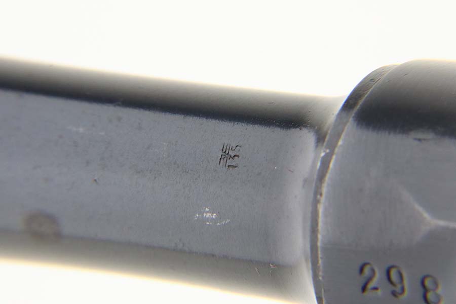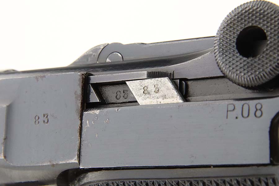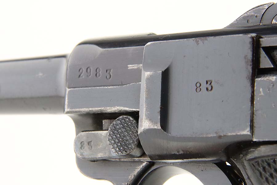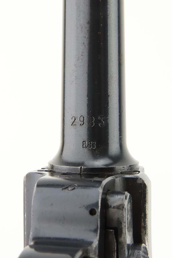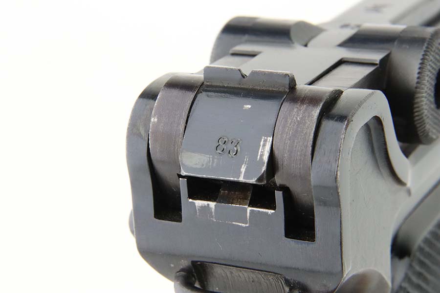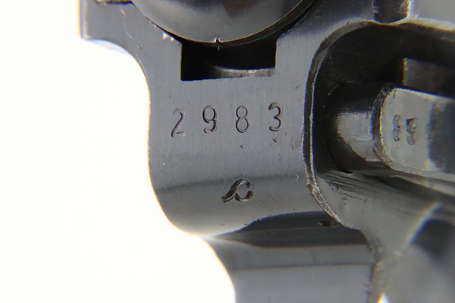 3/15/24 – This is an excellent example of a BYF 42 “Black Widow” Mauser Luger issued to the Nazi military in 1942. It is all matching, has the proper “Eagle 135” military acceptance proofs, and fitted with an excellent set of original “Black Widow” bakelite grips. It comes with one original “Black Widow” magazine – chip in the base. The gun has retained about 97% of its original finish with some minor muzzle wear, high edge wear, some very light pin-pricking on the grip straps, and a series of tiny dings on the left side of the frame. Excellent, shiny bore.