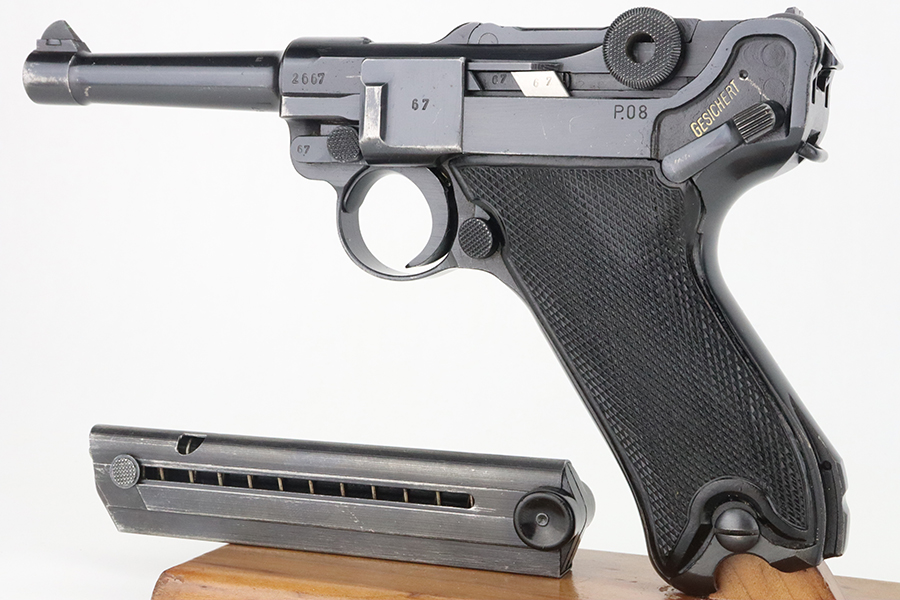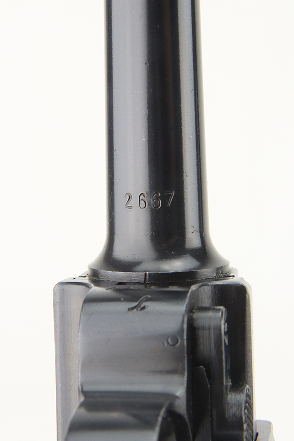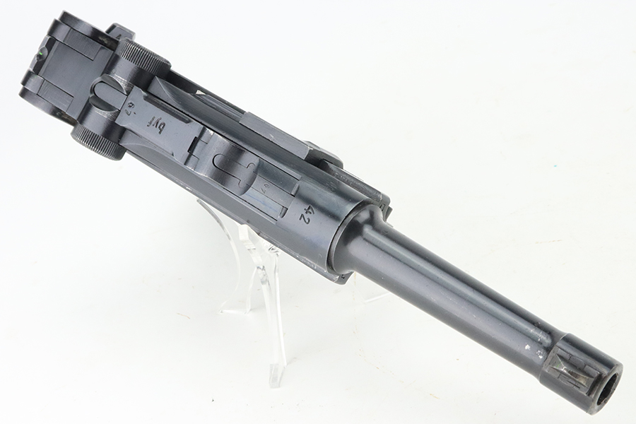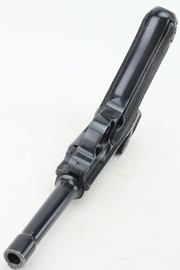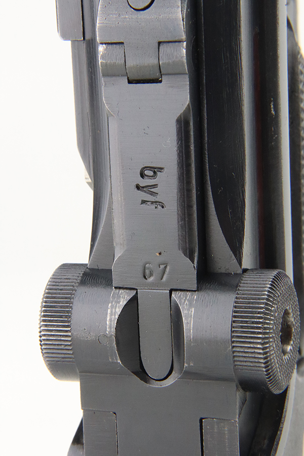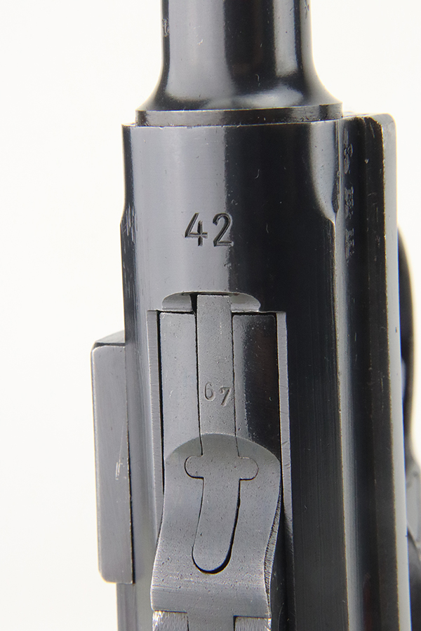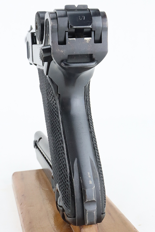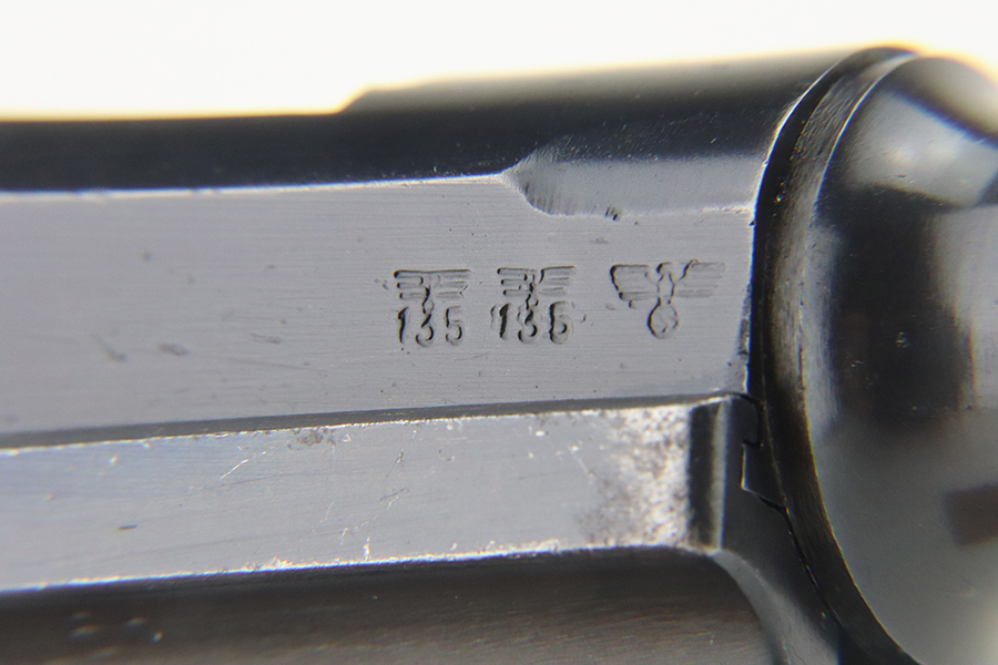 4/5/24 – This is an excellent example of a BYF 42 “Black Widow” Mauser Luger issued to the Nazi military in 1942. It is all matching, has the proper “Eagle 135” military acceptance proofs, and fitted with an excellent set of original “Black Widow” bakelite grips. It comes with one original “Black Widow” magazine. The gun has retained about 96-97% of its original finish with some minor muzzle wear, high edge wear, and a few tiny scratches on the left side of the frame. The bore has good rifling with just minor fouling in the grooves.