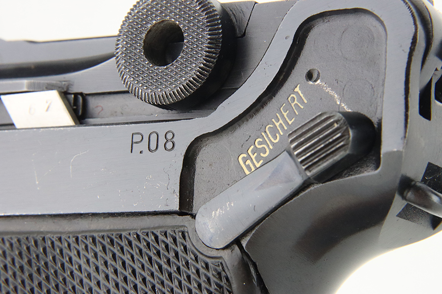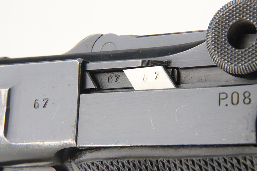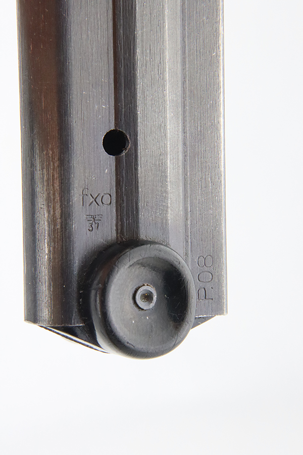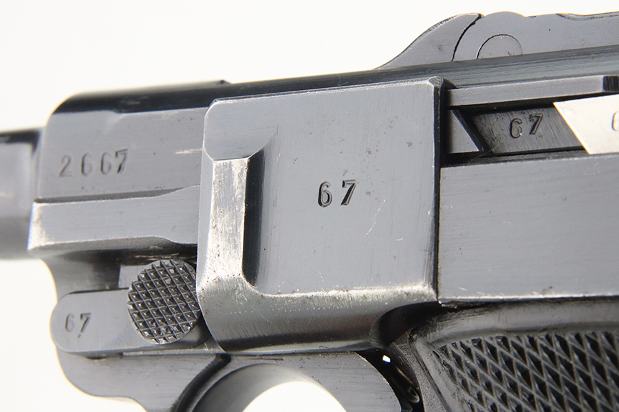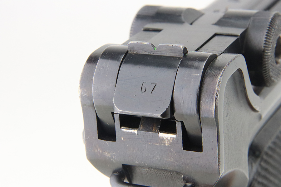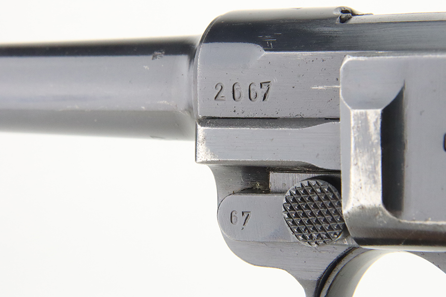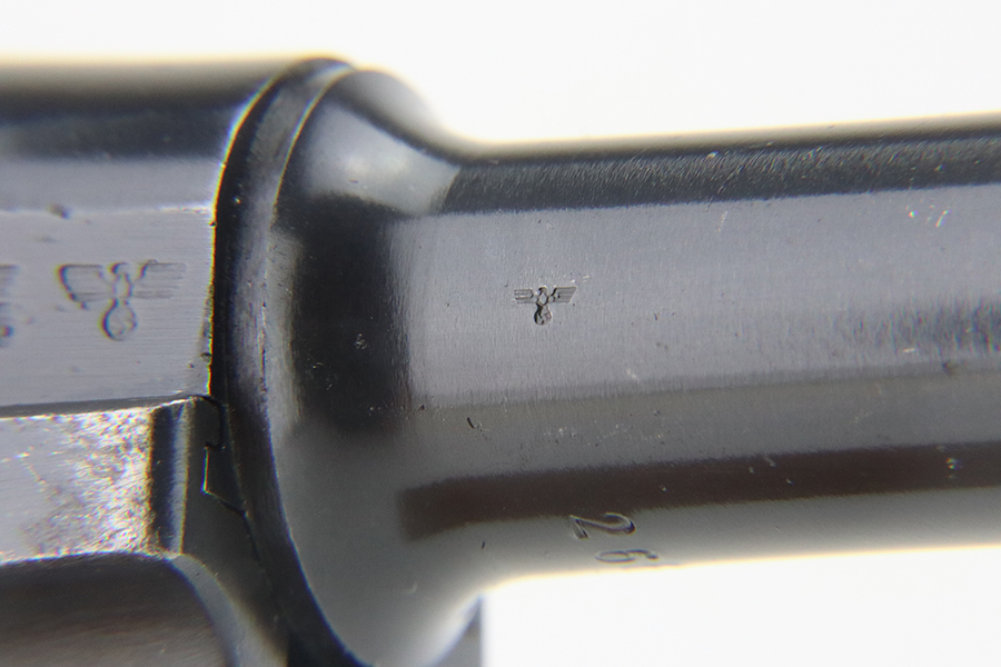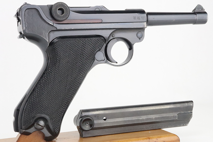 4/5/24 – This is an excellent example of a BYF 42 “Black Widow” Mauser Luger issued to the Nazi military in 1942. It is all matching, has the proper “Eagle 135” military acceptance proofs, and fitted with an excellent set of original “Black Widow” bakelite grips. It comes with one original “Black Widow” magazine. The gun has retained about 96-97% of its original finish with some minor muzzle wear, high edge wear, and a few tiny scratches on the left side of the frame. The bore has good rifling with just minor fouling in the grooves.