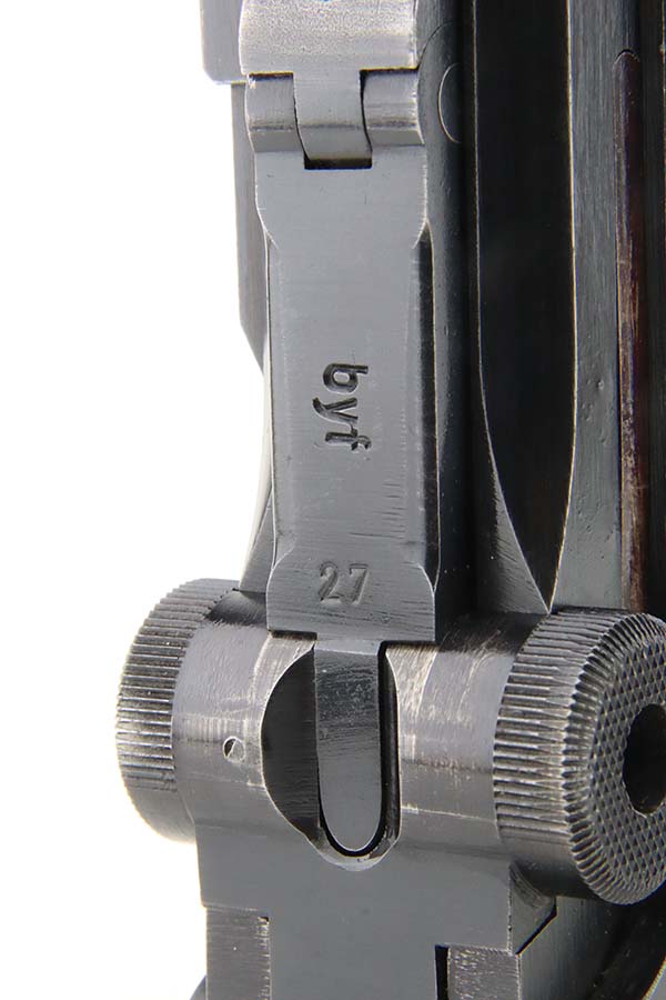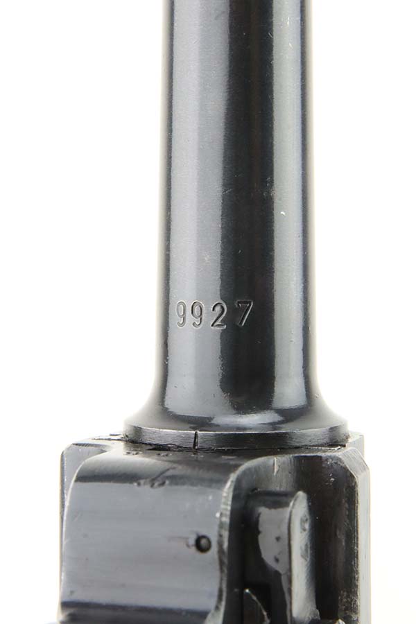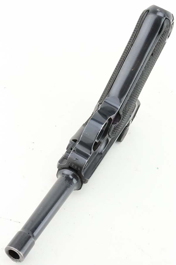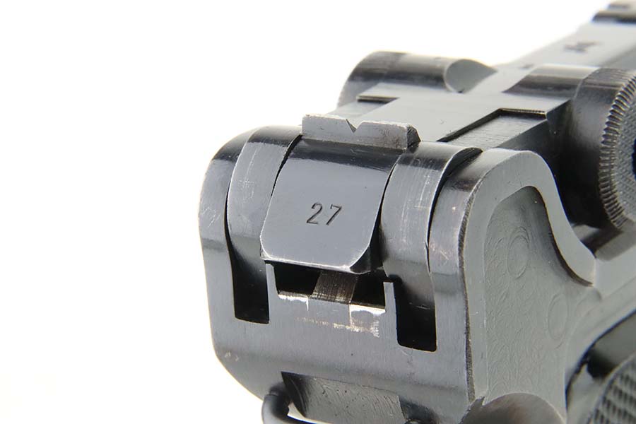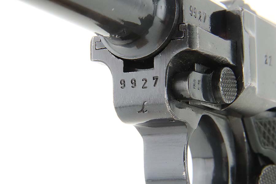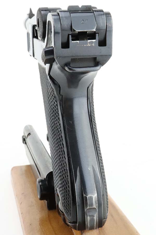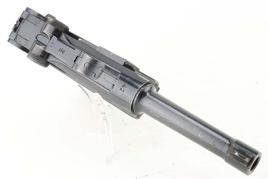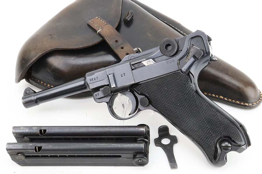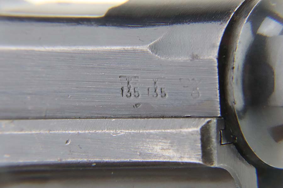3/11/24 – This is an excellent example of a BYF 42 “Black Widow” Mauser Luger issued to the German military in 1942. It is all matching, has the proper “Eagle 135” military acceptance proofs, and fitted with a very nice set of original “Black Widow” bakelite grips. It comes as a rig with two original “Black Widow” magazines, a very nice 1942-dated holster, and a rare “Eagle 135” Luger tool. The gun itself has retained about 96% of its original finish with just very minor high edge and muzzle wear and some tiny scratches here and there. Minty bore.