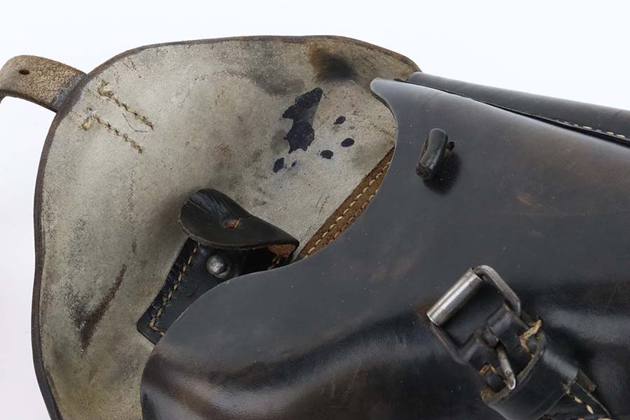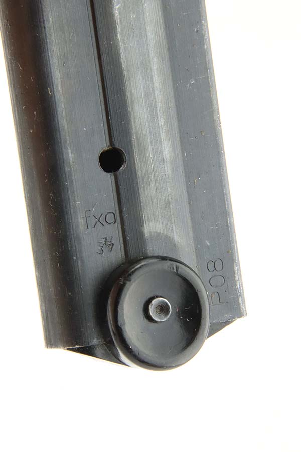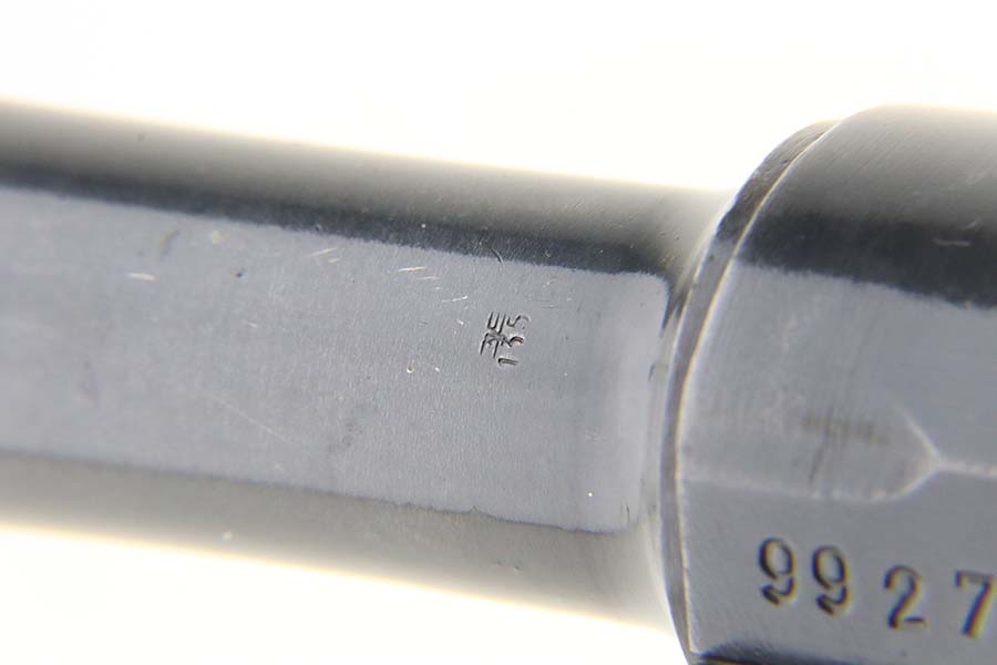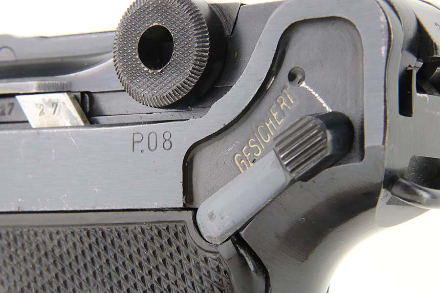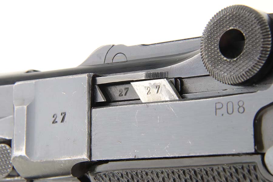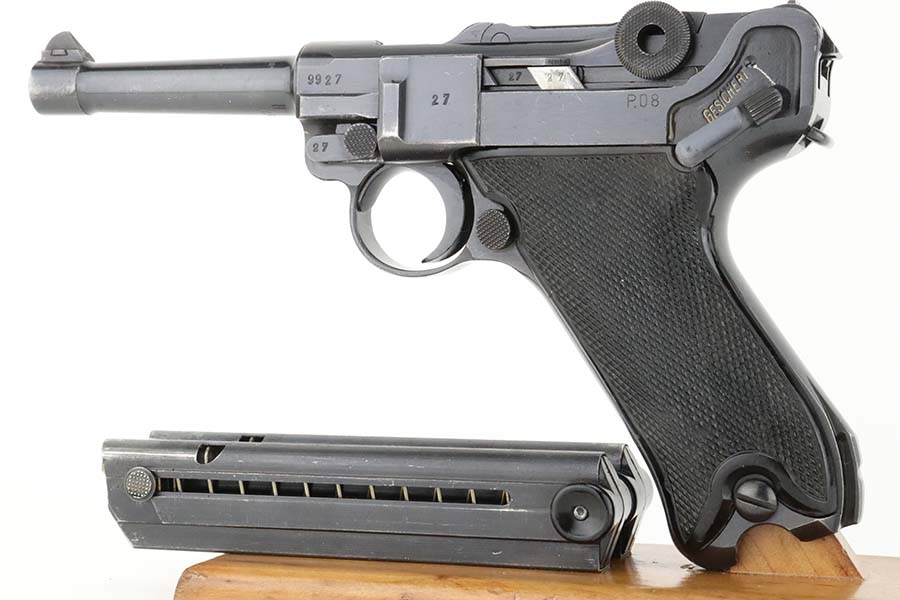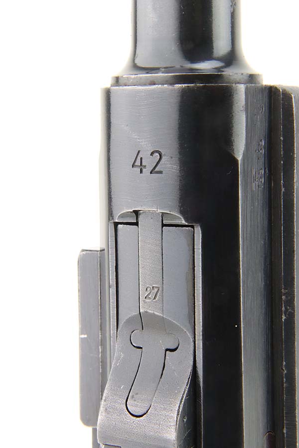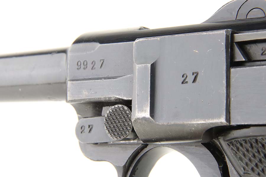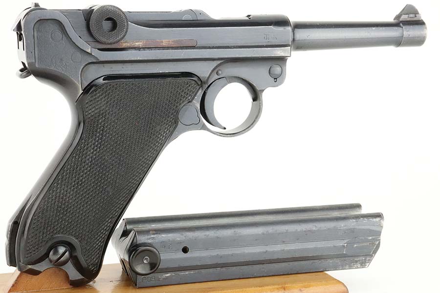 3/11/24 – This is an excellent example of a BYF 42 “Black Widow” Mauser Luger issued to the German military in 1942. It is all matching, has the proper “Eagle 135” military acceptance proofs, and fitted with a very nice set of original “Black Widow” bakelite grips. It comes as a rig with two original “Black Widow” magazines, a very nice 1942-dated holster, and a rare “Eagle 135” Luger tool. The gun itself has retained about 96% of its original finish with just very minor high edge and muzzle wear and some tiny scratches here and there. Minty bore.