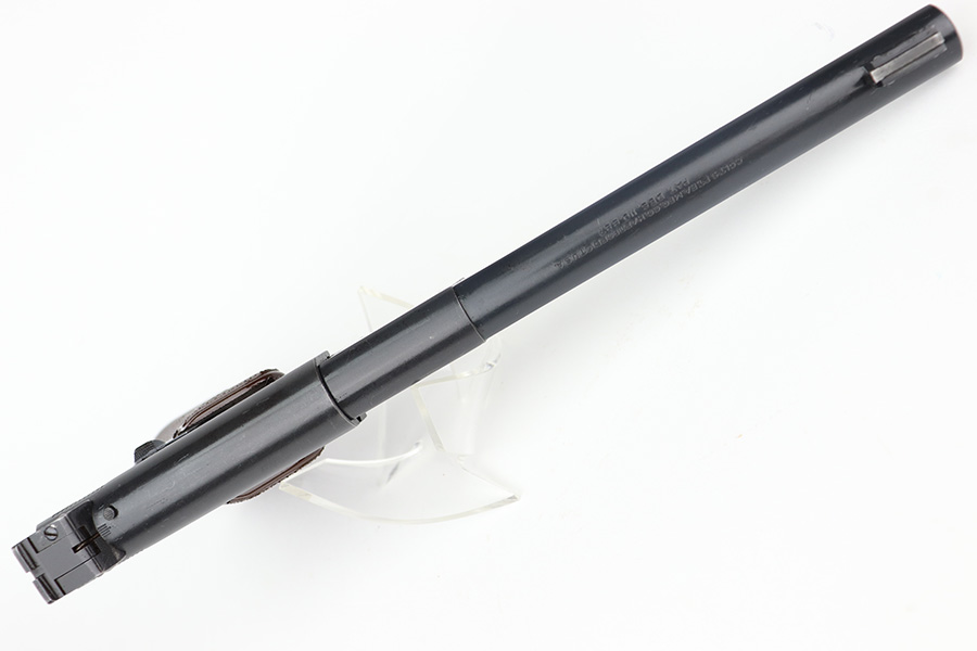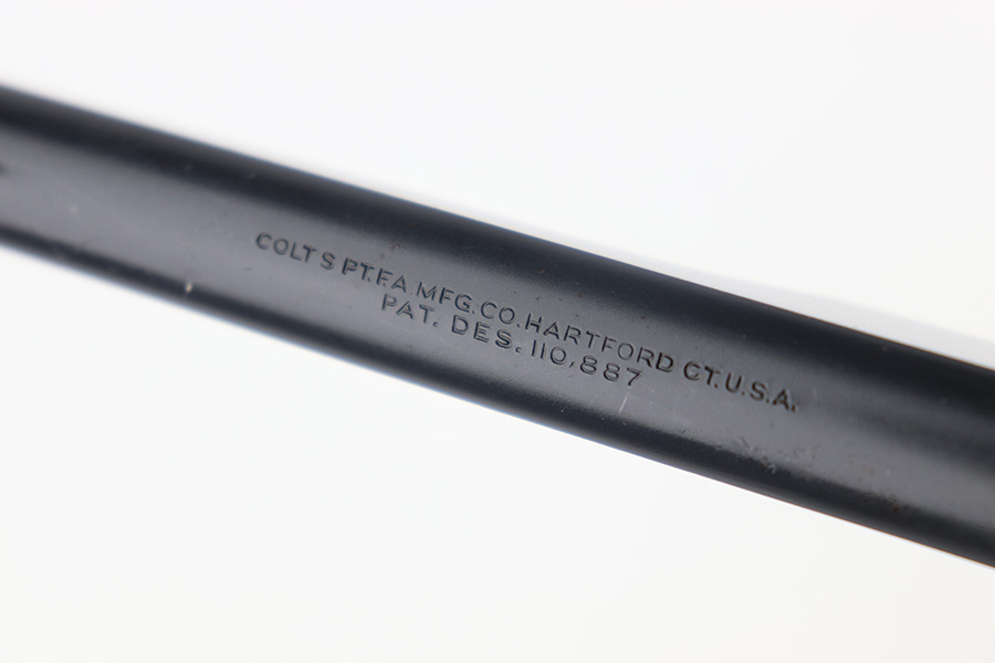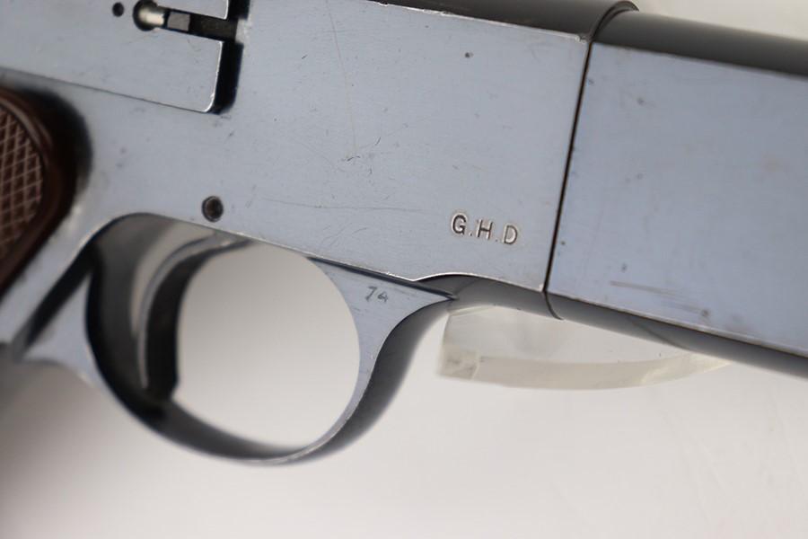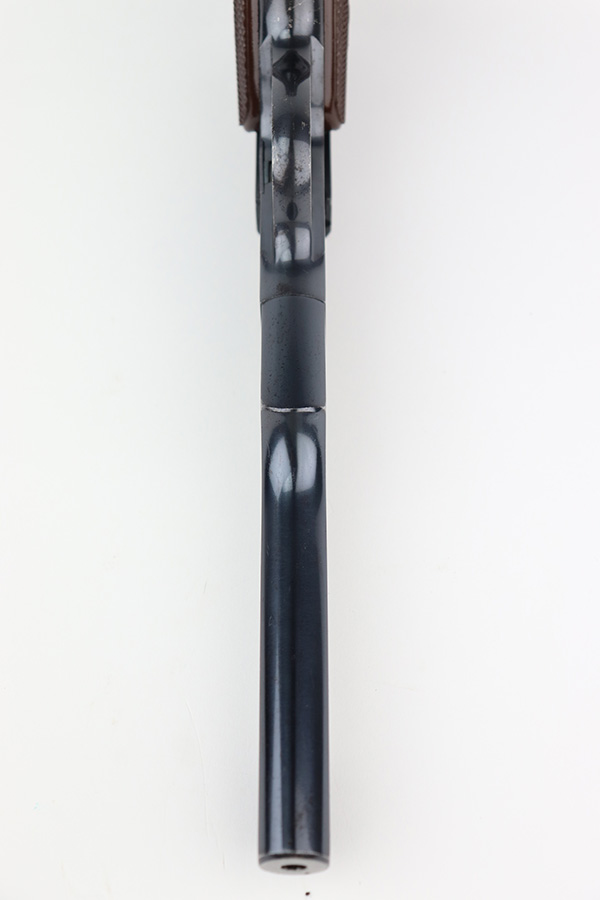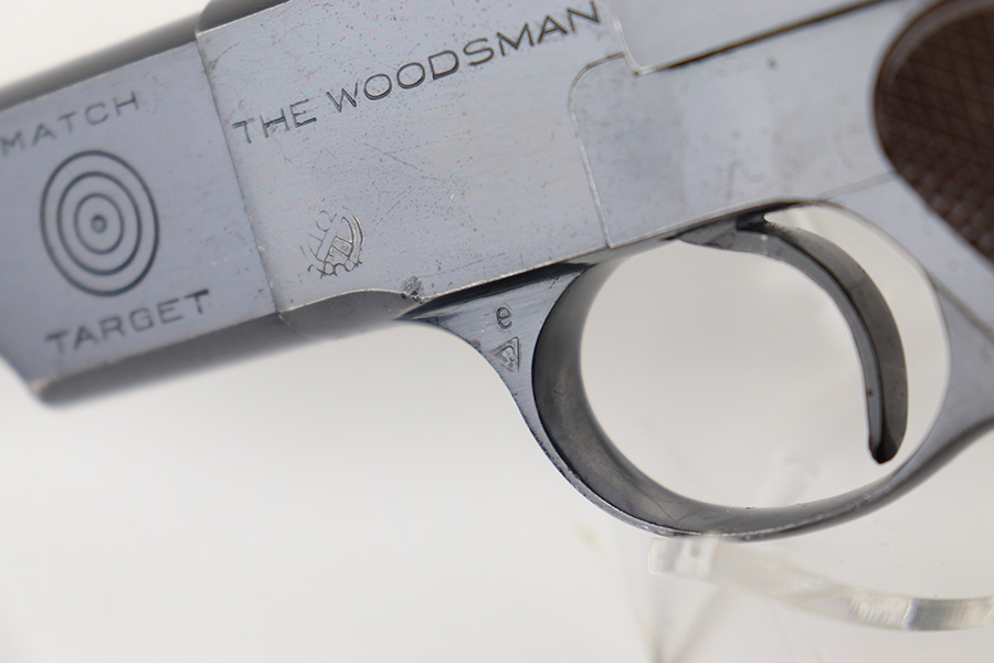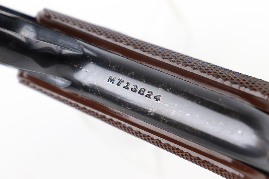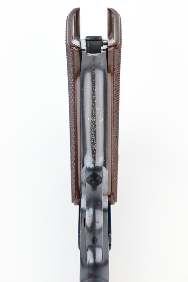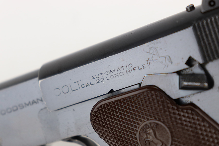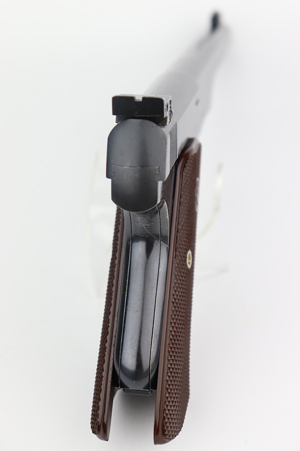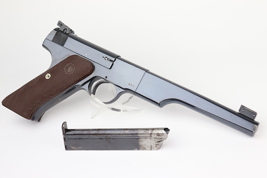 12/7/22 – This is an excellent example of a fairly rare US Property-marked Colt Match Target pistol, manufactured in 1942. It is all matching, has the proper military cross-canon cartouche on the left side of the frame, and has the proper “GHD” inspector initials on the right side of the frame. This model was purported to be shipped and used at West Point for officers training. It is in excellent condition overall, retaining about 95% of its original high polish finish. There is just some very minor wear around the muzzle and on the high edges in general. Some small spots of discoloration here and there. Some light spotty wear on the front strap. Fitted with a set of excellent original brown plastic grips and comes with one proper two-tone magazine. Mint bore.