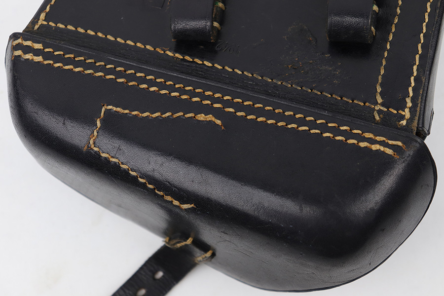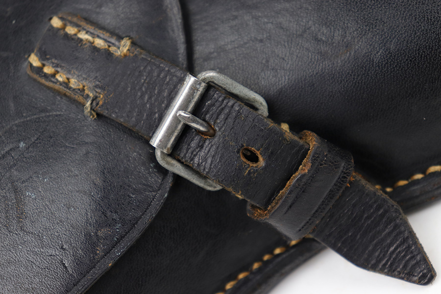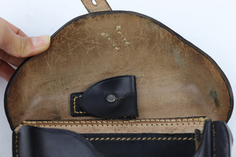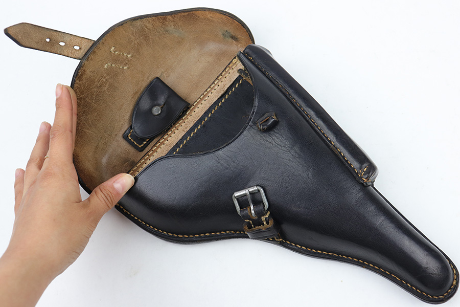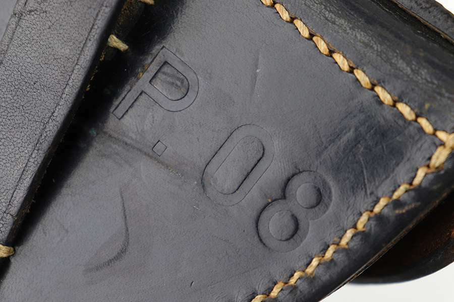 4/18/23 – This is an excellent example of an all original 1942 dated Luger holster from WW2. The holster would be “minty” except for the surface damage on the back leather, which covers the maker stamp. The waffen military proof, date, and P.08 stamps are all crisp and clearly visible however. The black leather has normal pliability and is generally soft from age, but holds shape very nicely. There is some light wrinkling near the toe and on the closure strap. The interior leather is excellent. All original stitching is tight and intact throughout.