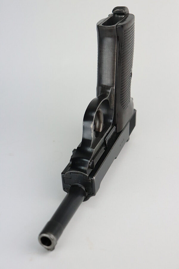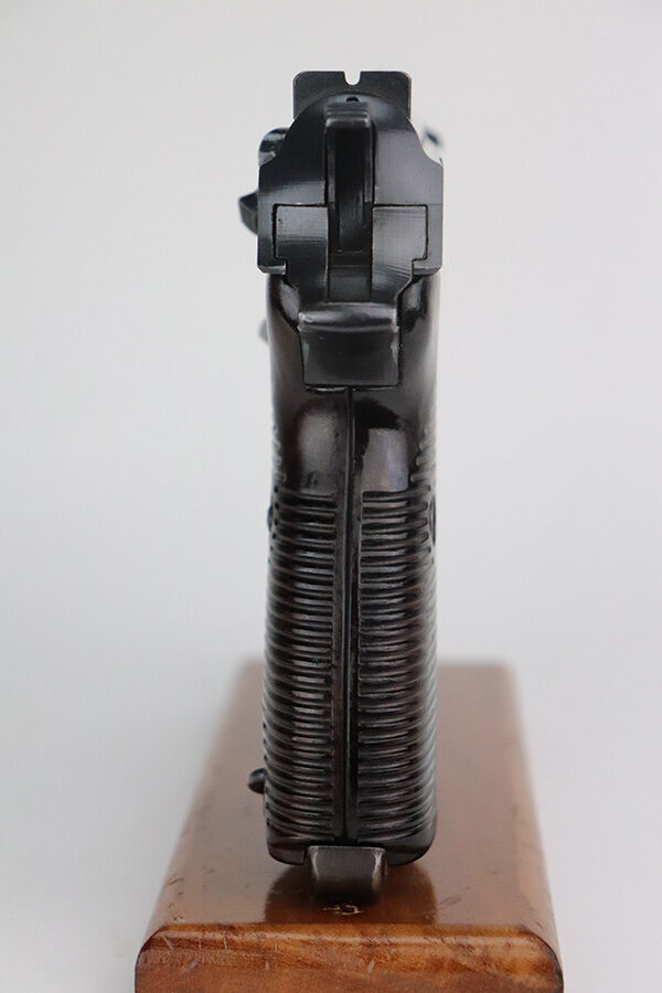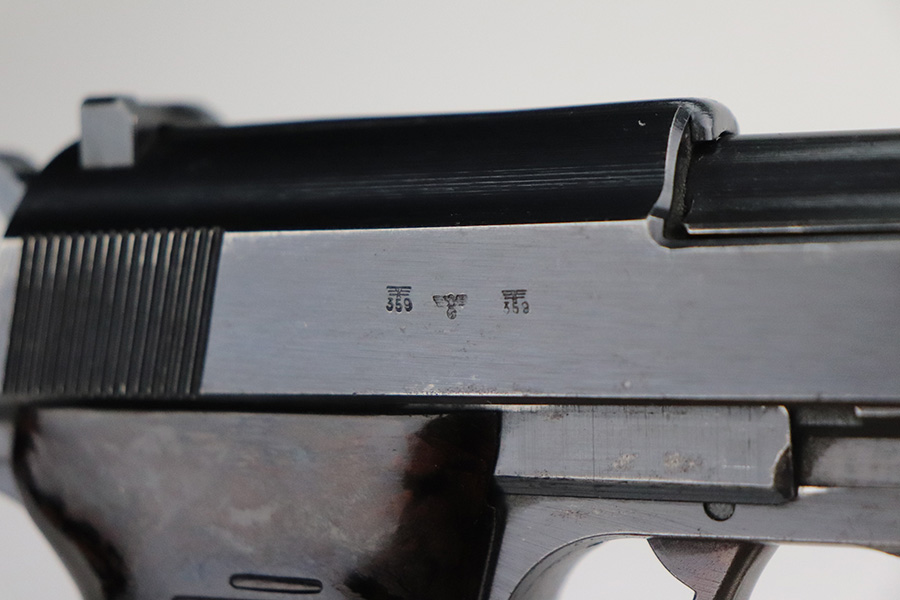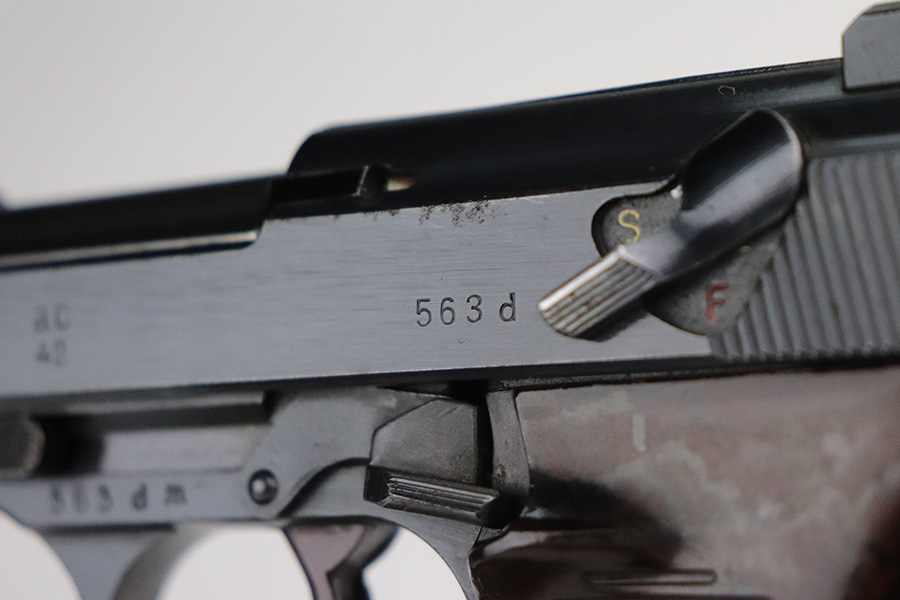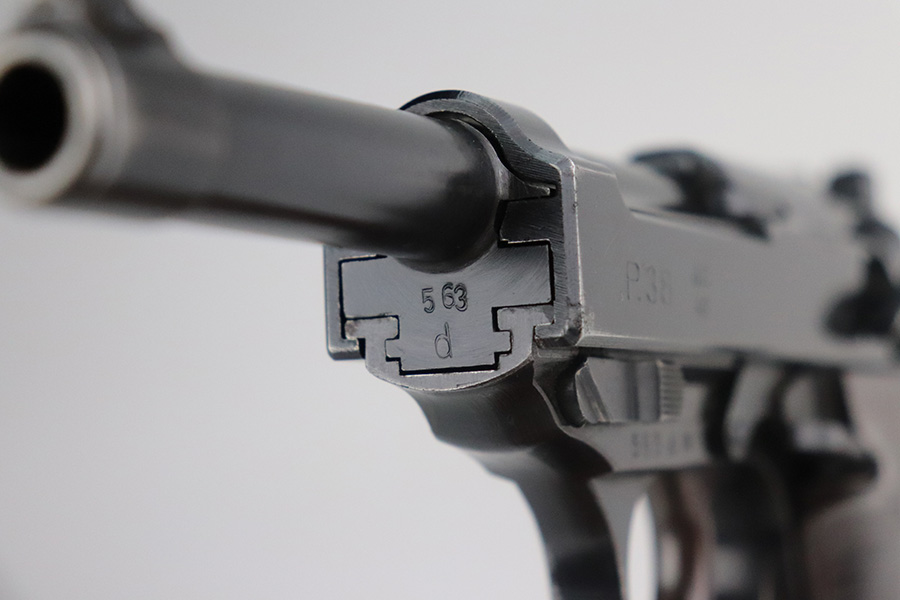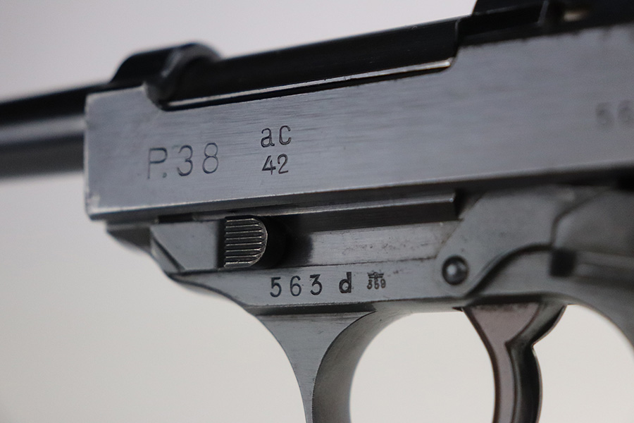 7/6/21 – This is an excellent example of a Walther P.38 issued to the Nazi military in 1942. It is all matching and has the proper “Eagle 359” military proofs. It has retained about 96% of its original finish. There is minor thinning and brown patina on the front strap and very minor wear around the high edges of the slide and around the muzzle. Areas of very minor pin-pricking here and there. Comes with excellent grips and an un-numbered Walther magazine. The bore is shiny with strong rifling with areas of noticeable freckling in the grooves. De-cocker is functional.