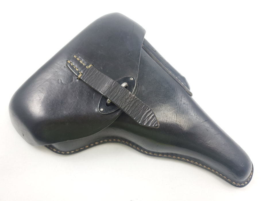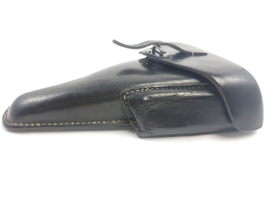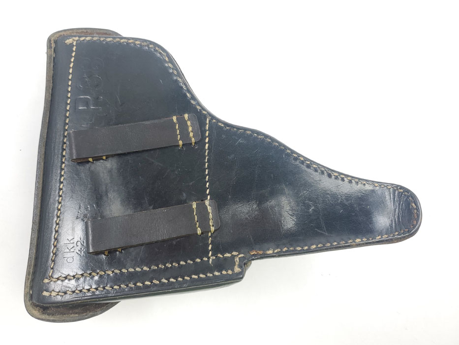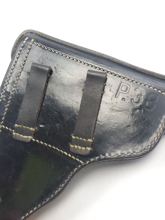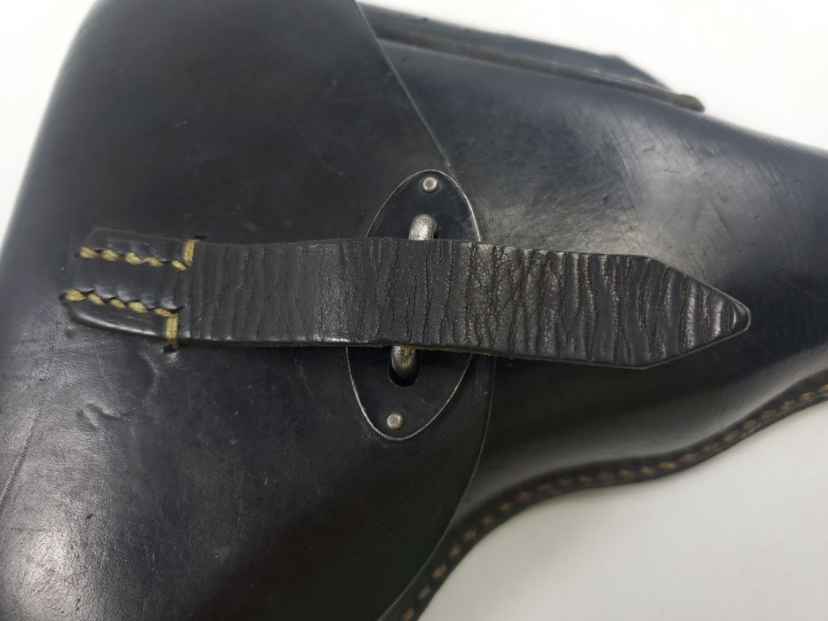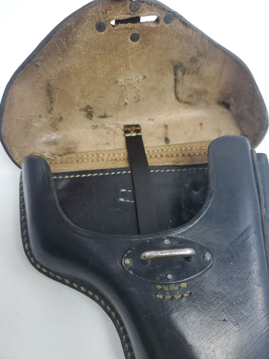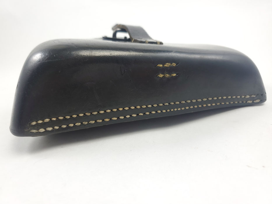 3/27/20 – This is an excellent black leather P.38 holster from 1942. The holster has strong, clean leather with light pliability. Interior leather is clean as well. The back of the holster is maker stamped, waffen proofed, dated, and P.38 stamped. No notable flaws or issues to report. Strong, all original stitching in tact as well.