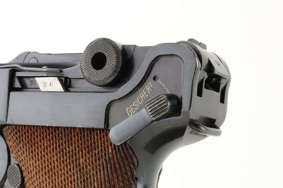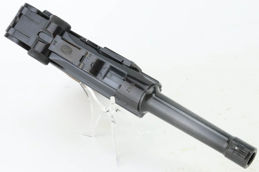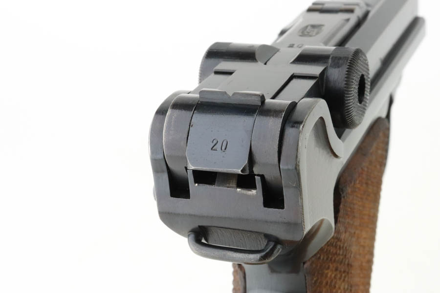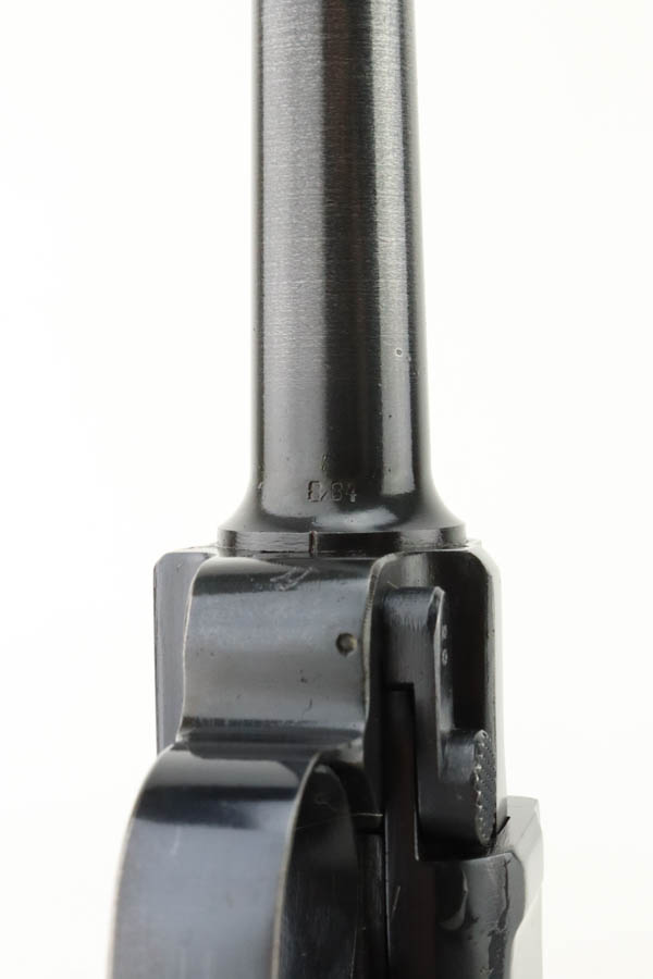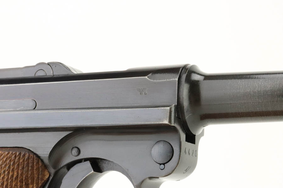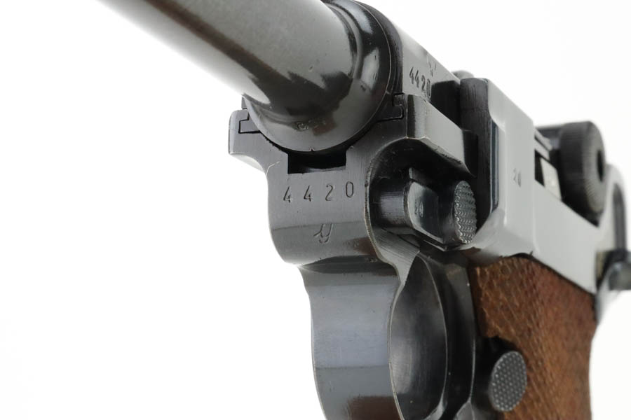 7/10/24 – This is an excellent example of a Mauser Banner Luger issued to the Nazi police in 1942. The gun is all matching, has an added police seer safety, a proper police “Eagle L” marking, and a Mauser Banner logo on the toggle. It comes with an original black widow magazine. The gun has retained about 95% of its original finish with minor thinning along the barrel and the slightest hints of light brown patina on the grip straps. Fitted with mint “Eagle 655” marked wood grips. Factory-new bore.
