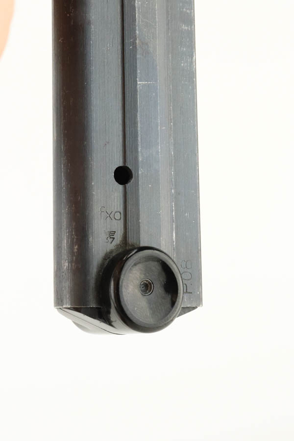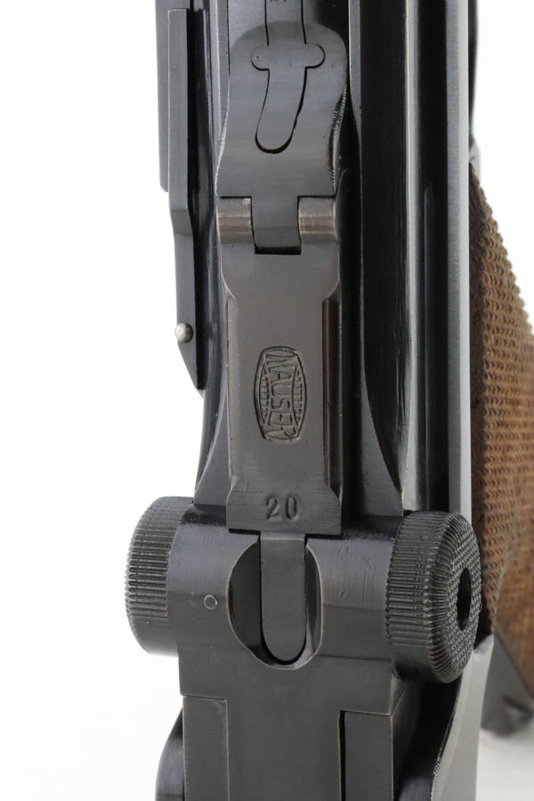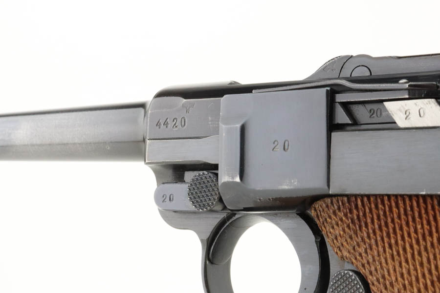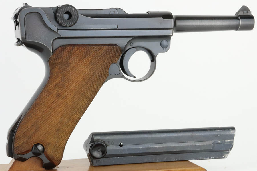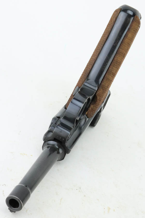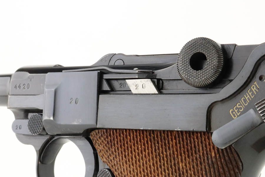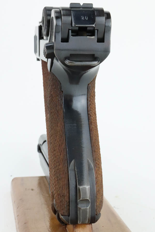 7/10/24 – This is an excellent example of a Mauser Banner Luger issued to the Nazi police in 1942. The gun is all matching, has an added police seer safety, a proper police “Eagle L” marking, and a Mauser Banner logo on the toggle. It comes with an original black widow magazine. The gun has retained about 95% of its original finish with minor thinning along the barrel and the slightest hints of light brown patina on the grip straps. Fitted with mint “Eagle 655” marked wood grips. Factory-new bore.