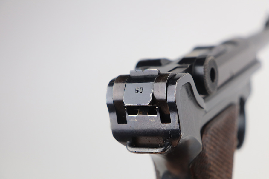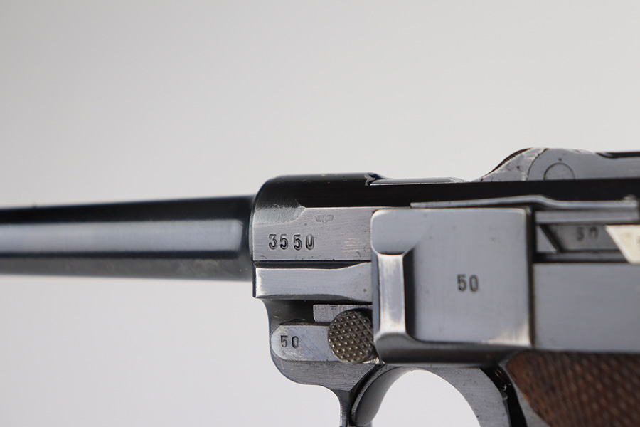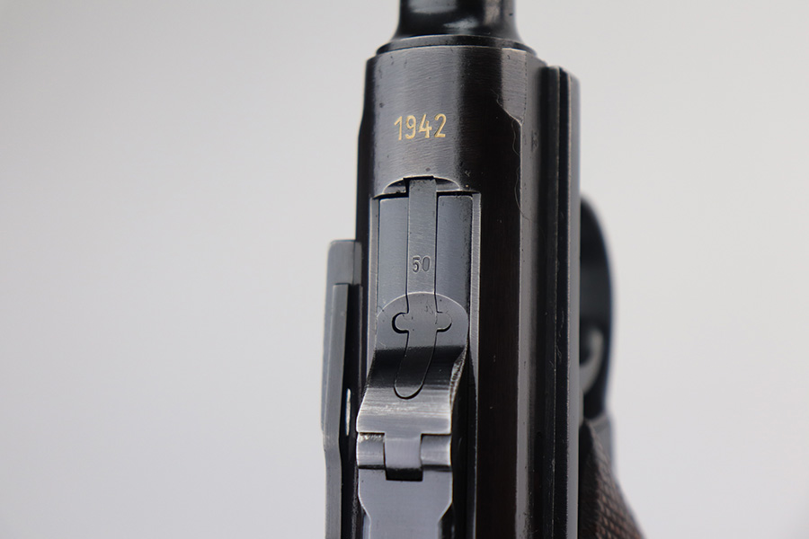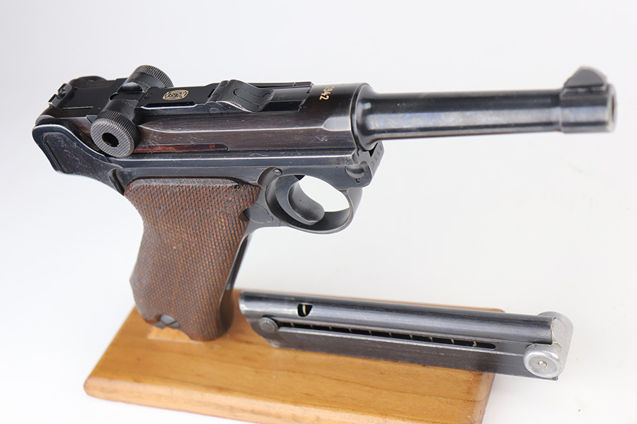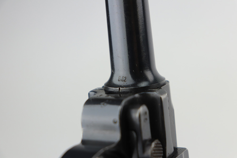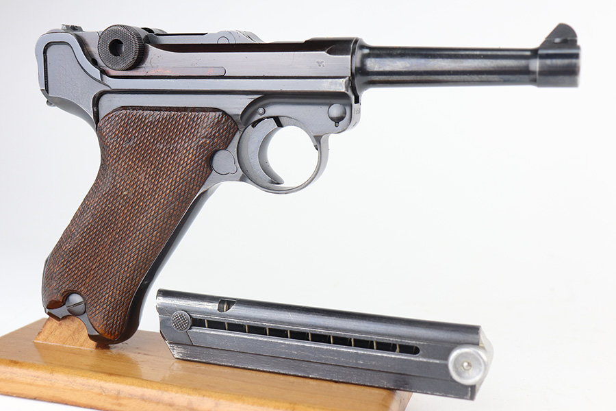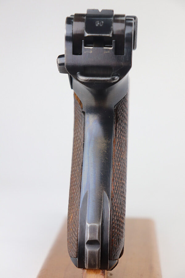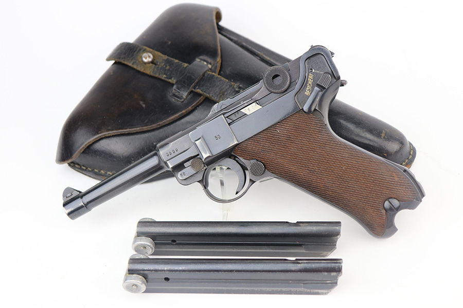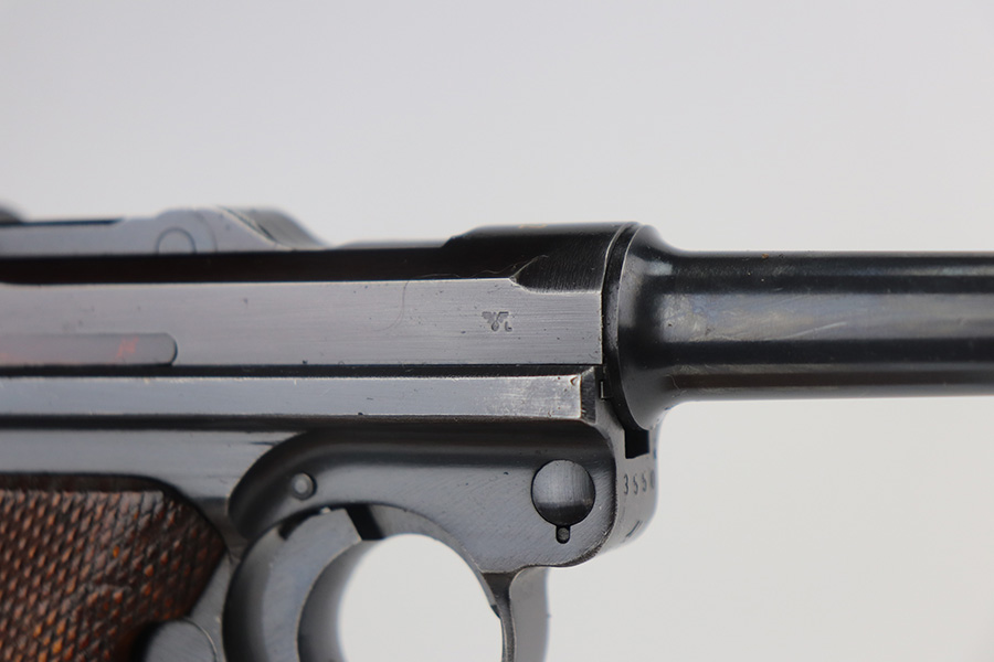 6/18/21 – This is an excellent example of a Mauser Luger issued to the Nazi police force in 1942. It is all matching, has an added police sear safety, a Mauser banner logo on the toggle, and the proper police “Eagle L” proof. The rig comes with two matching magazines and a very nice 1943-dated police-style holster. It has retained about 97% of its original finish. There is very minor wear on the side plate, side rails, and around the muzzle. There is an area of minor thinning on the back strap and some very tiny dings on the front strap. Comes with nice grips – the left panel is matching, the right panel is not numbered. There is a small chip in the left grip and a hairline crack in the right grip. The bore has excellent rifling with minor freckling throughout.