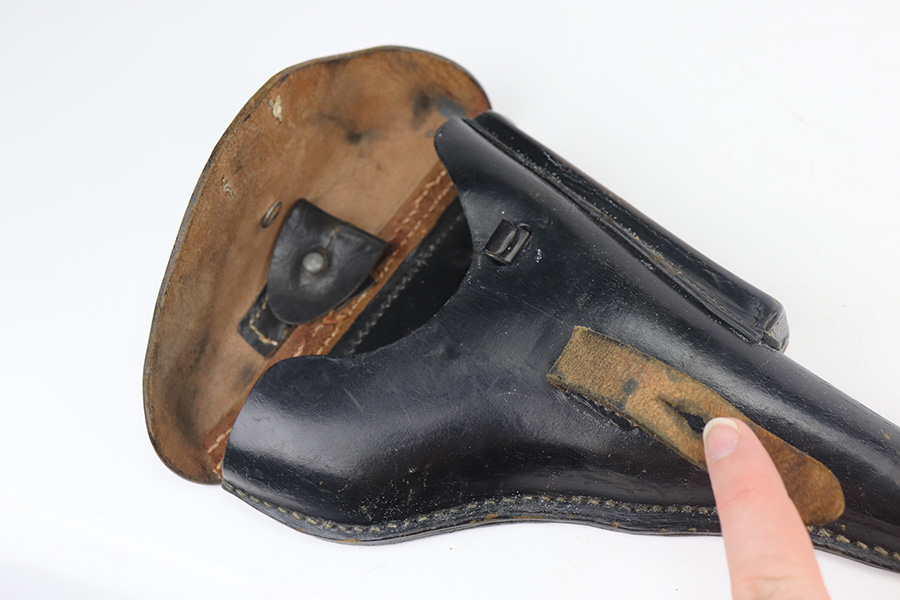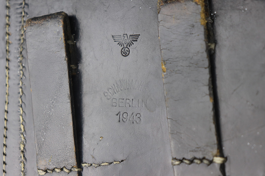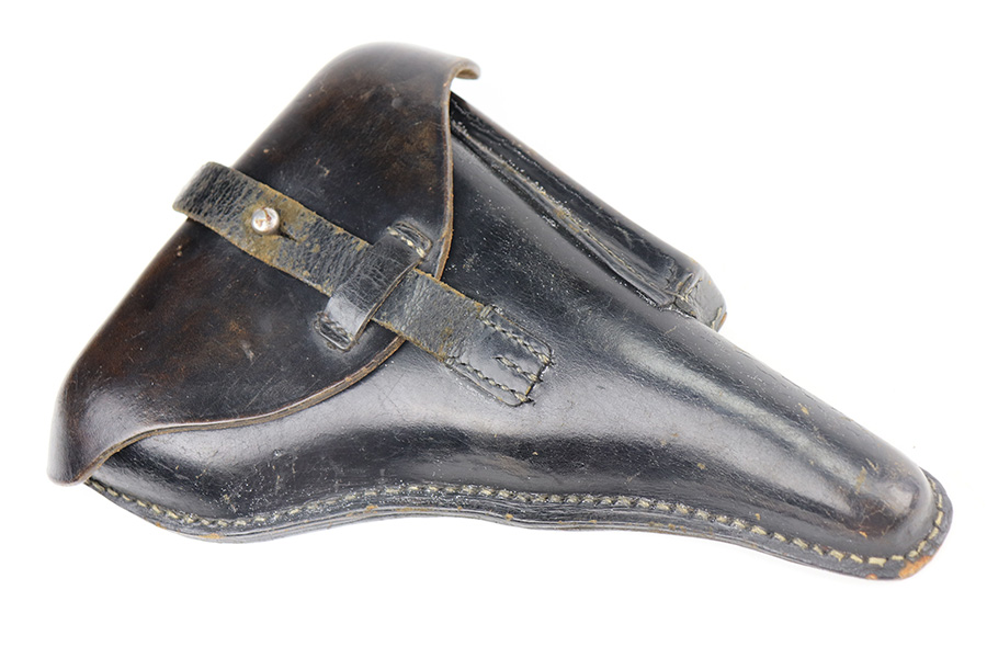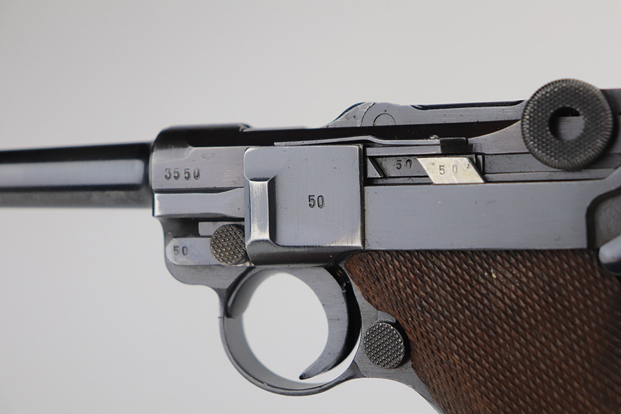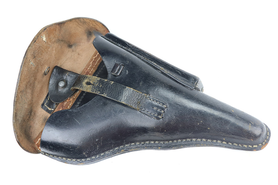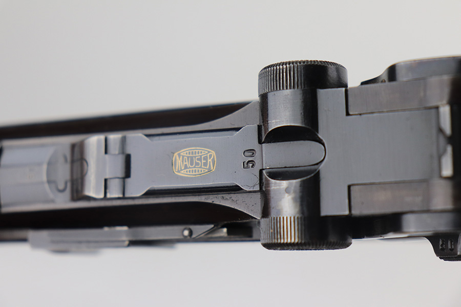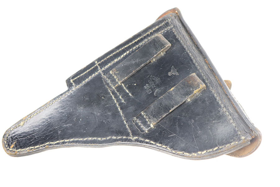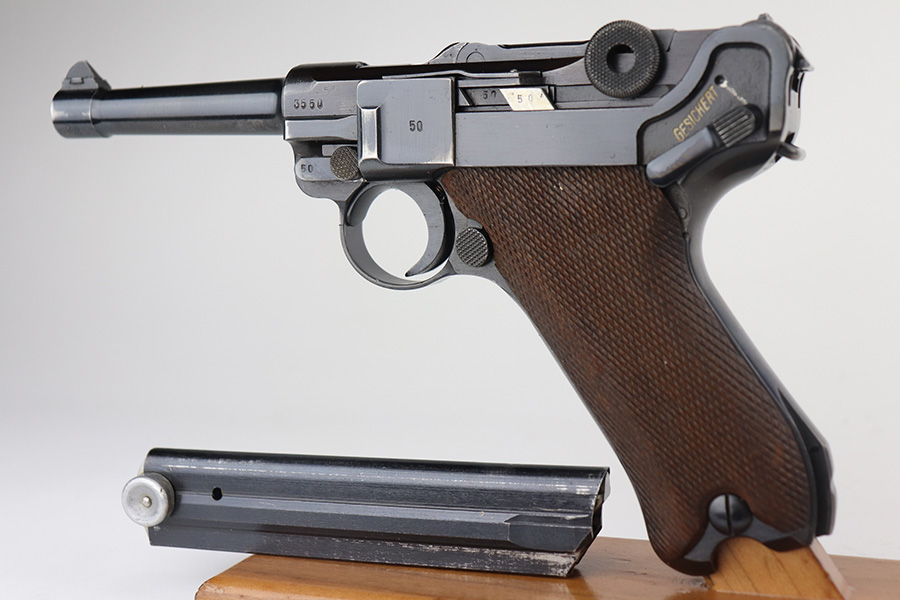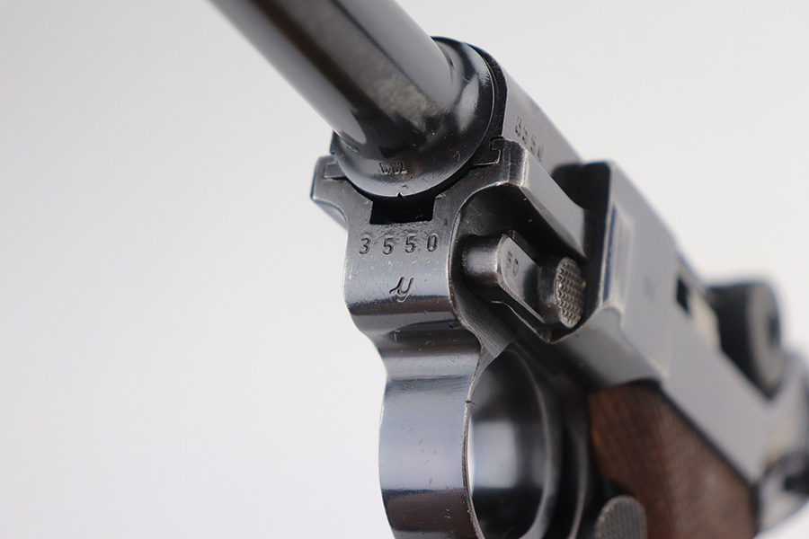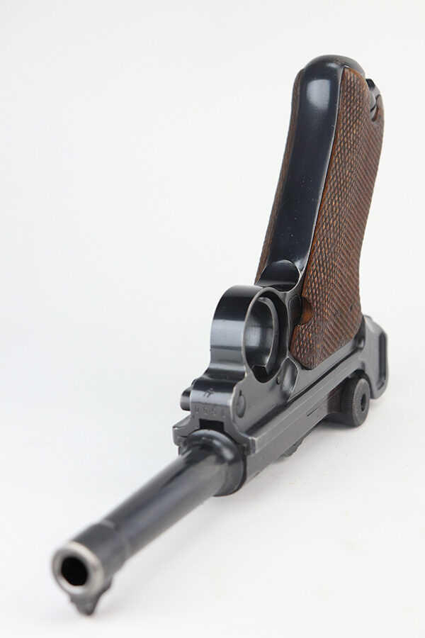 6/18/21 – This is an excellent example of a Mauser Luger issued to the Nazi police force in 1942. It is all matching, has an added police sear safety, a Mauser banner logo on the toggle, and the proper police “Eagle L” proof. The rig comes with two matching magazines and a very nice 1943-dated police-style holster. It has retained about 97% of its original finish. There is very minor wear on the side plate, side rails, and around the muzzle. There is an area of minor thinning on the back strap and some very tiny dings on the front strap. Comes with nice grips – the left panel is matching, the right panel is not numbered. There is a small chip in the left grip and a hairline crack in the right grip. The bore has excellent rifling with minor freckling throughout.