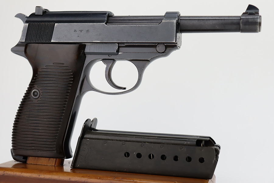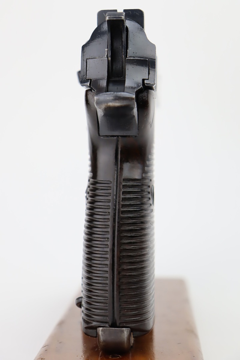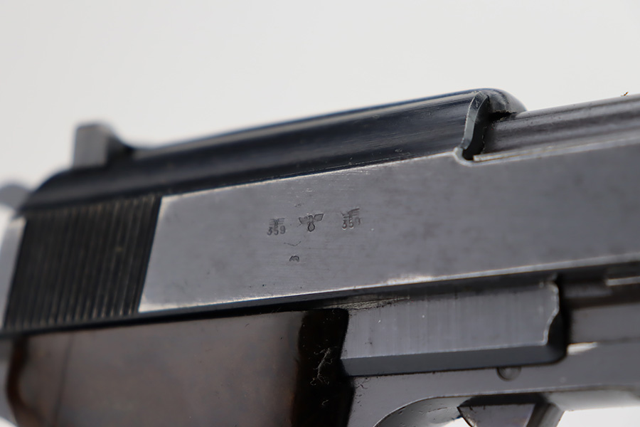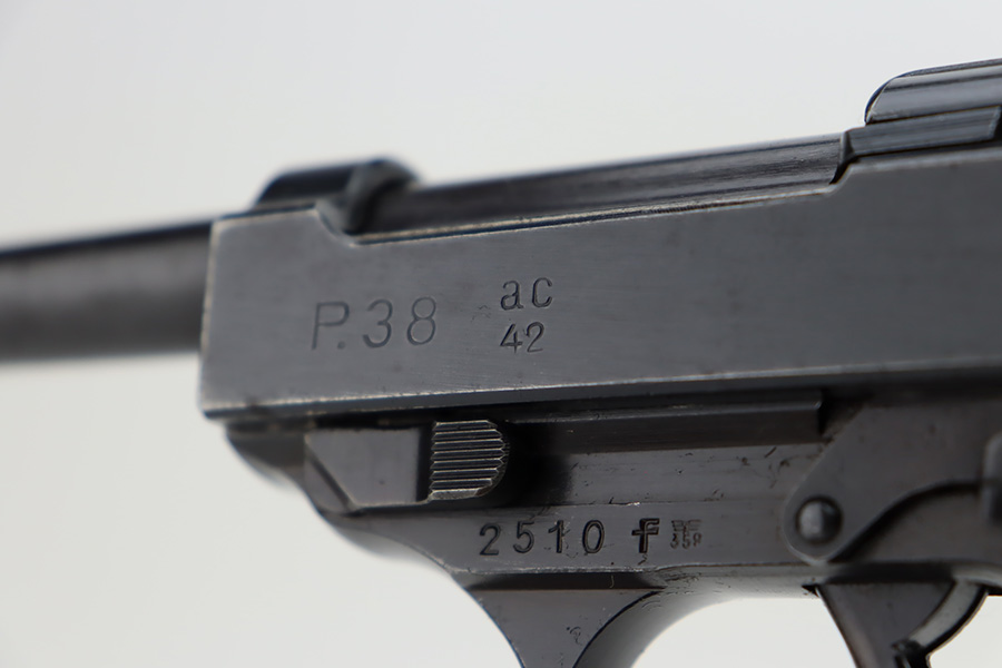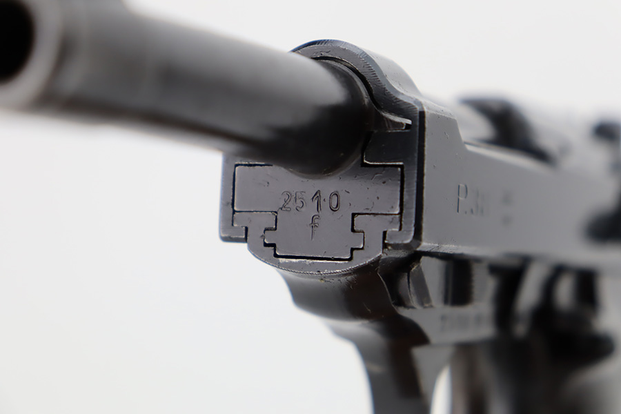 11/6/23 – This is an excellent example of an AC 42 Walther P.38 issued to the Nazi military in 1942. All matching with the proper “Eagle 359” military acceptance proofs throughout. It comes as a rig with a very nice 1944-dated pebble grain holster, one numbered but mismatched magazine, and one post-war magazine. The gun itself has retained about 96% of its original finish with just minor wear around the muzzle and front edges of the slide. Some very light freckling along the barrel and on small spot on the left side of the slide. Fitted with excellent period-correct bakelite grips. Very nice bore with great rifling. De-cocker is functional.